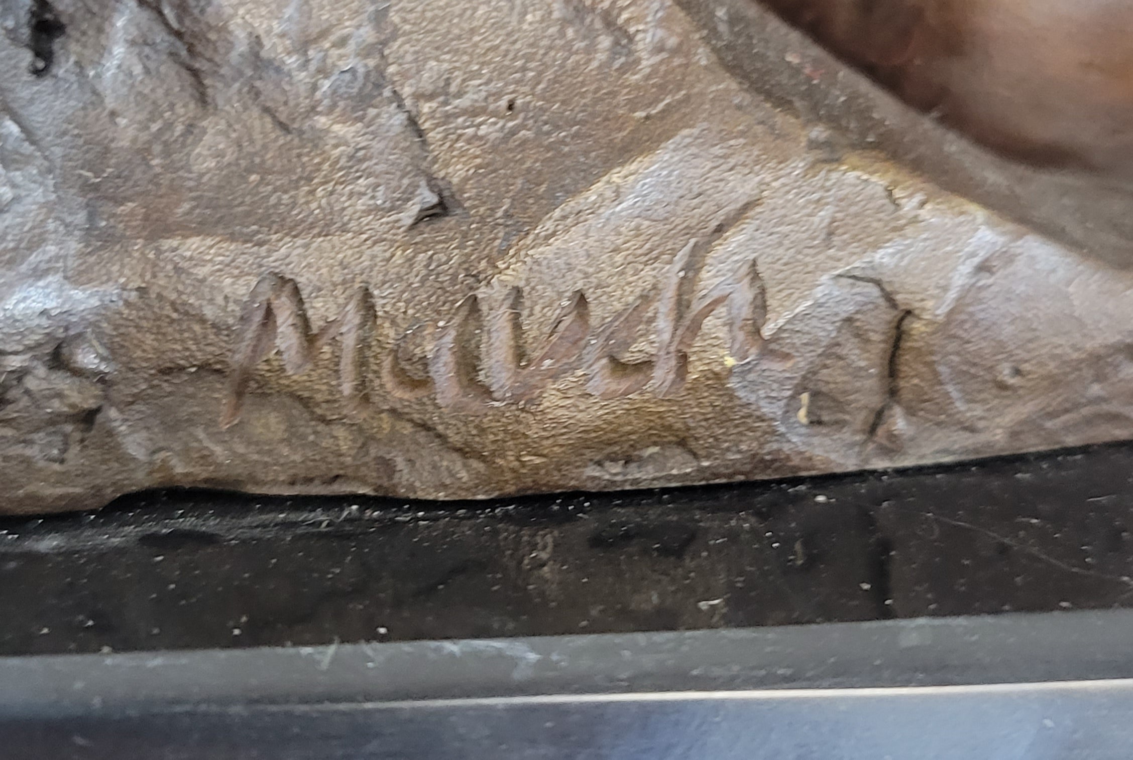 Whether placed in a prominent position in any room of the house or presented as a thoughtful gift, this sculpture invites viewers to appreciate the beauty of the human form and the artistry that goes into creating such a captivating and confident portrayal. The artist's signature, Mavchi, adds a personal touch and authenticity to this exquisite piece.Bronze Dimensions with Marble Base: Height 5" X Width 11.5"