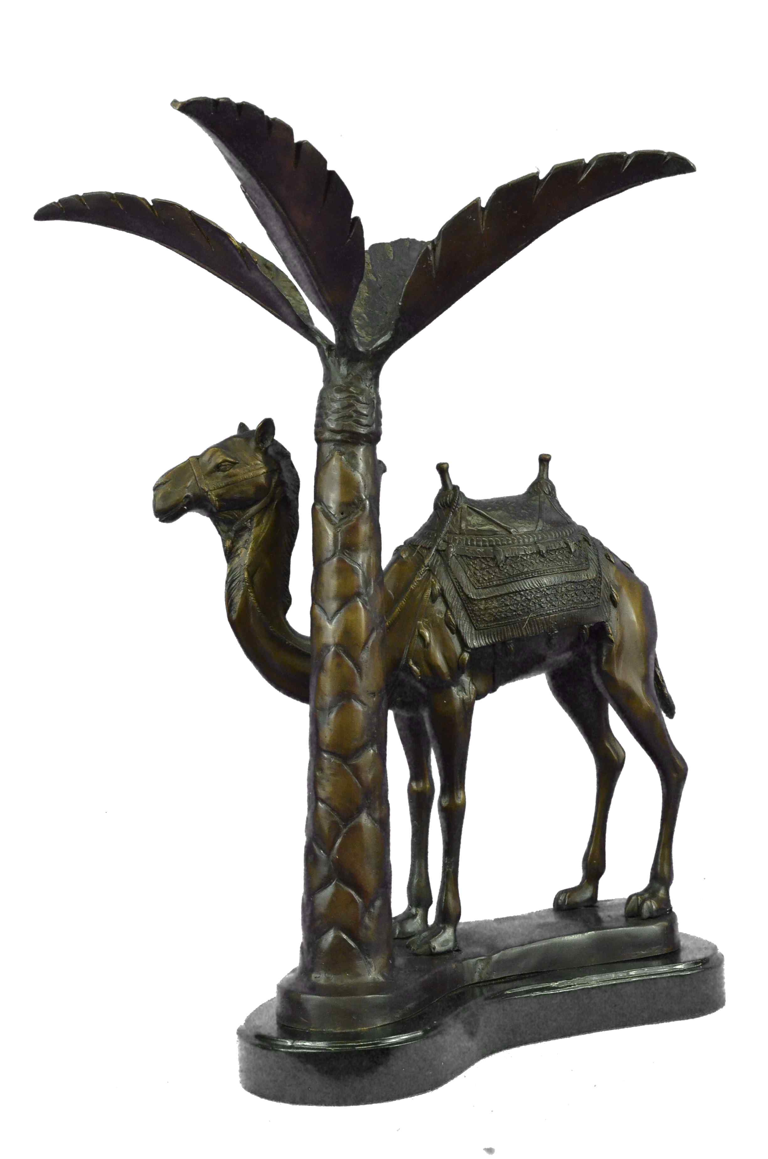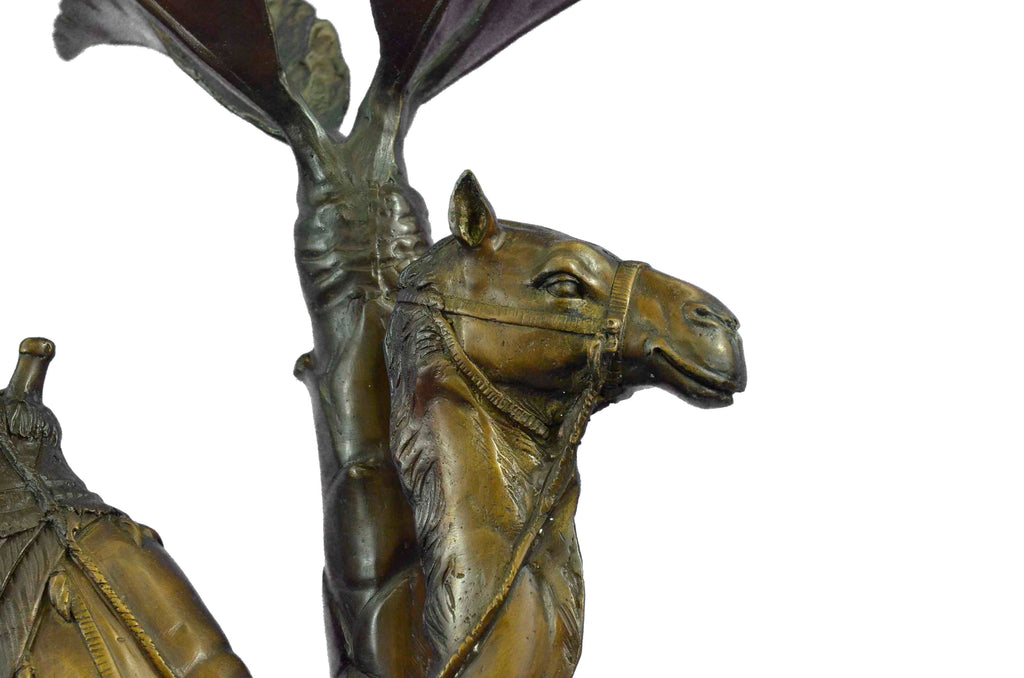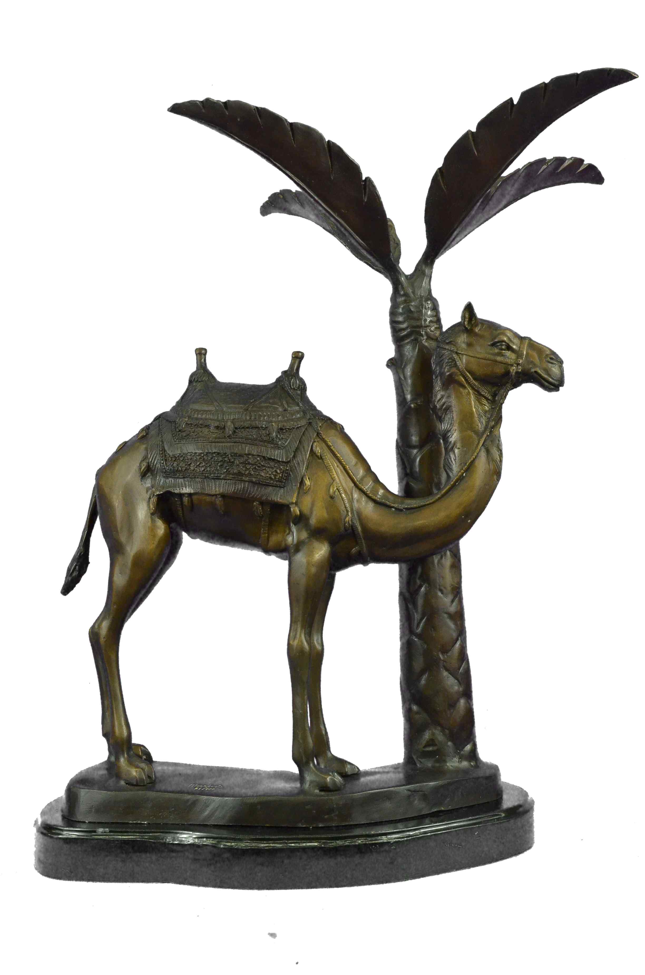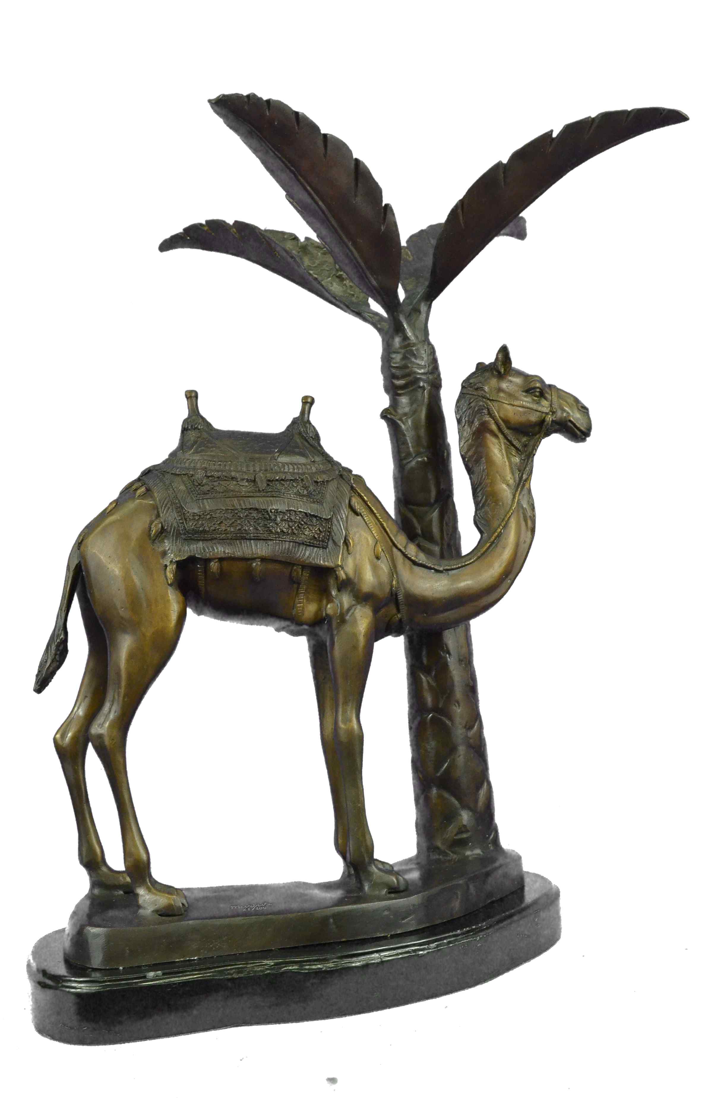 This Statue is of a Camel who stands square, resting for a moment under the shade of a nearby palm tree. He has a saddle on his back that is empty of a traveler, and he waits patiently for their return. The saddle is decorated in three shades and has two peg handles to hold onto on top, the reigns wrapped around the front one hangs loosely. The face and entire piece has immaculate detailing, from the nostrils to the dangling tassels on the saddle. The palm tree is textures on the trunk and reaches up to open leaves that are a silver color and match the fabric on the saddle. His feet rest upon a smooth surface of bronze and marble. This bronze sculpture was casted using the "Lost Wax Method" and has a brown, green and gold Patina.This is a original Limited edition and numbered sculpture and is signed by artist Marius.Original or Reproduction: Original