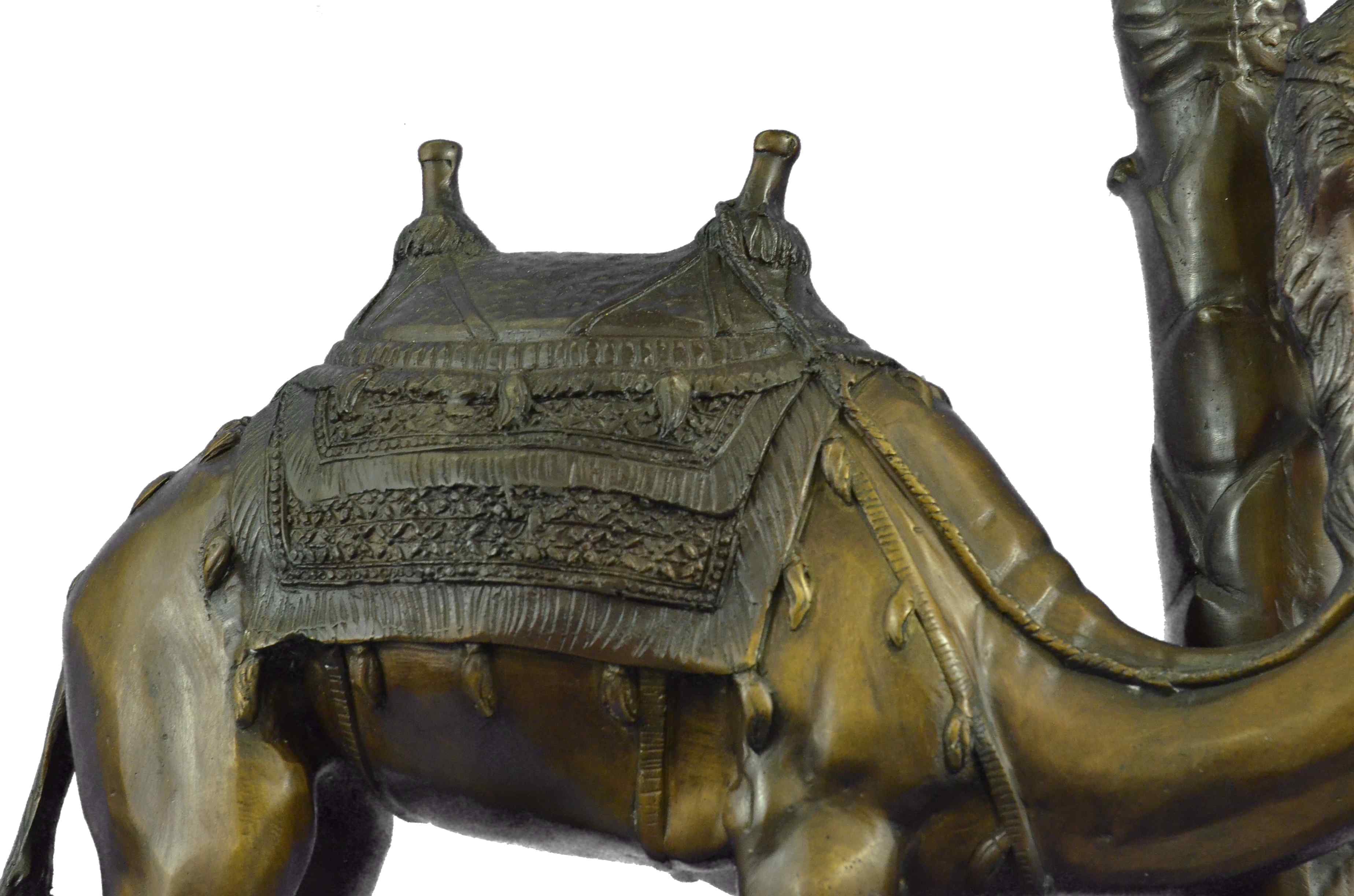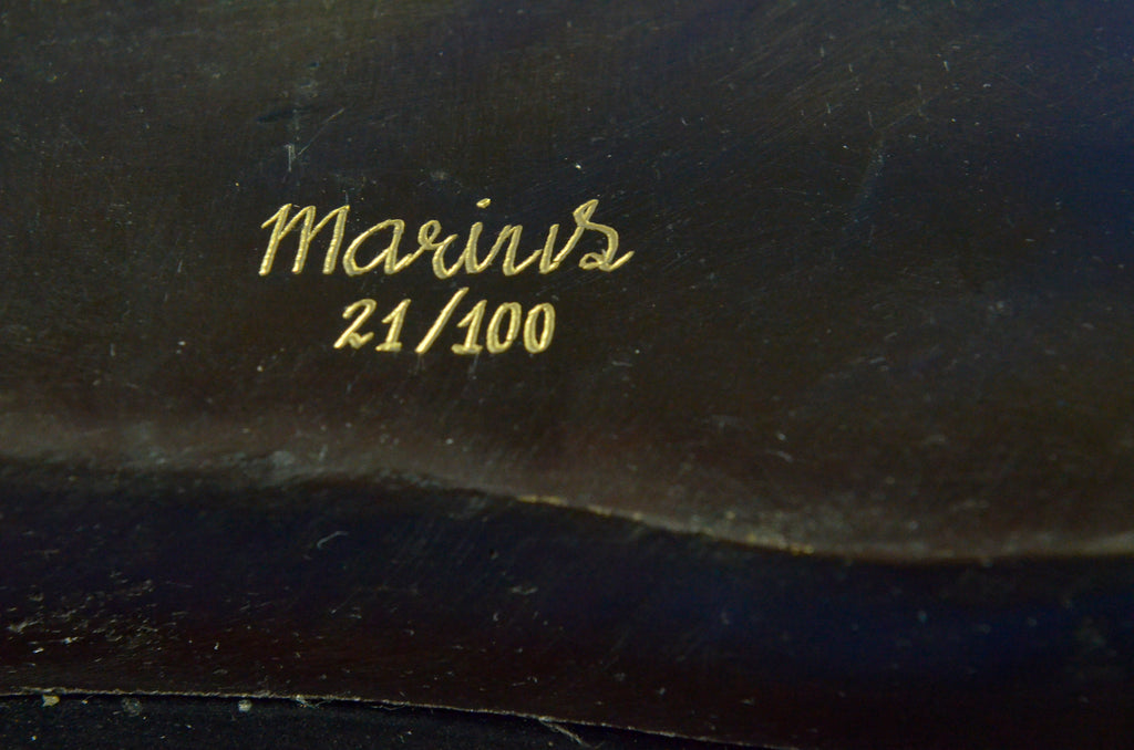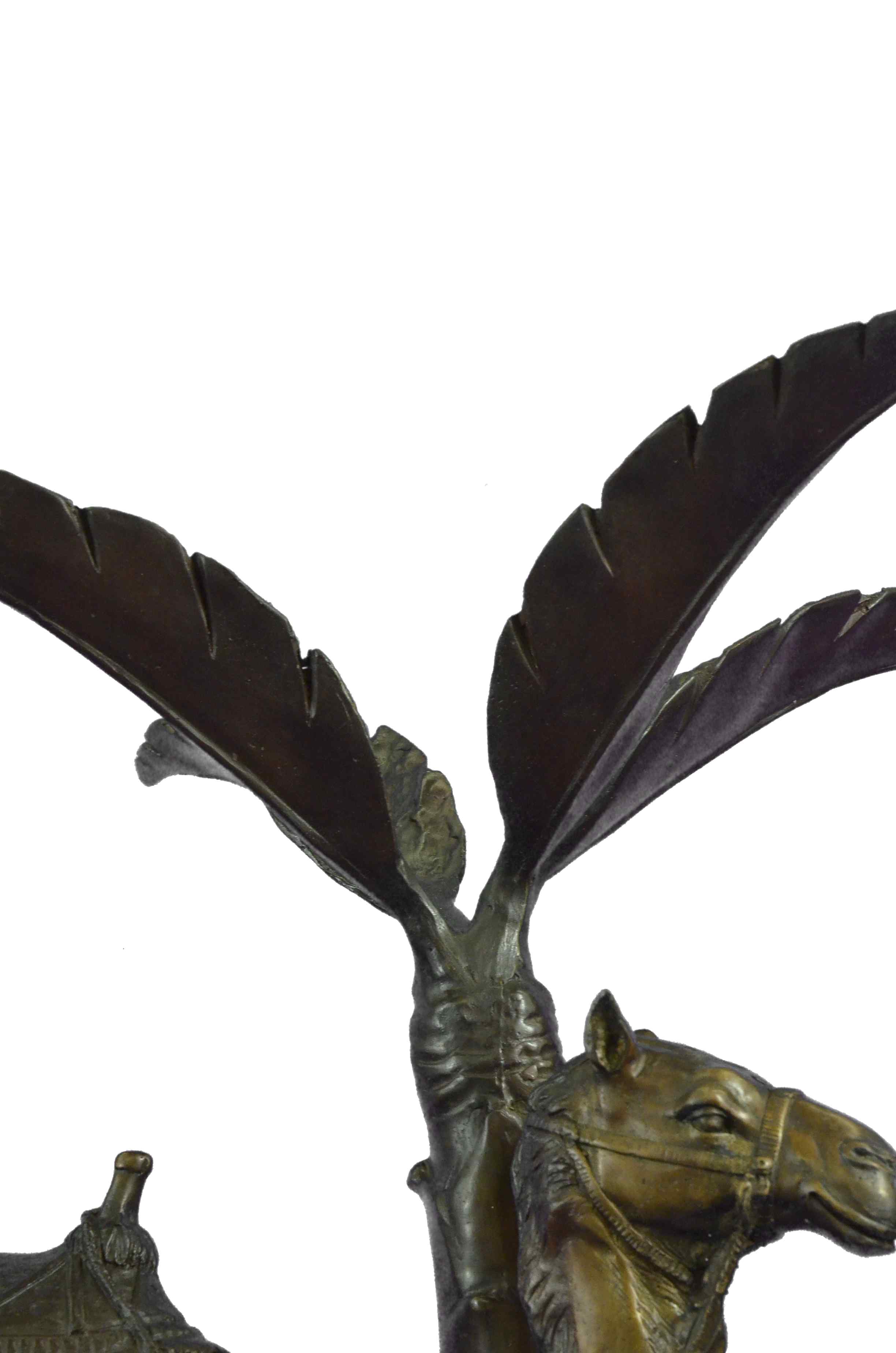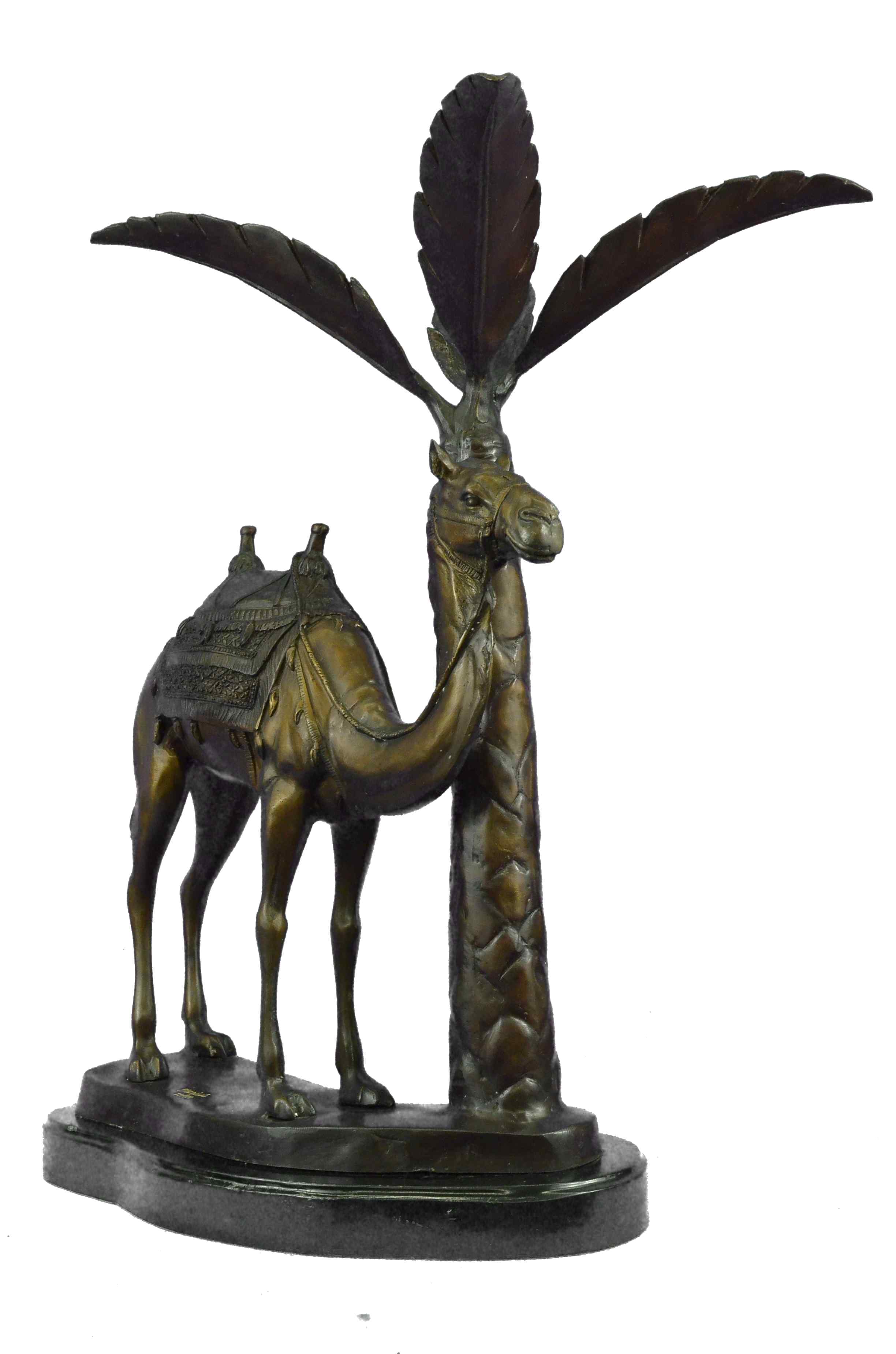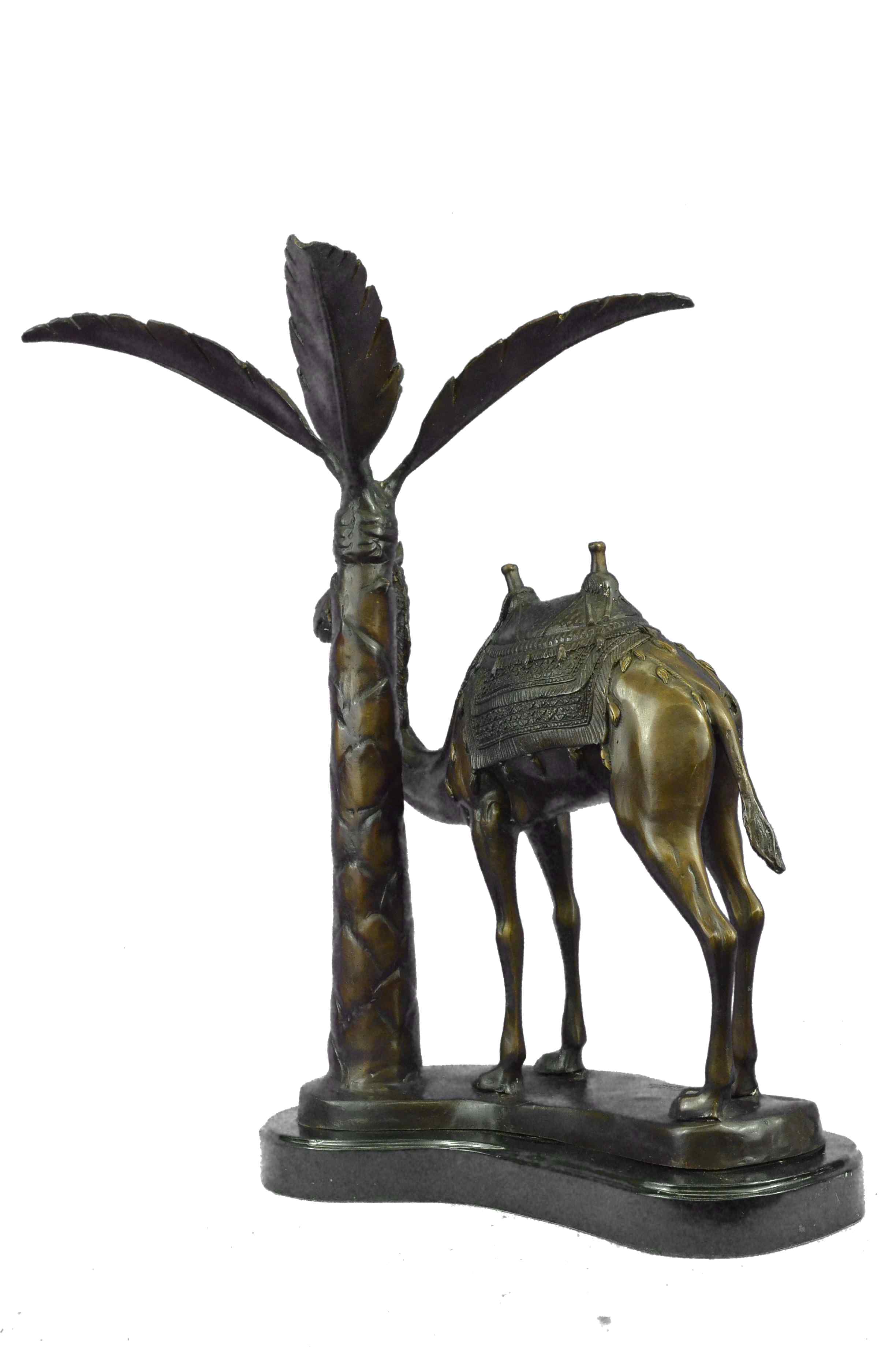 This Statue is of a Camel who stands square, resting for a moment under the shade of a nearby palm tree. He has a saddle on his back that is empty of a traveler, and he waits patiently for their return. The saddle is decorated in three shades and has two peg handles to hold onto on top, the reigns wrapped around the front one hangs loosely. The face and entire piece has immaculate detailing, from the nostrils to the dangling tassels on the saddle. The palm tree is textures on the trunk and reaches up to open leaves that are a silver color and match the fabric on the saddle. His feet rest upon a smooth surface of bronze and marble. This bronze sculpture was casted using the "Lost Wax Method" and has a brown, green and gold Patina.This is a original Limited edition and numbered sculpture and is signed by artist Marius.Original or Reproduction: Original