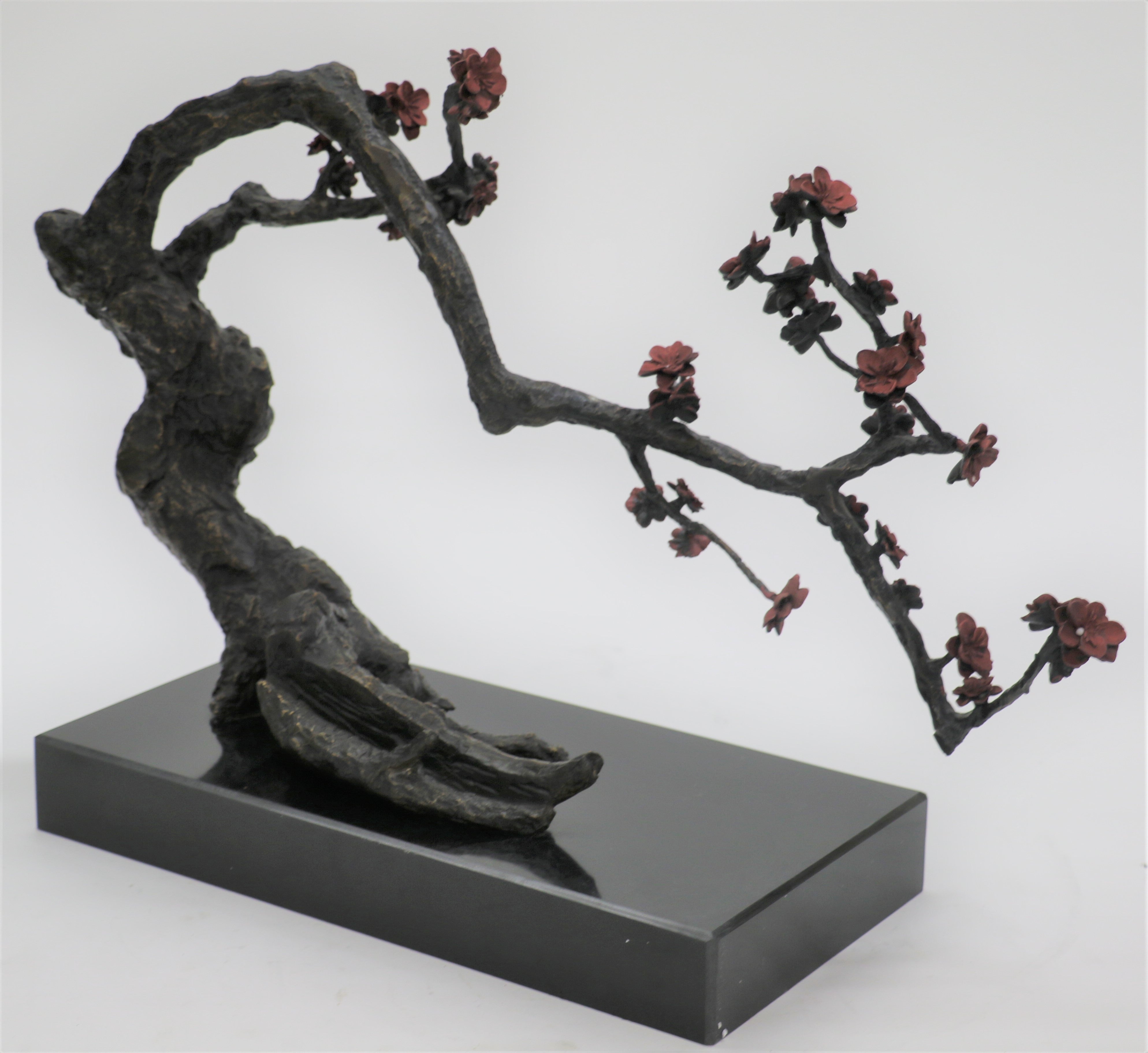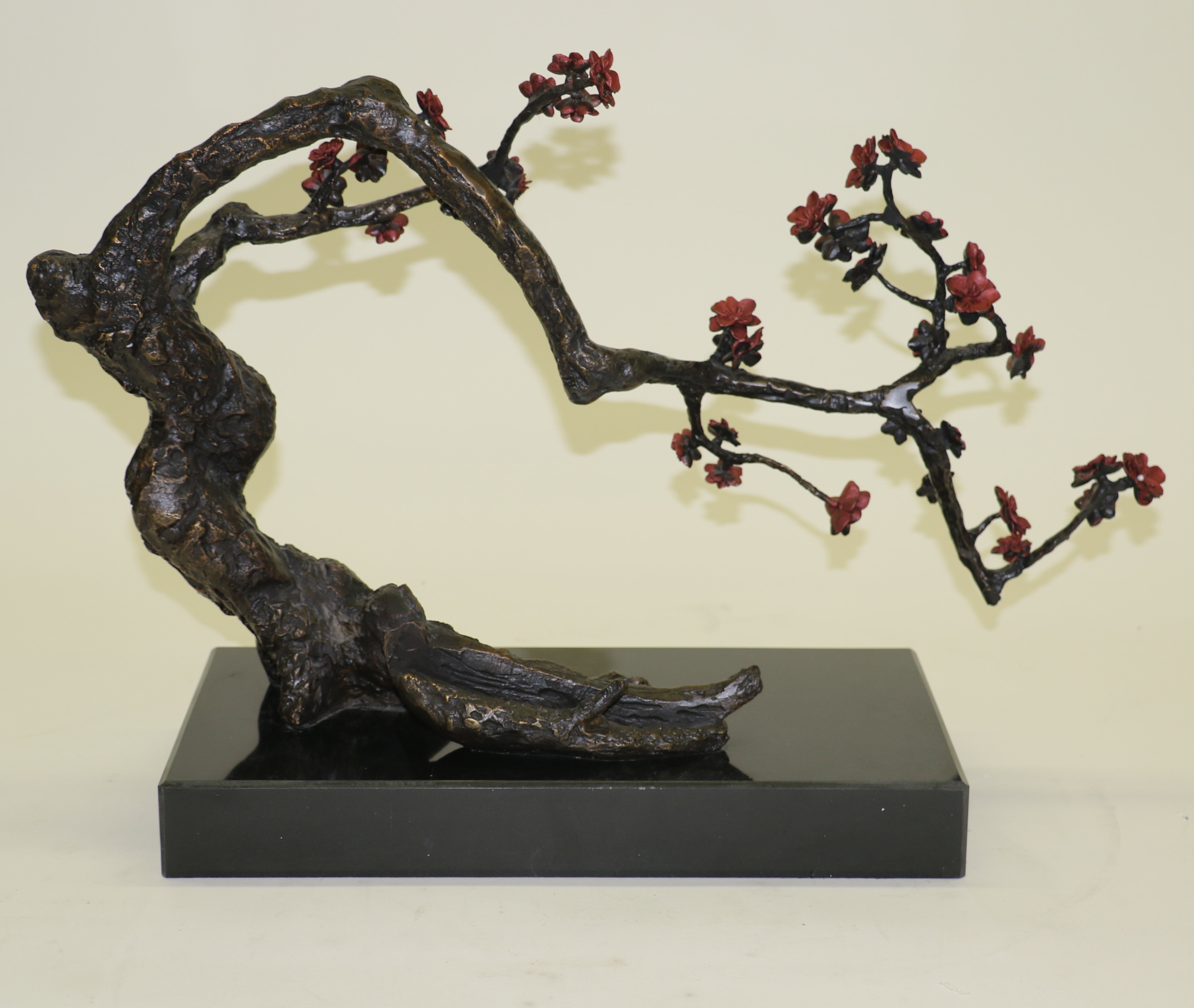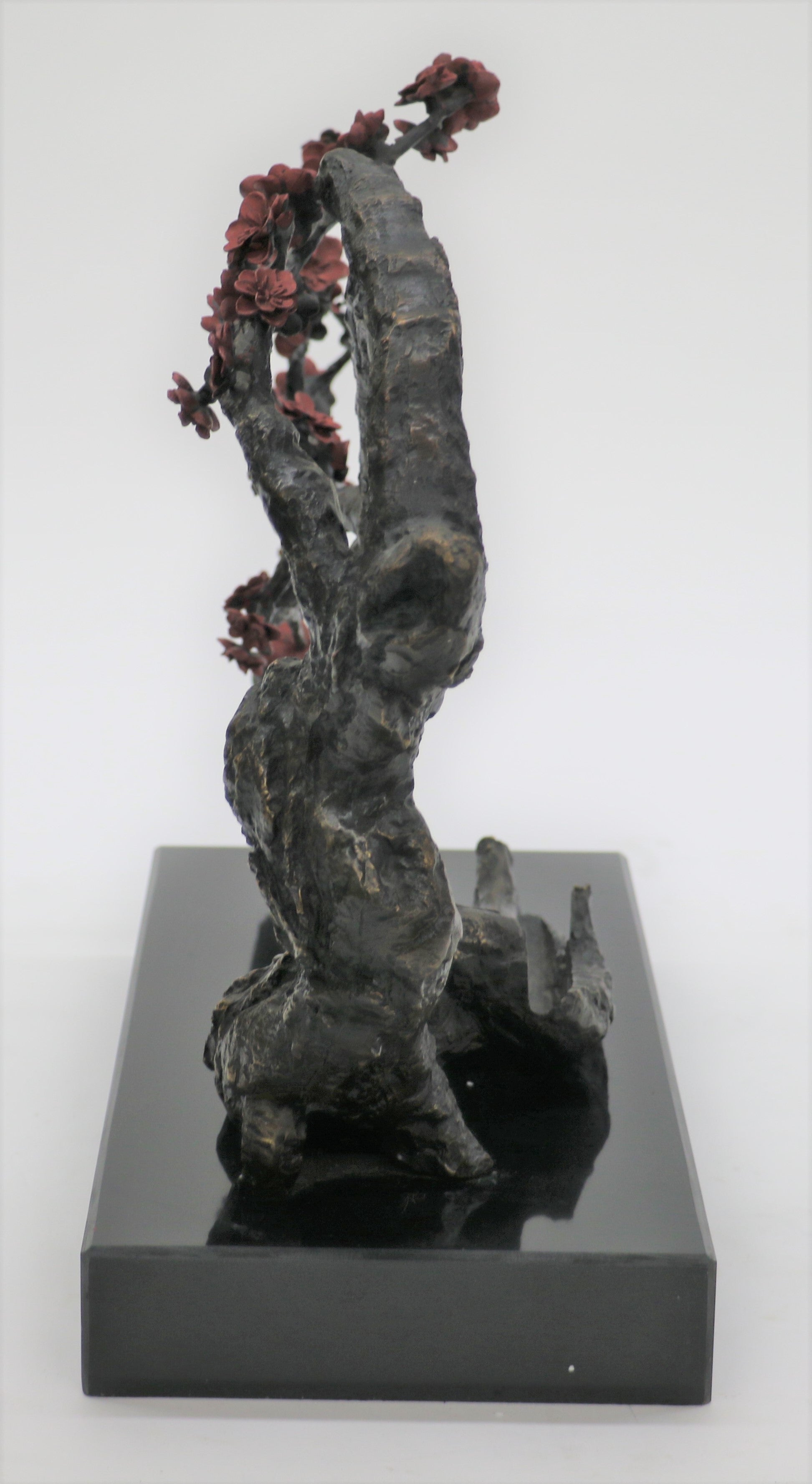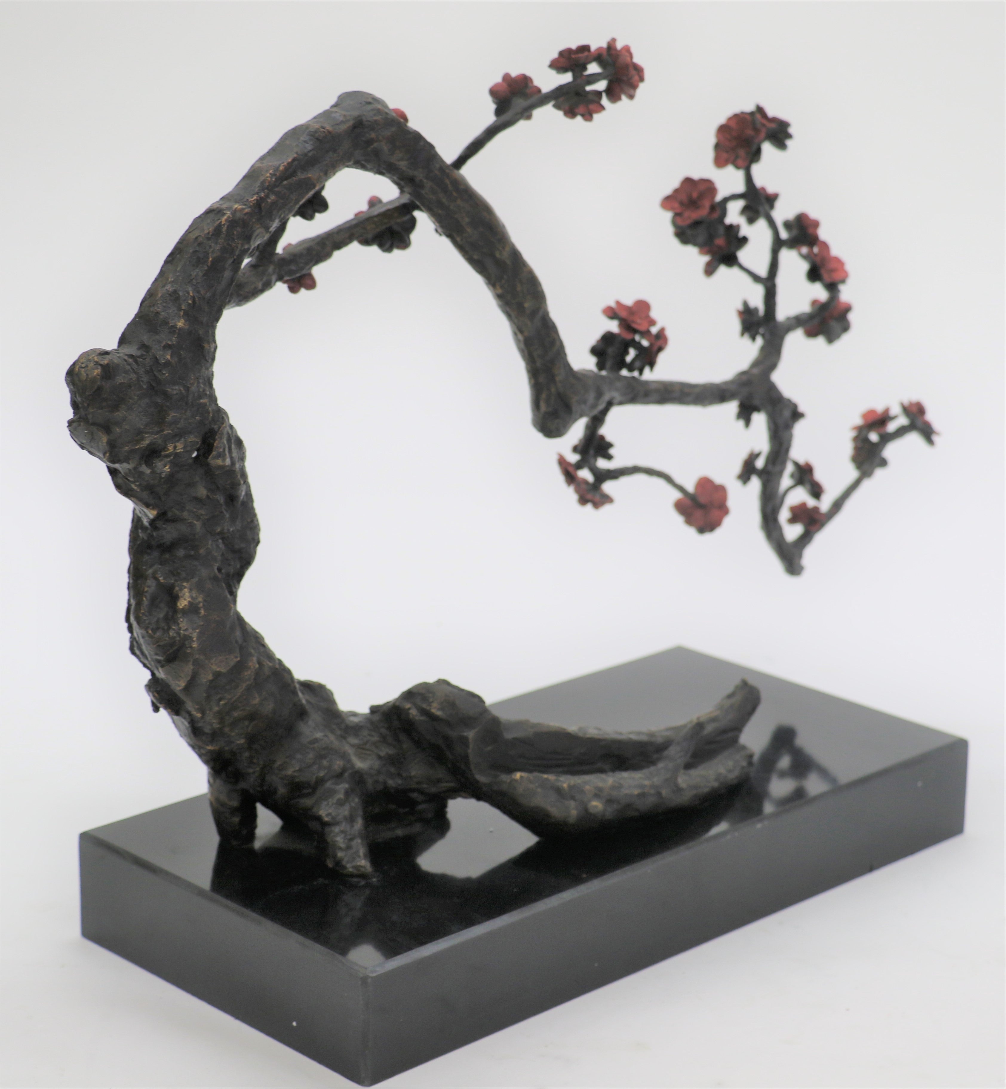 This Limited Edition immortal Wisdom Tree, deeply rooted into the springs of eternity, has flourished for centuries. In our sculptural interpretation, Bronze branches reach towards the sky while vines extend deep into the soil below. Uniting heaven and earth, the Wisdom Tree represents an individual's journey to infinity. The handmade bronze sculpture was cast using the archaic method of lost-wax casting and stained with a brown and Red patina finish for perpetuation. He is mounted upon a black marble base and is signed and numbered by artist Aldo Vitaleh.Bronze Dimensions with Marble Base:Height 16.5" x Width 24"