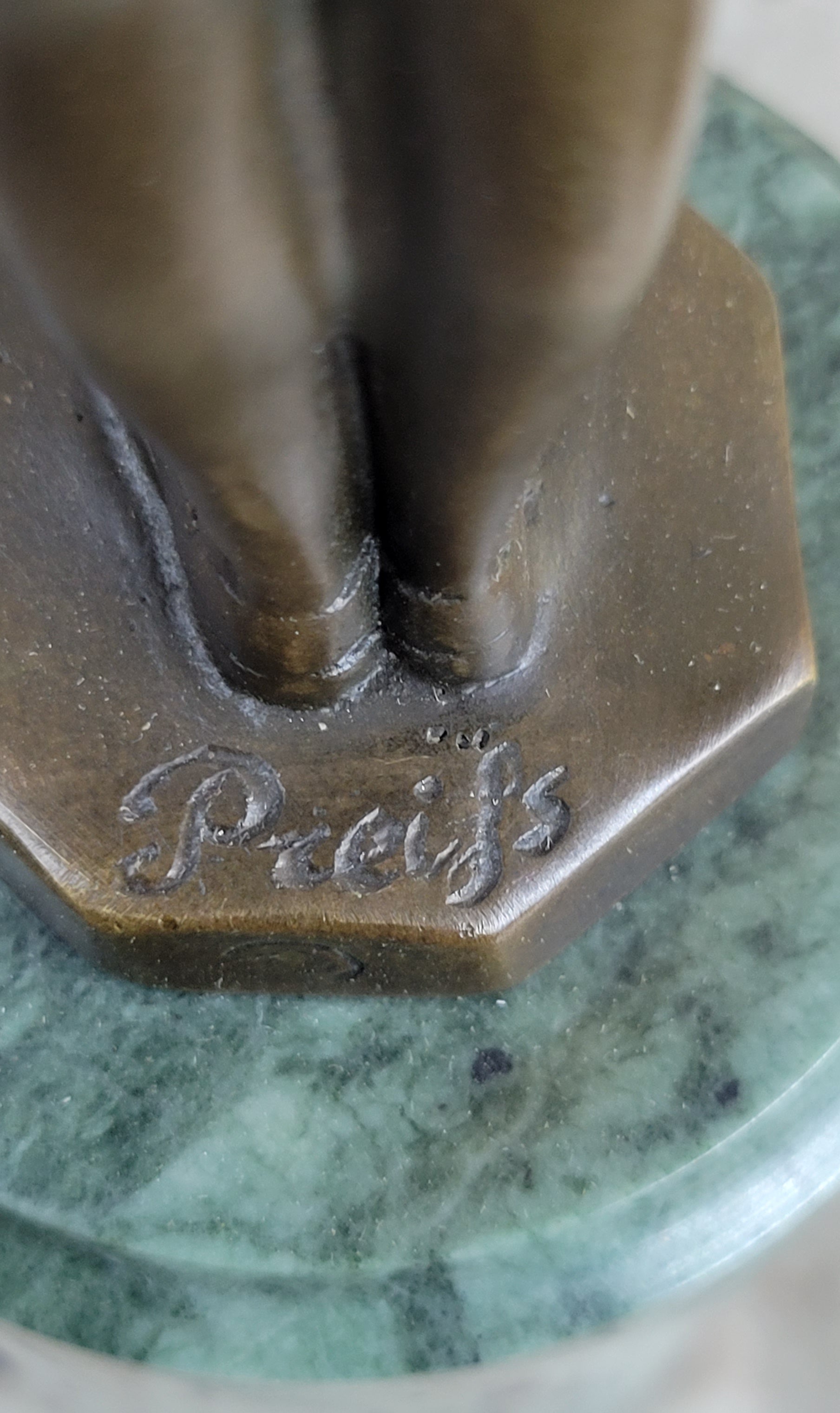 Meticulously crafted with precision and artistry, this bronze masterpiece is a testament to the skillful implementation of the "Lost Wax Method." Every detail, from the girl's expressive posture to the intricacies of the fish, is brought to life with authenticity. The sculpture is 100% bronze, emphasizing its enduring quality and handcrafted nature. Mounted on a marble base, the piece not only celebrates the joy of childhood but also stands as a testament to the timeless artistry embodied by the signature of the artist, Preiss.