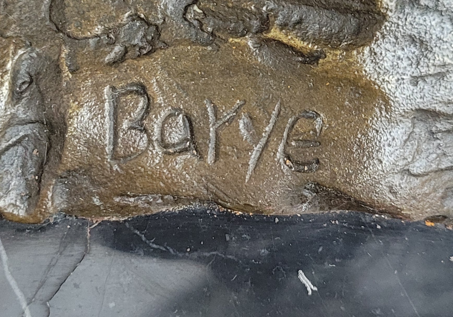This timeless piece, signed by Barye, is a collector’s treasure, perfect for wildlife enthusiasts or art collectors seeking a work that embodies both artistic excellence and the raw beauty of nature. Its impressive craftsmanship and historical significance make it a striking centerpiece for any home or office.Bronze Dimensions with Marble Base: Height 16.5" X Width 23"
