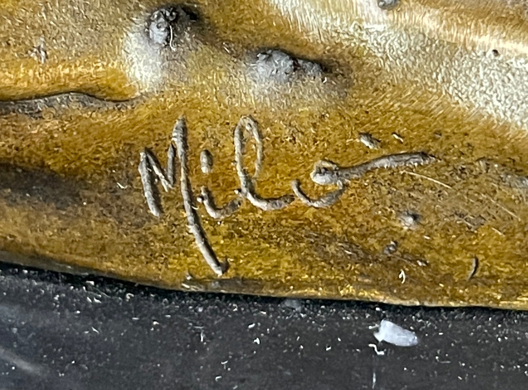 Crafted with meticulous care, this handmade bronze sculpture employs the age-old method of lost-wax casting, a traditional technique that ensures intricate details are faithfully preserved. The brown patina finish not only adds depth and texture to the sculpture but also serves as a means of conservation, protecting the art for generations to come. Mounted upon a black marble base, the sculpture gains a sense of permanence and elegance, grounding the lions in the earthly realm. The artist's signature, Milo, adds a personal touch and attests to the authenticity of this captivating piece, making it a cherished symbol of strength and grace.Bronze Dimensions with Marble Base: Height 10" X Width 25"