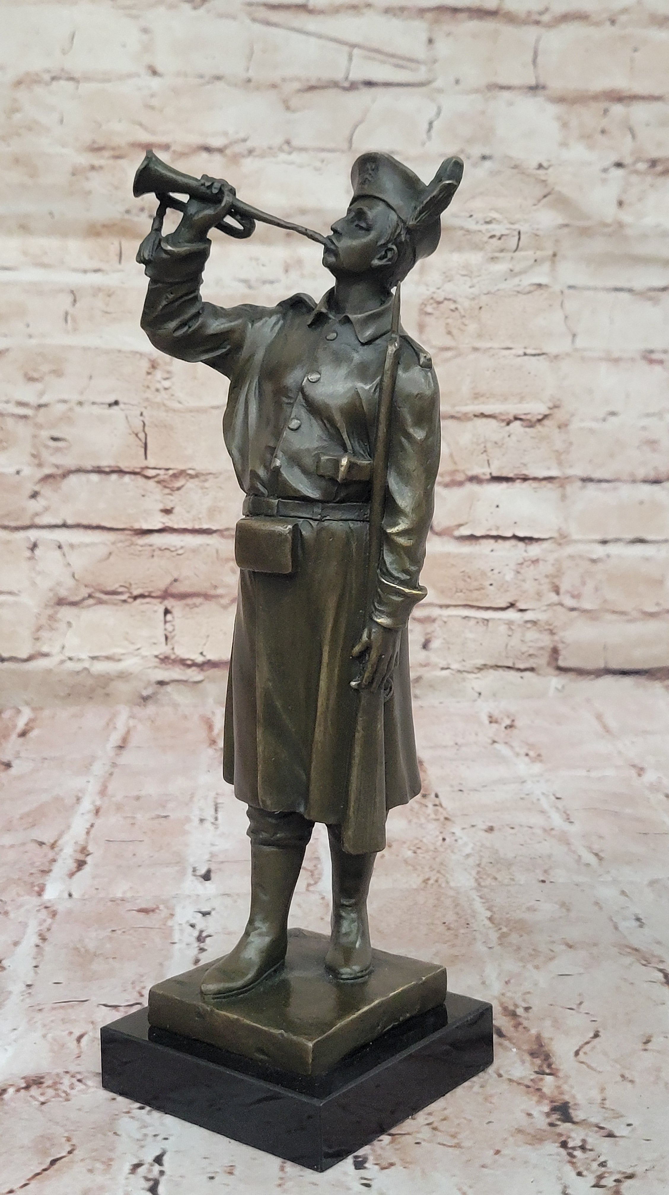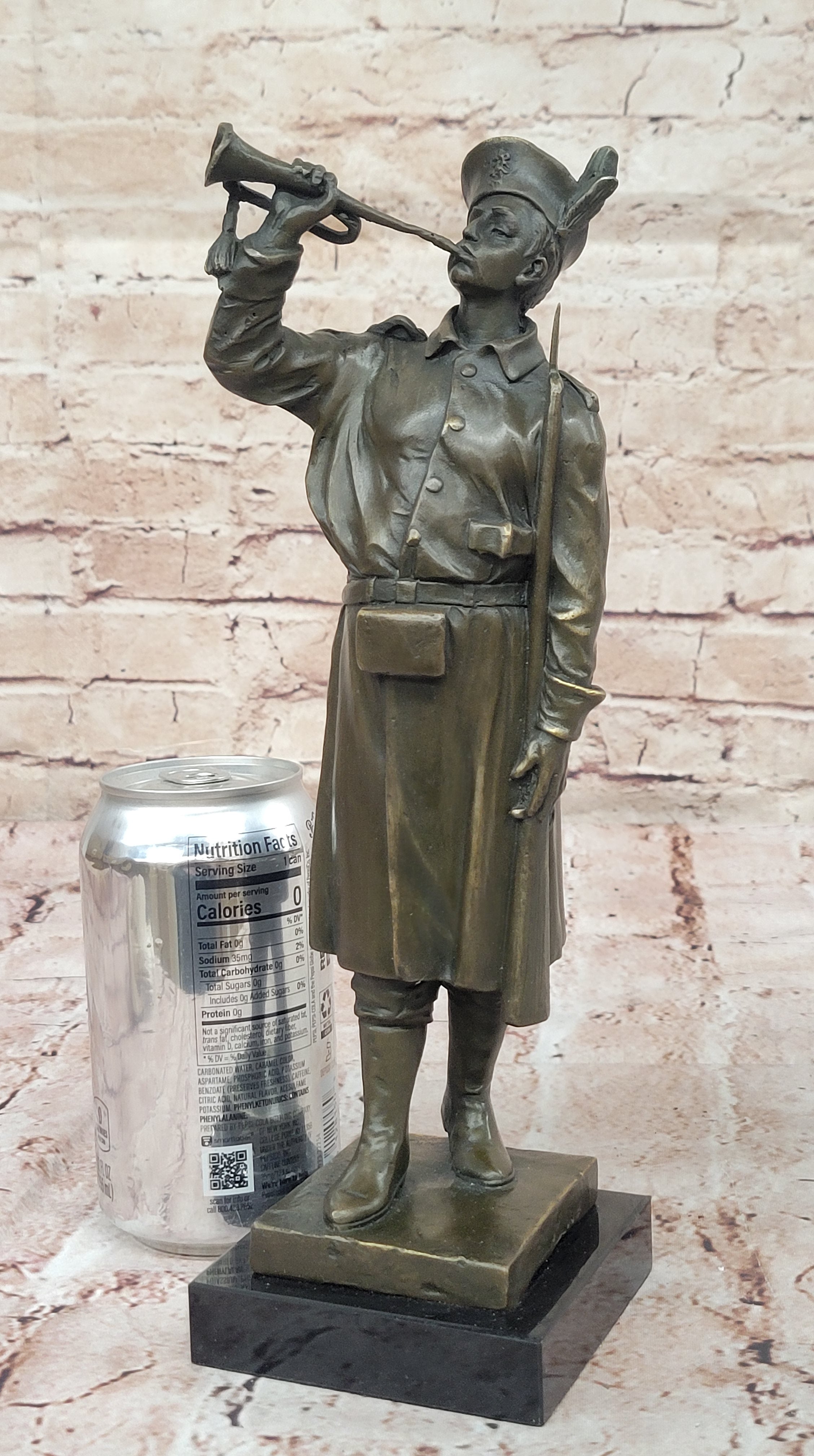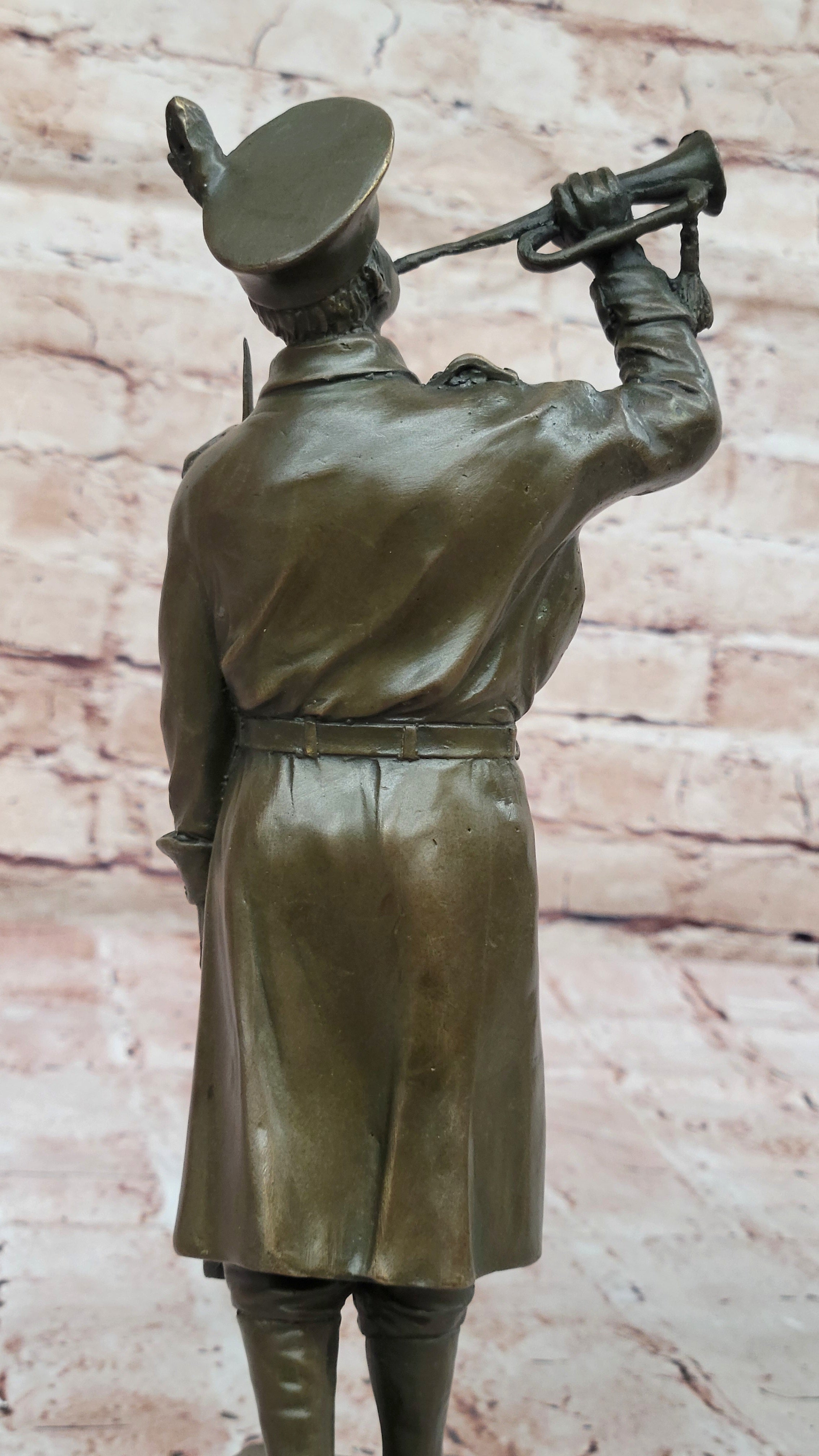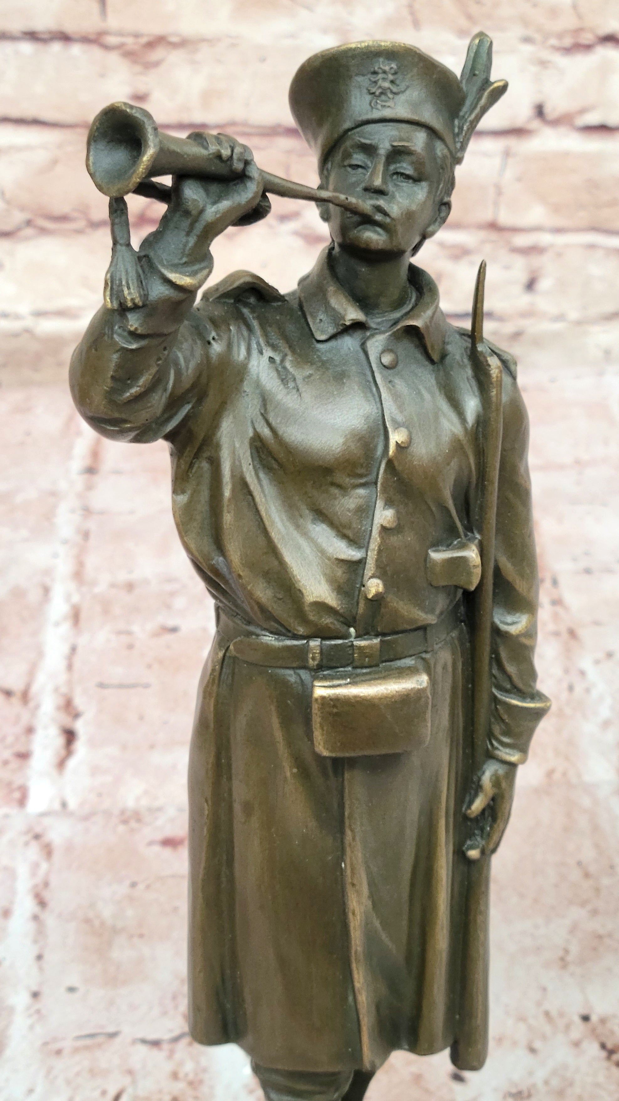 Military Soldier with Bugle Bronze Statue on Marble Base - Vintage Army Trumpeter Figurine
