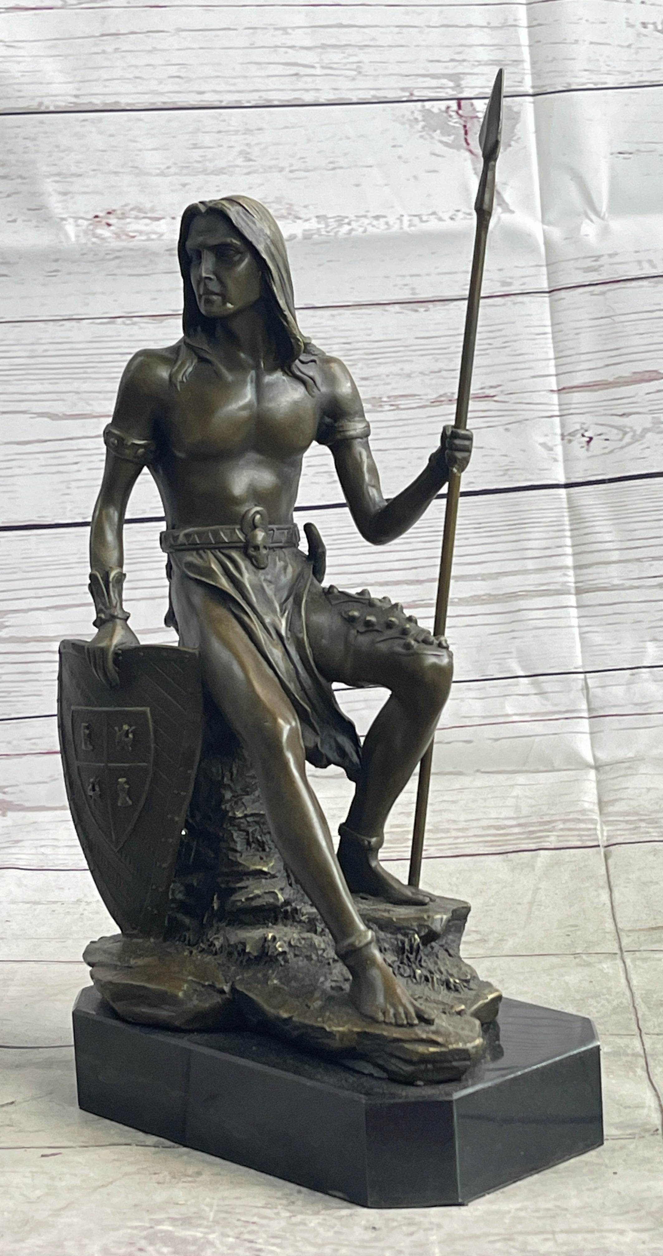 Muscular Warrior Barbarian Soldier w/ Shield & Spear Bronze Sculpture Statue Figure Marble Base