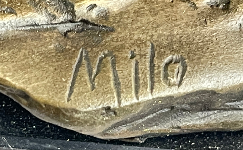 Crafted through the intricate lost wax method, this sculpture bears the signature of the artist Milo, a mark of the skilled hands that brought this powerful representation to life. Milo's attention to detail and mastery of the medium breathe life into the warrior's form, allowing viewers to connect with the spirit and history encapsulated within this striking piece of art.Bronze Dimensions with Marble Base: Height 12" X Width 8"