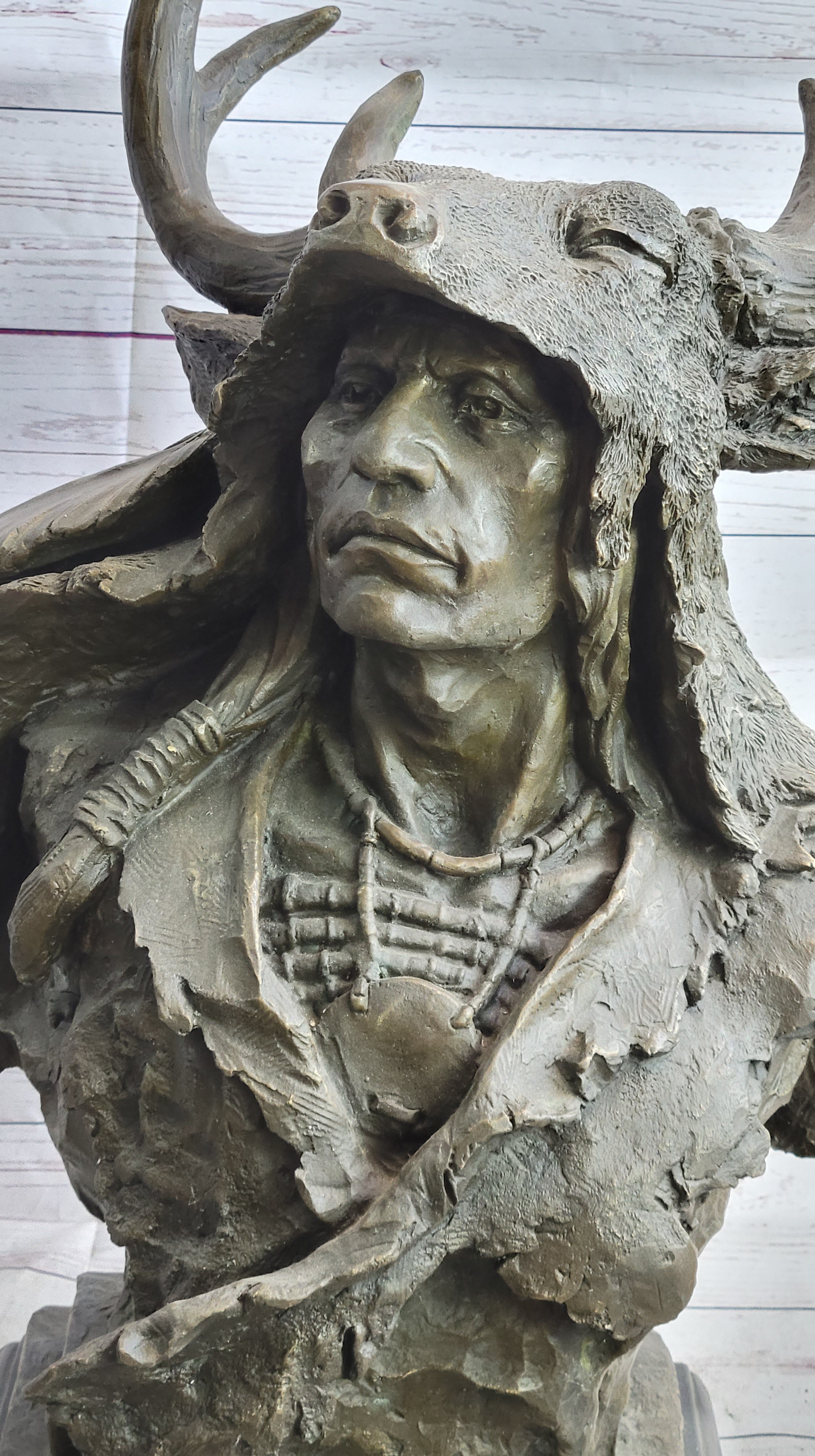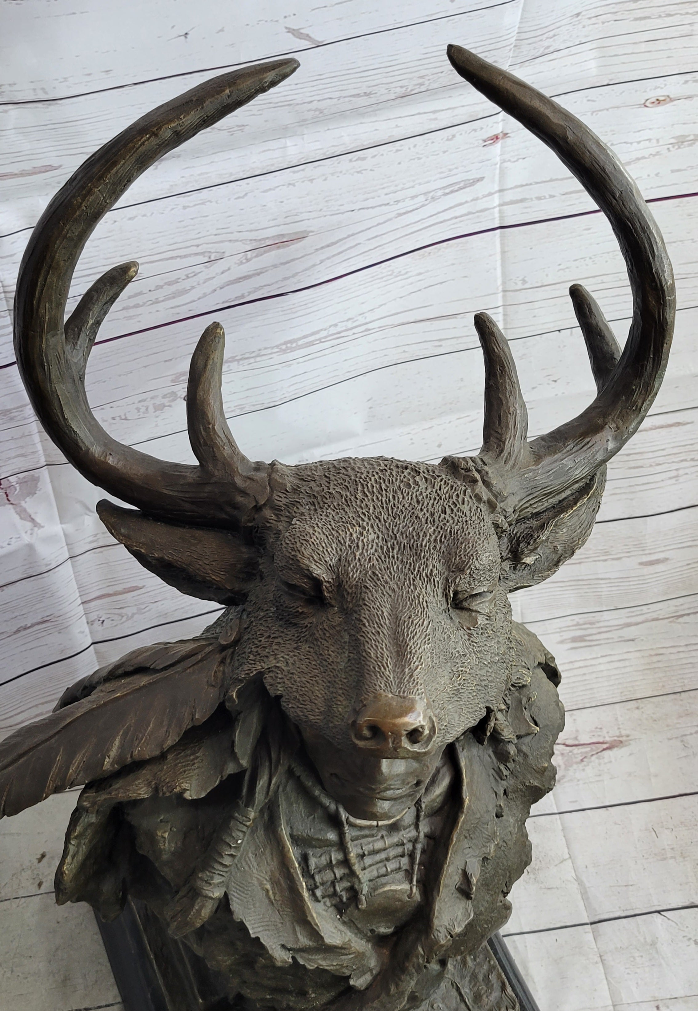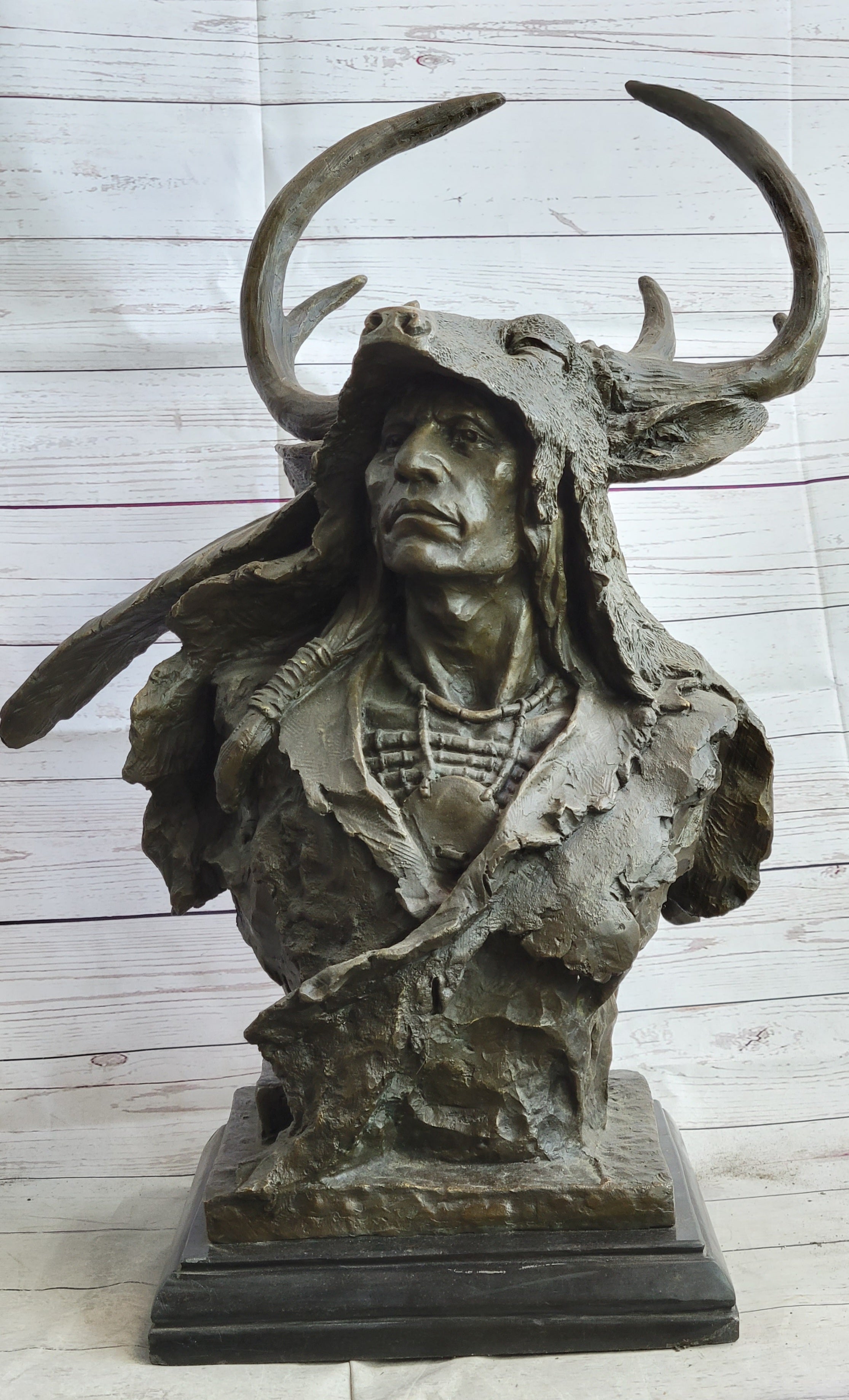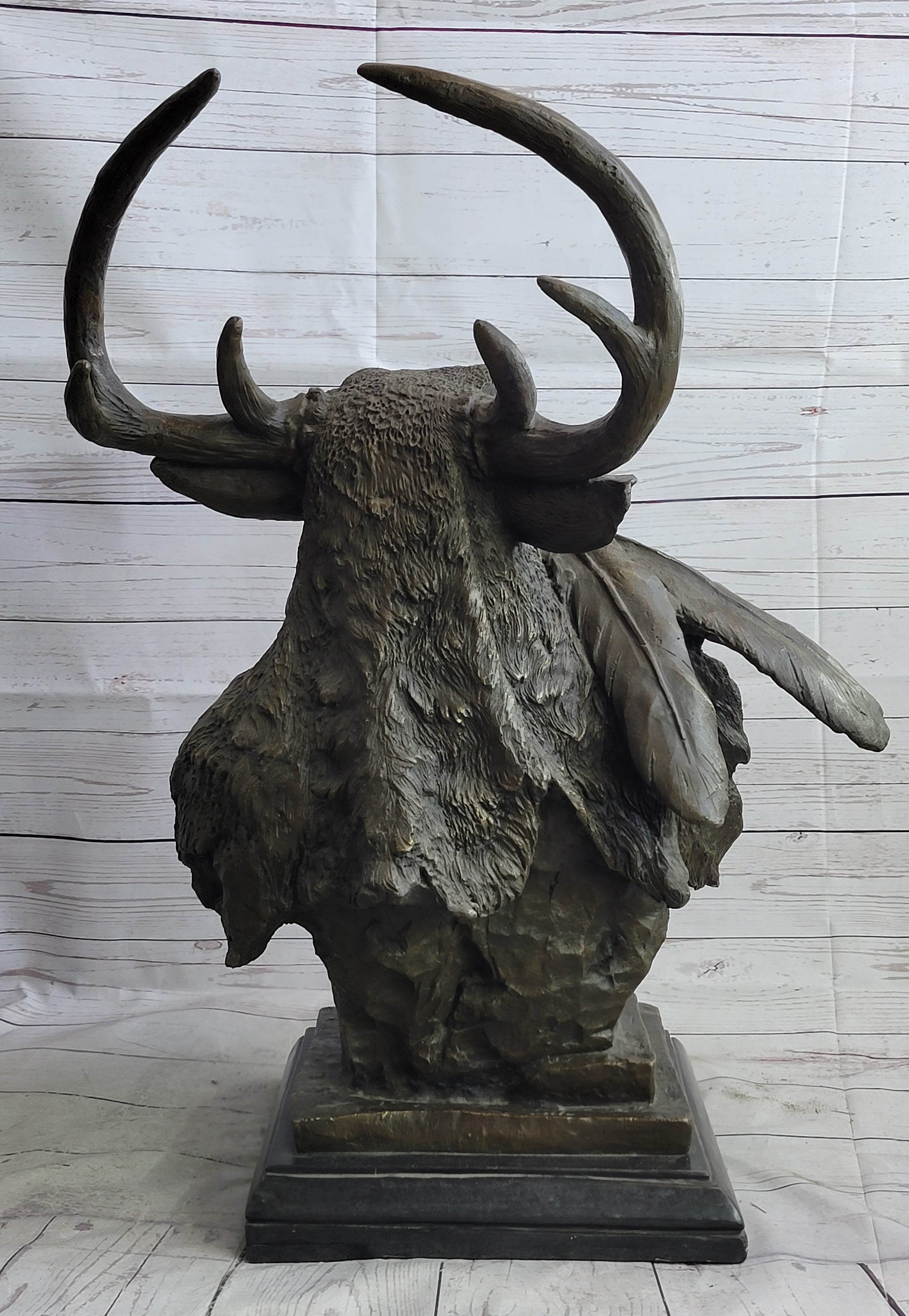 Native American Indian Chief in Antler Headdress Bronze Statue Sculpture Decor on Marble Base