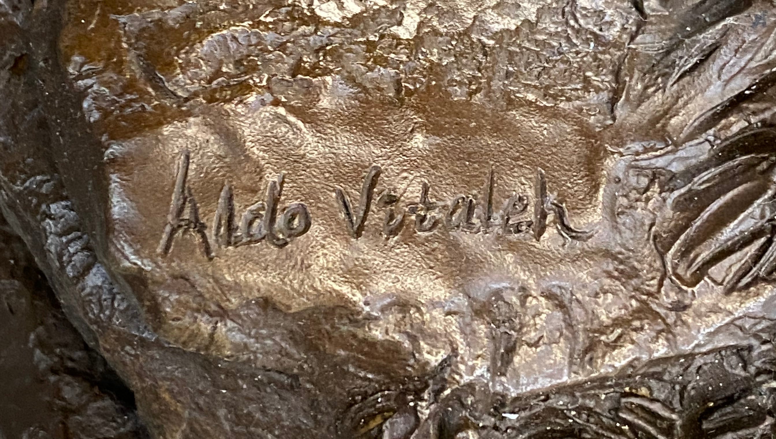 This sculpture features a man and his horse. He has his head completely down and it appears to be that he has fallen asleep. Now this is often stage for horse riders, because they are usually on point when it comes to being a look out. He has his left hand in his pocket. The stallion he rides is beyond belief beautiful and real strong, he slowly rides his owner to sleep. The handmade bronze sculpture was cast using the early method of lost-wax casting and stained with a brown patina finish for conservation. It is mounted upon a black marble base with the European Bronze Finery stamp of quality and is signed Aldo Vitaleh.Bronze Dimensions with Marble Base:Height 21" x Width 19"
