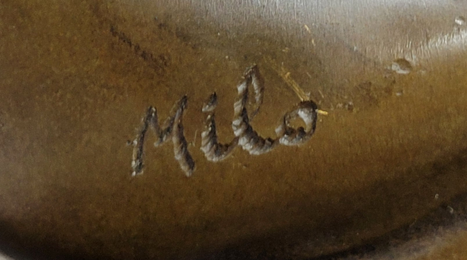 Signed by the celebrated artist Milo, this remarkable piece stands as a testament to the artist's unwavering commitment to capturing the delicate nuances of human emotion and form. It serves as an alluring testament to the enduring legacy of artistic expression, inviting viewers to appreciate the profound beauty and artistry embodied within this stunning sculpture.Bronze Dimensions with Marble Base: Height 11" X Width 4.5"