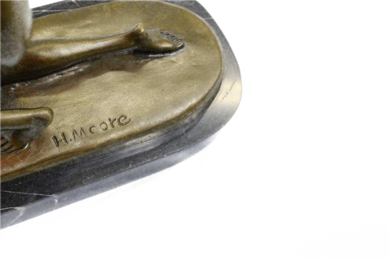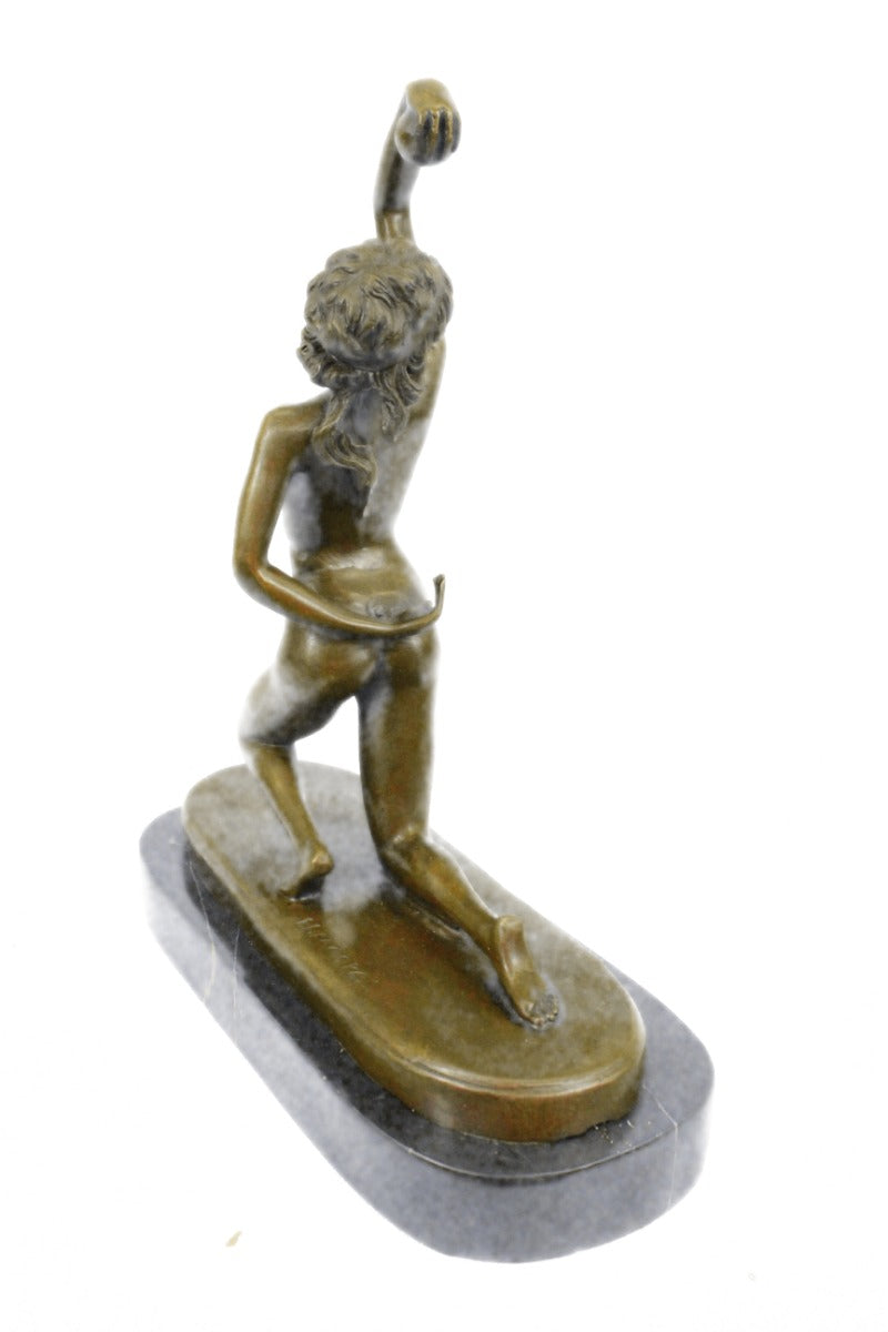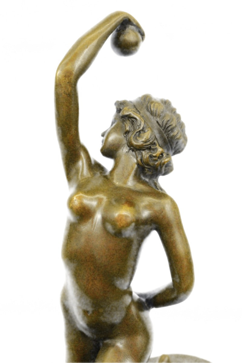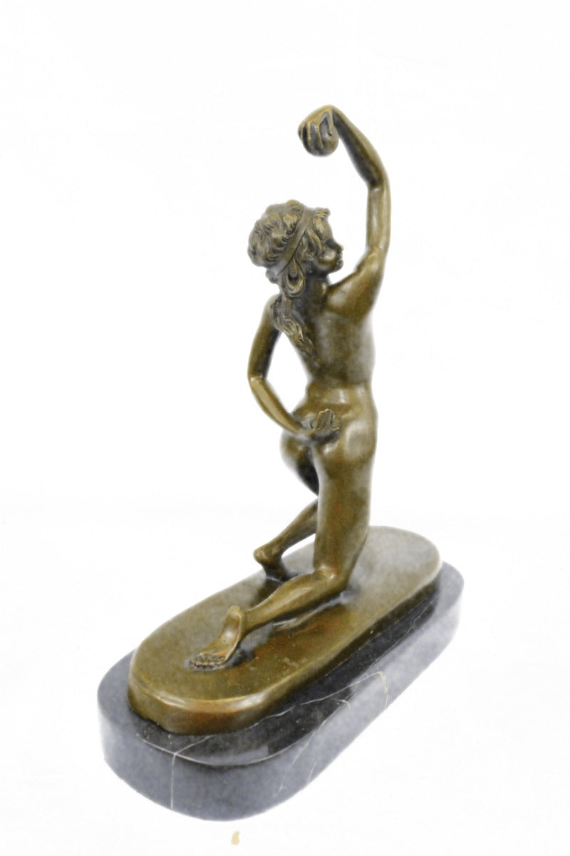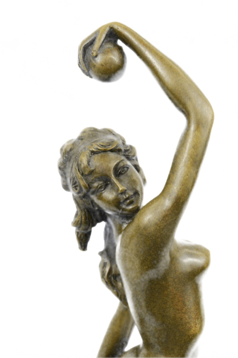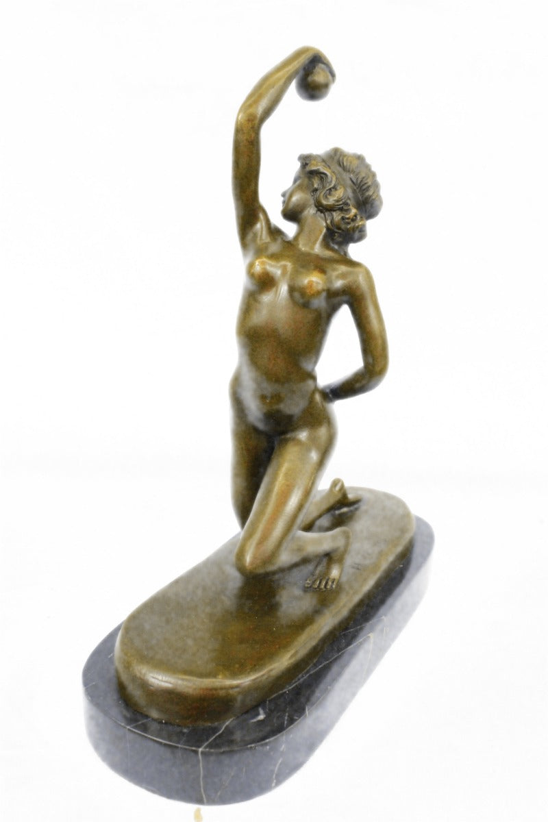SHE IS AN ARTIST`S MUSE. SHE POSES FOR A PAINTING IN THE BUFF BEFORE HIS EASEL. SHE IS COMFORTABLE IN HER NATURAL STATE AND BEING THE INSPIRATION FOR THE STROKES OF HIS PAINTBRUSH. SHE KNEELS BEFORE HIM AND CURVES HER ARM OVER HER HEAD, HOLDING EDEN`S SEDUCTIVE APPLE IN HER FIST. SHE SEEMS TO ALSO BE SHOWING OFF HER BICEPS. SHE HAS A TINY FRAME BUT CURVY HIPS AND THIGHS. CAREFUL ATTENTION WAS PAID TO DETAIL. YOU CAN SEE THE LINES OF HER ABS AS HER BODY EXTENDS AND EVEN THE CURVE OF HER FOOT BEHIND HER. SHE SMILES BACK AT HIM PLAYFULLY. FUN. SEXY. FLIRTATIOUS. CONFIDENT. 100% BRONZE AND HANDMADE, THIS BROWN PATINA SCULPTURE WAS CAST USING THE "LOST WAX METHOD" AND MOUNTED ON A BLACK MARBLE BASE AND ISBRONZE DIMENSIONS WITH MARBLE BASE:HEIGHT 12" X WIDTH 10"
