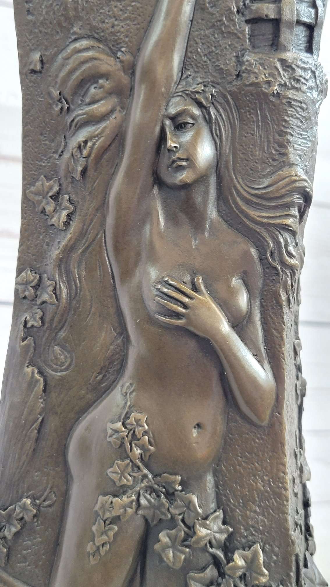 This stunning bronze vase is a versatile piece that blends functionality and artistry. It features exquisite bas-relief sculptures of nude women and climbing vines that wrap around the sides of the vase. The first woman, with her hair cascading over her shoulders, appears relaxed and at ease as the vines envelop her body. The second woman, with her grief-stricken expression and cupped breasts, adds a poignant touch to the design.