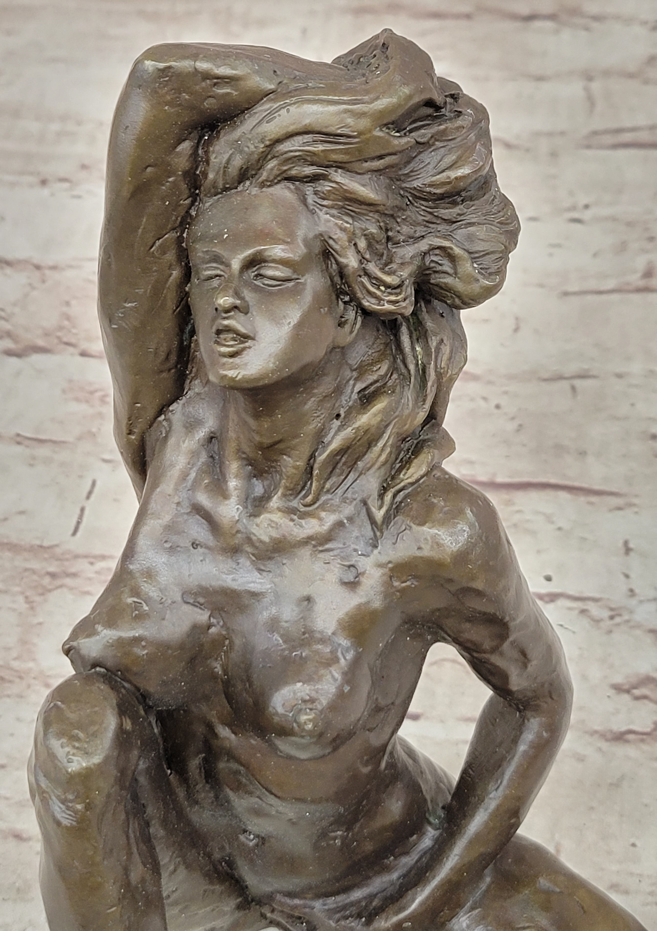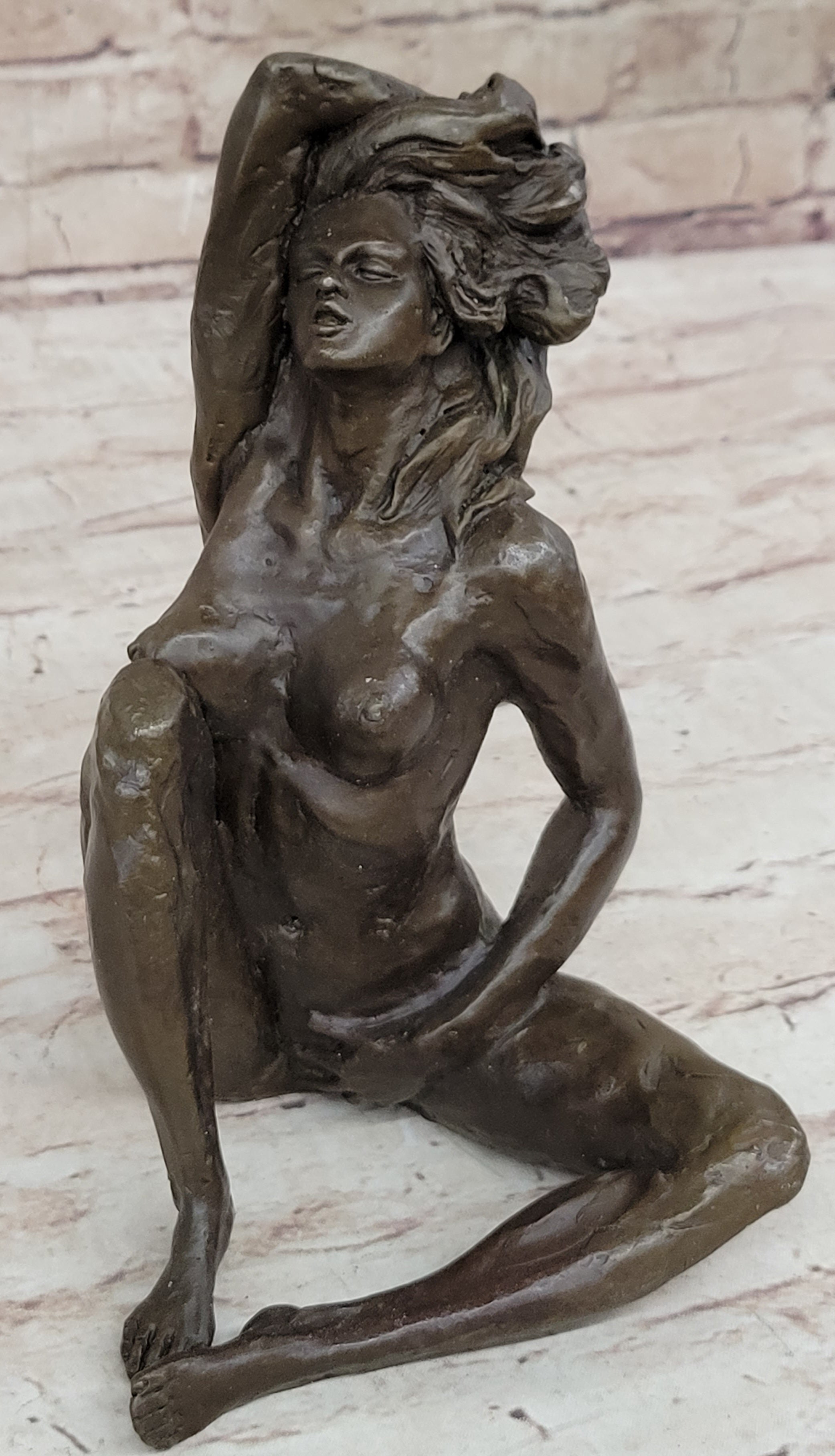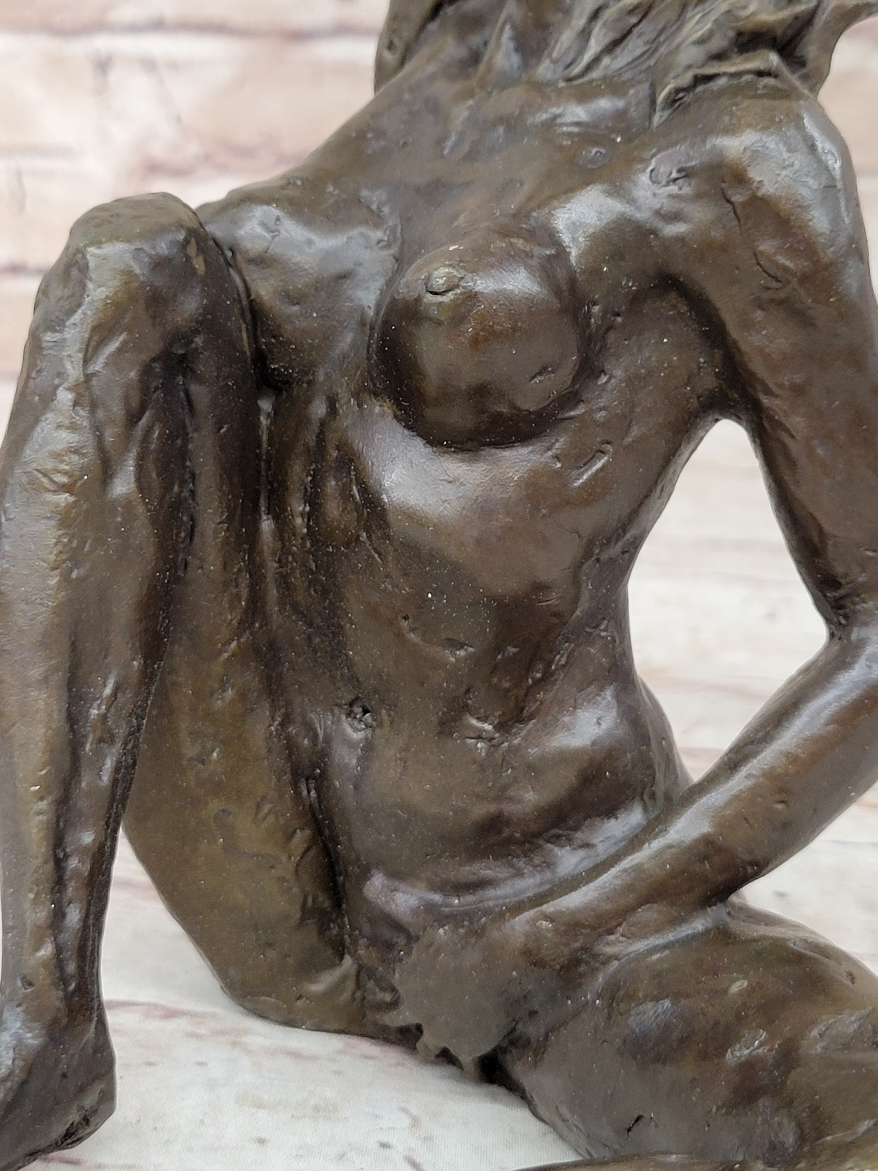 This captivating bronze sculpture depicts a woman kneeling gracefully, her body relaxed as she immerses herself in the rhythm of a song. Her hair flows back as if caught in a breeze, and her serene expression reveals her deep enjoyment of the music. Every part of her body reflects ease and confidence, from her tight, flat stomach to her strong, thick legs, embodying an exotic beauty and the essence of a woman fully at peace with herself.