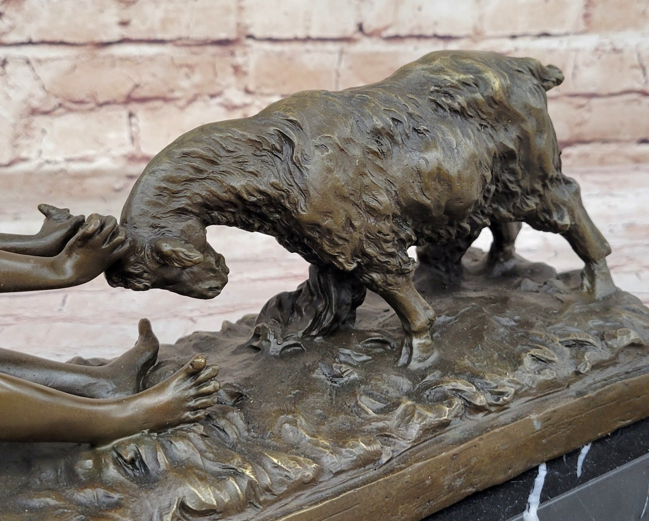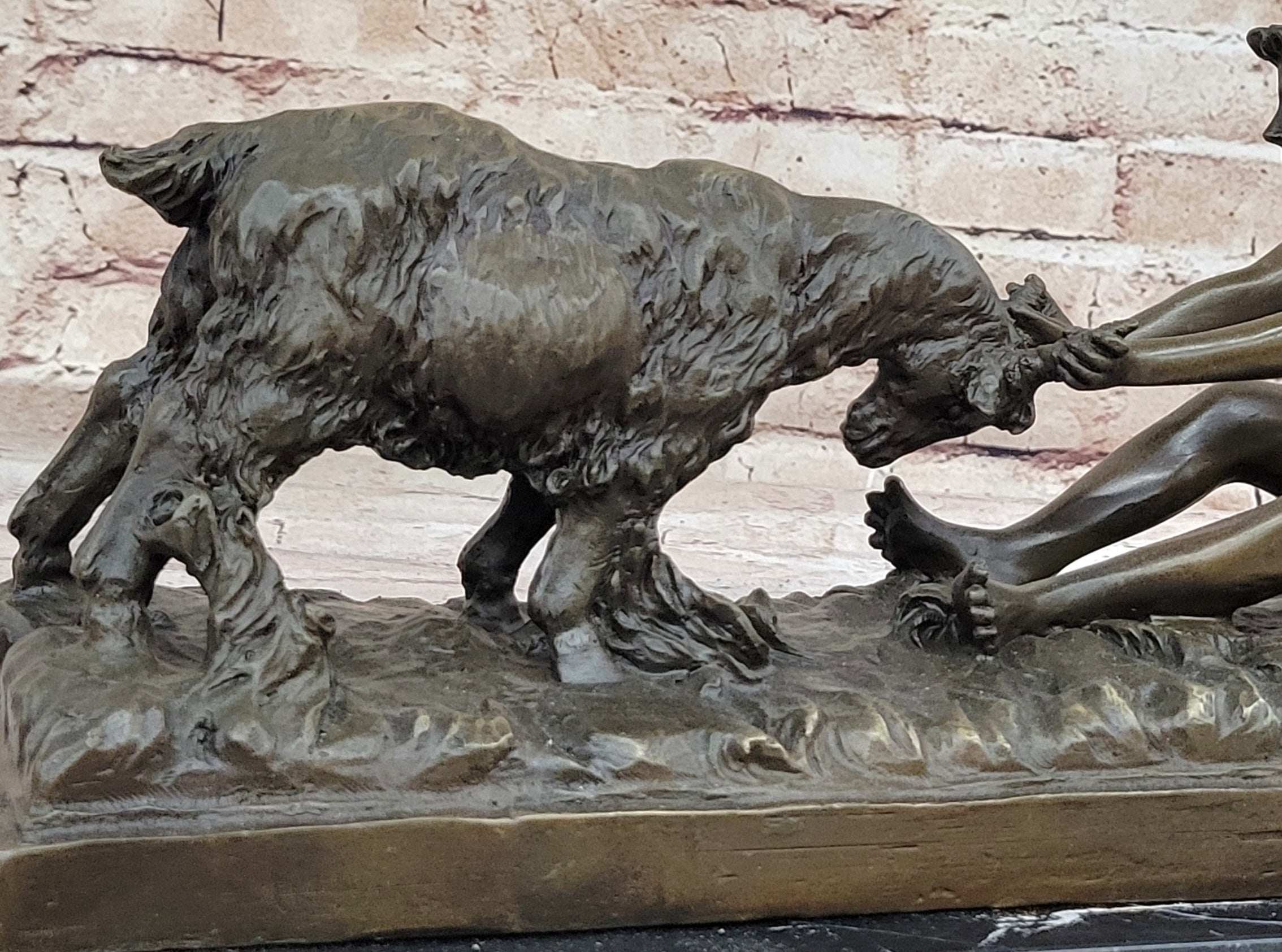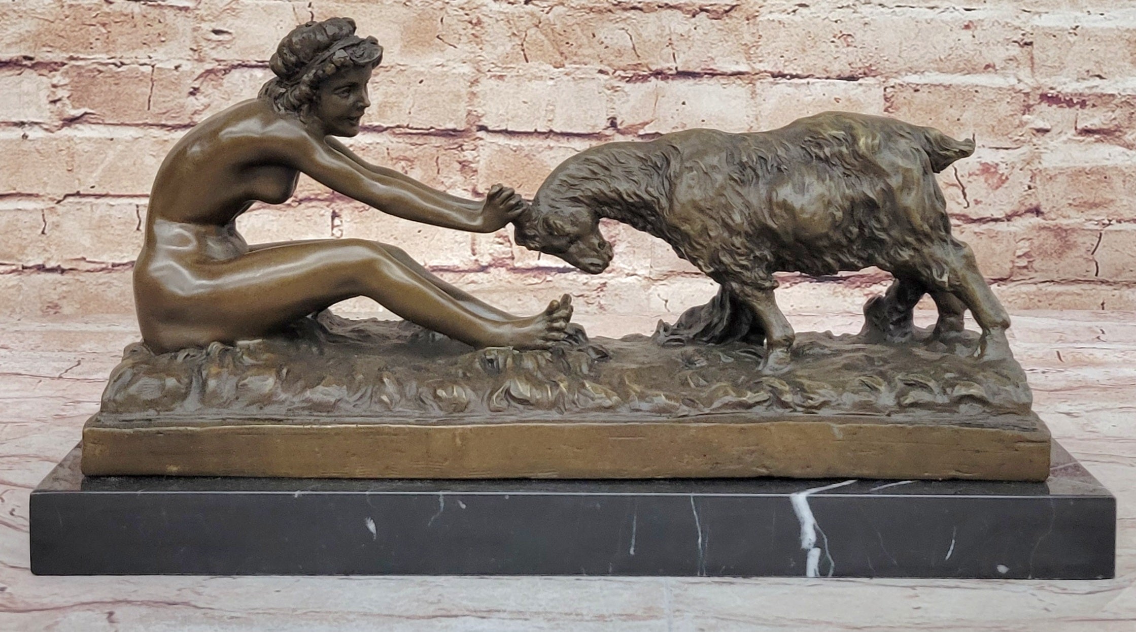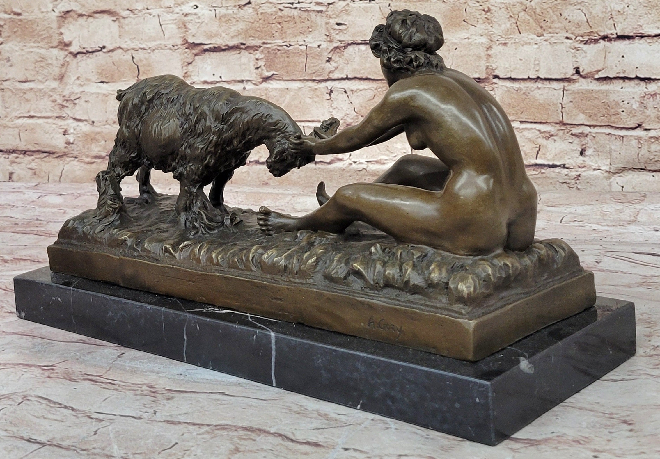 Nude Girl w/ Playful Goat - Vintage Style Bronze Sculpture on Marble Base by Gory