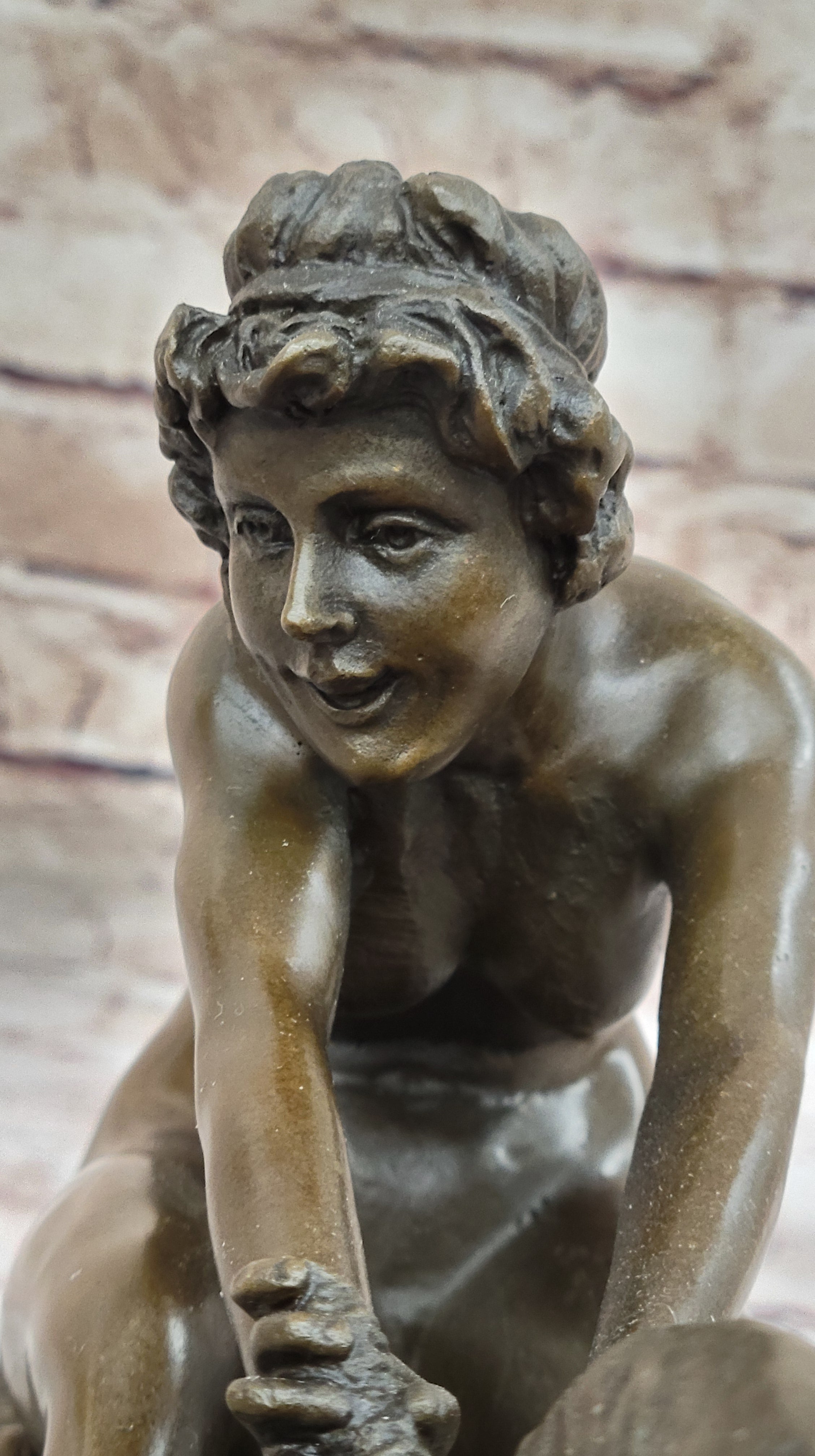 Mounted on a black marble base, this stunning artwork exudes sophistication and timelessness, making it a captivating addition to any art collection or interior space. Whether displayed as a centerpiece or admired from afar, the "Nude Girl with a Goat" sculpture invites viewers to appreciate the beauty of the natural world and the bond between human and animal.Bronze Dimensions with Marble Base: Height 8.5" X Width 15.5"