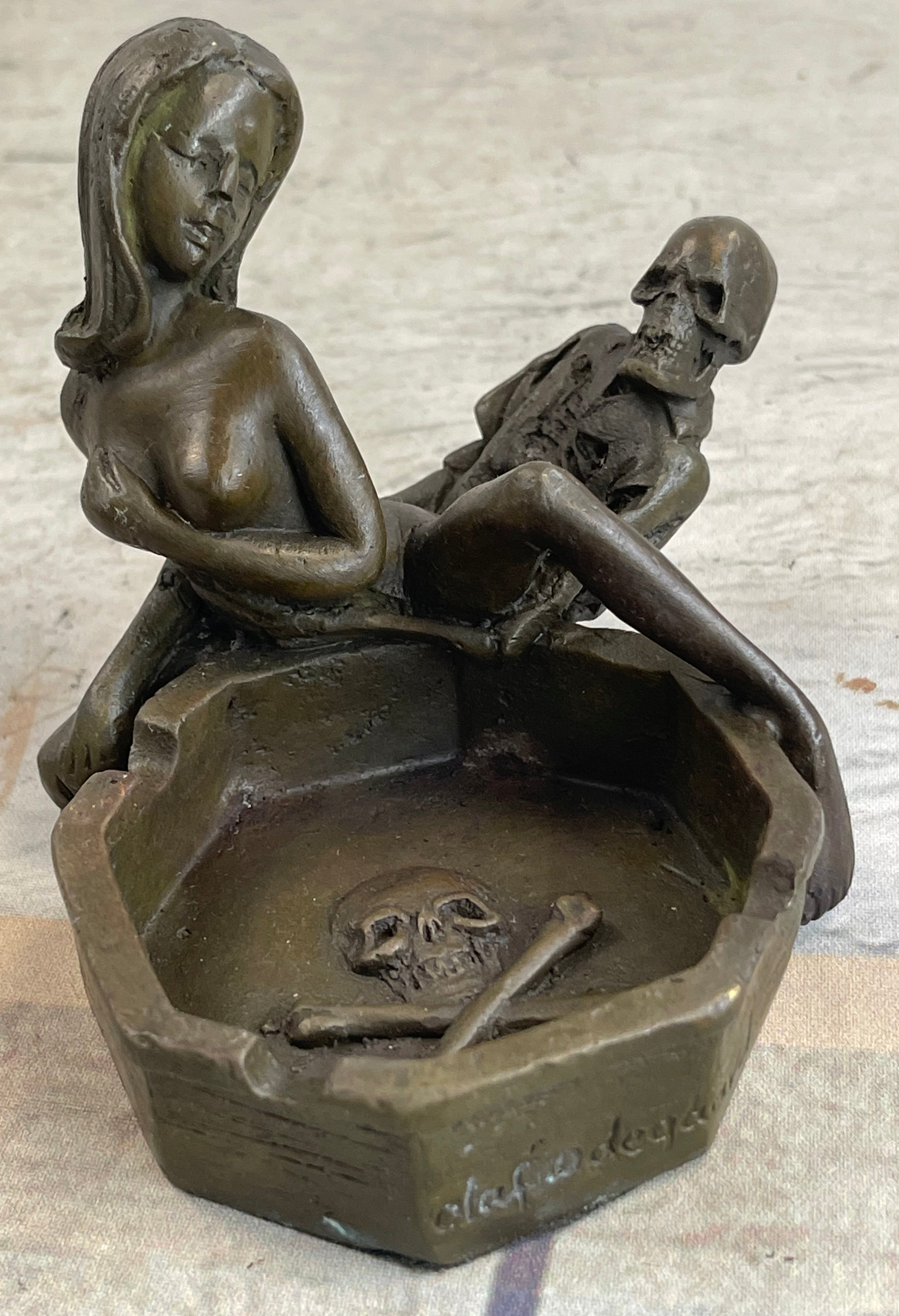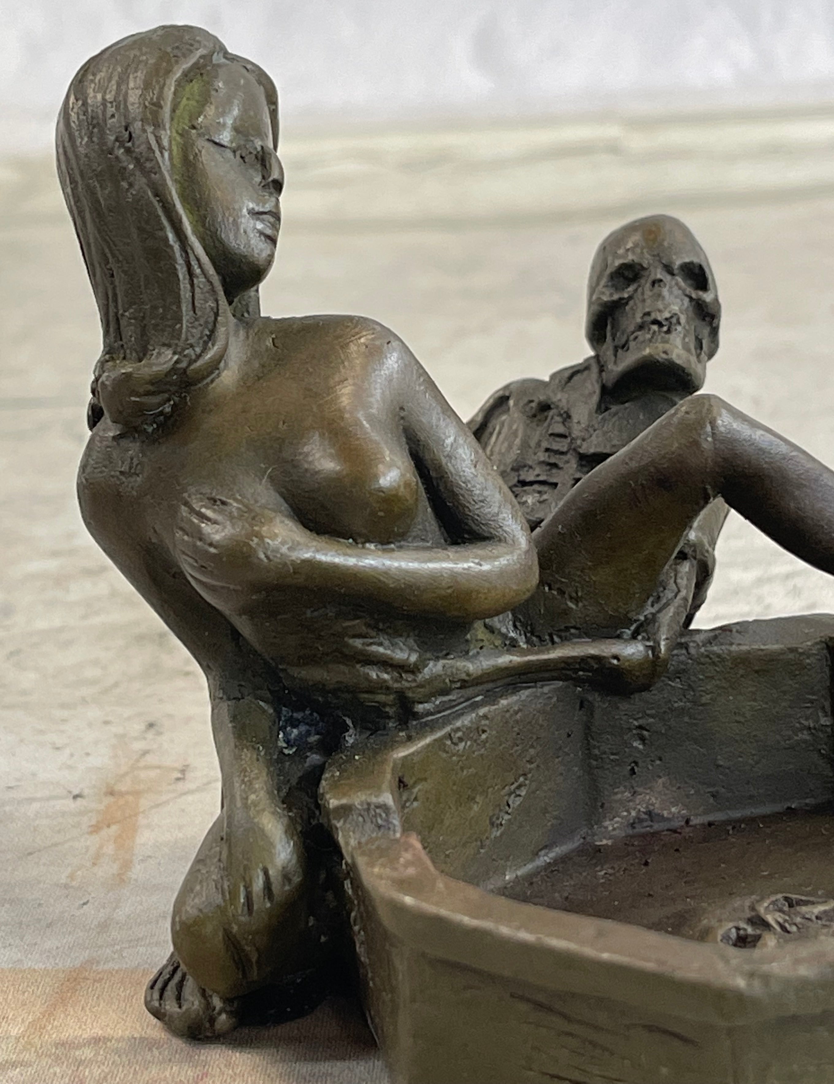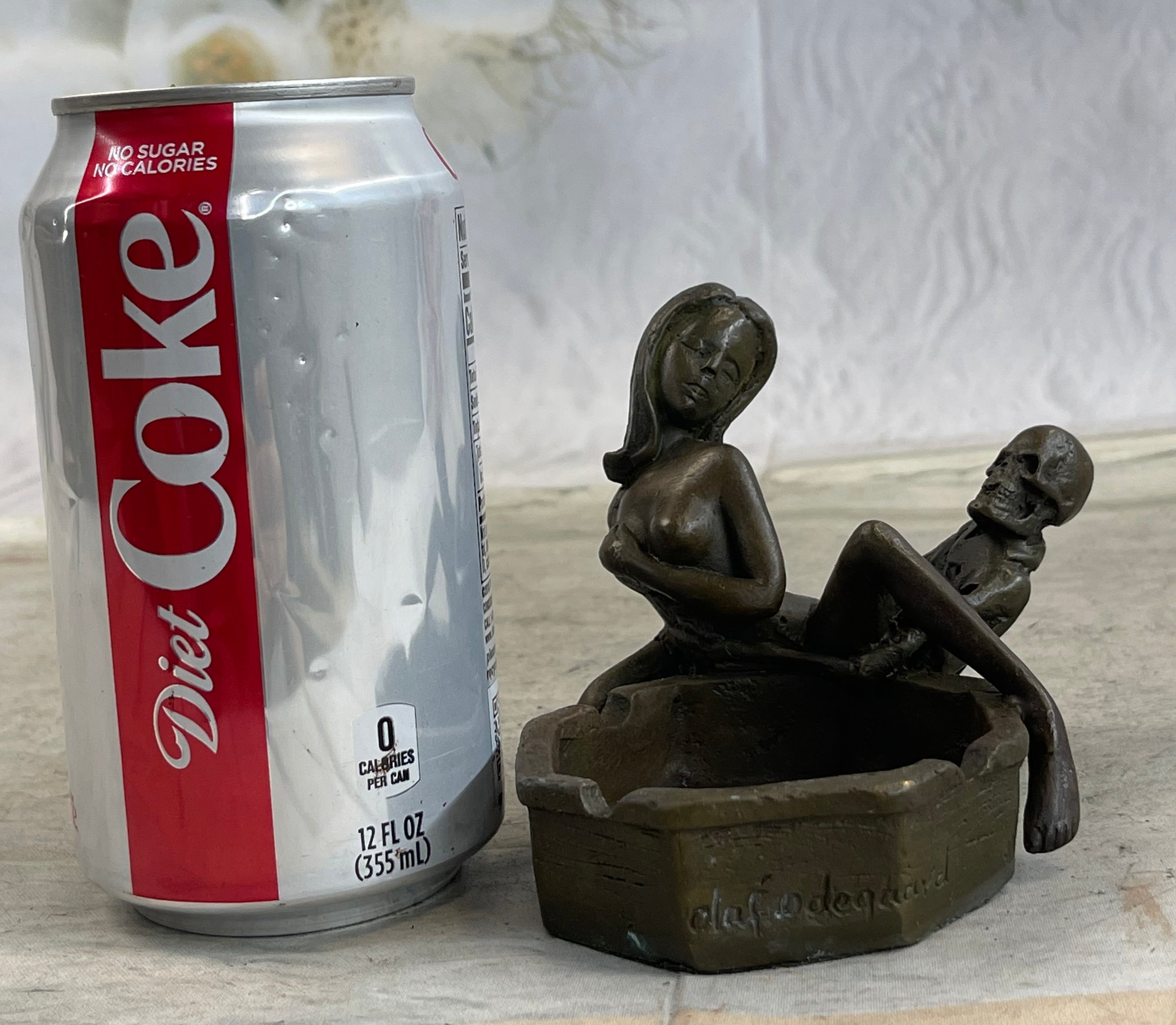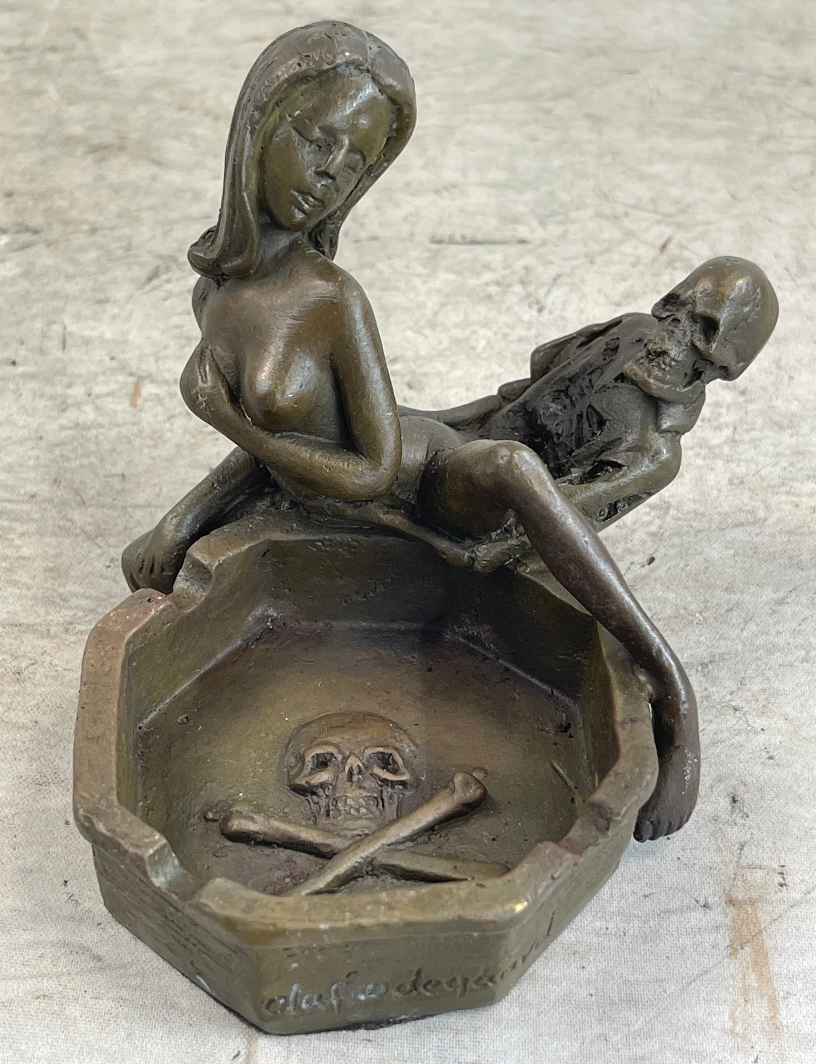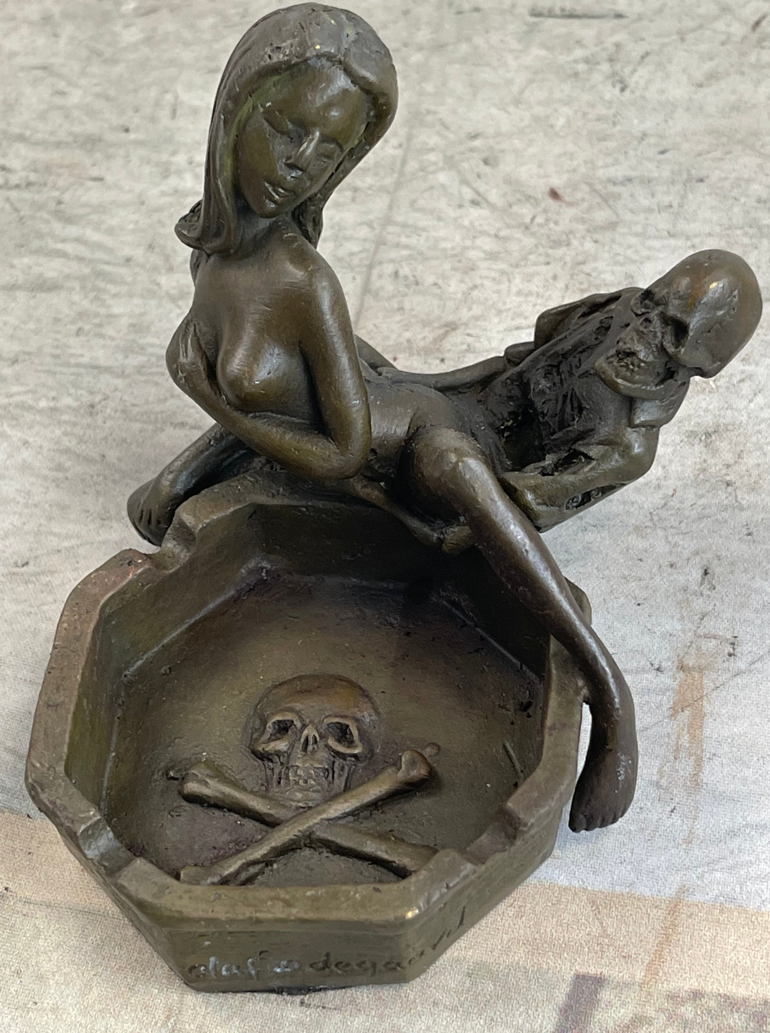 Nude Girl w/ Skeleton Pirate Skull Bones Jolly Roger Erotic Bronze Ashtray 3" x 5"
