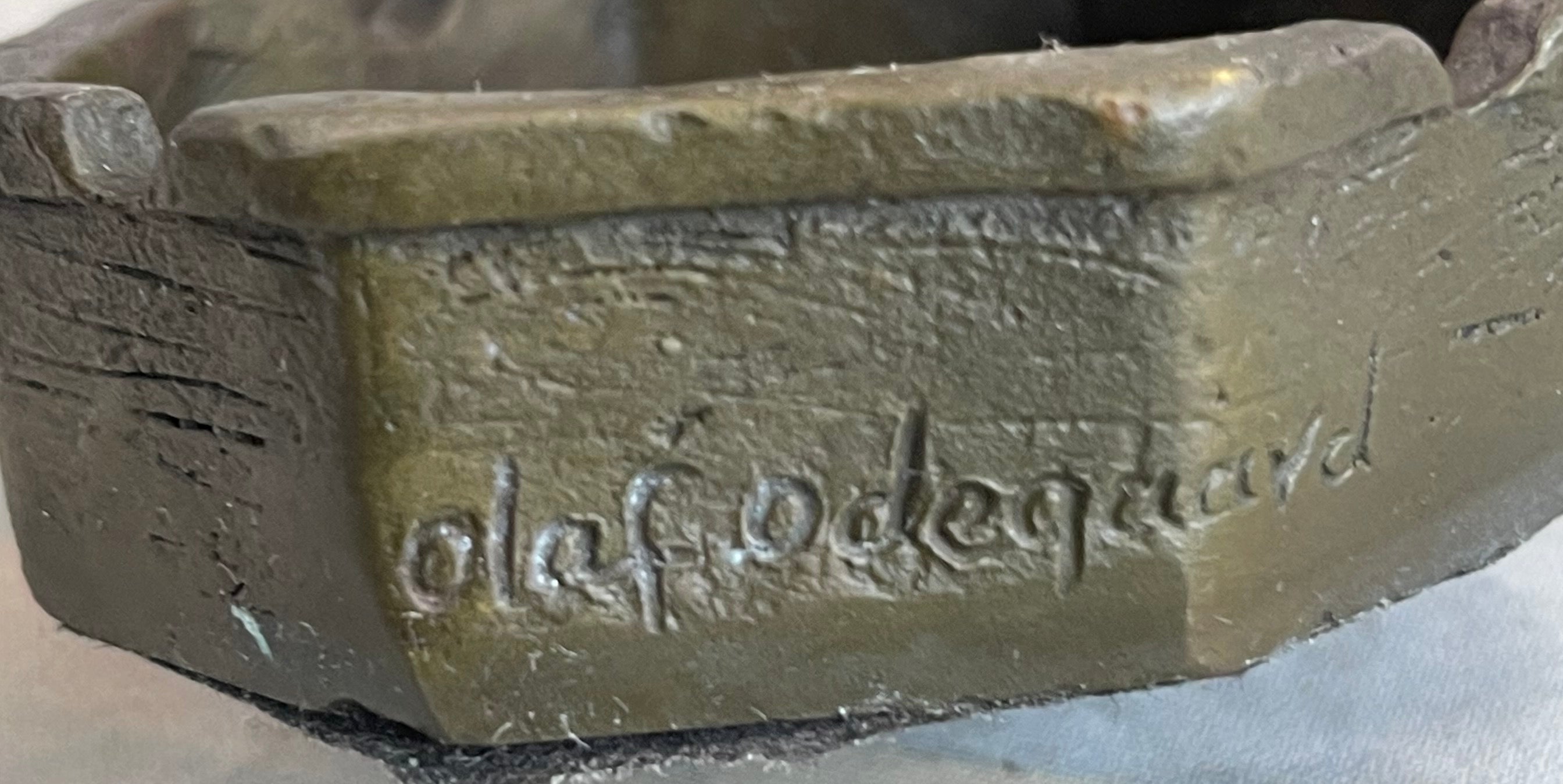 Adding to its allure and authenticity, this ashtray bears the signature of the esteemed artist Olaf Odegaard. Whether displayed for admiration or used as a functional piece, this bronze sculpture ashtray brings a touch of timeless elegance and artistry to any setting, making it a must-have for collectors and connoisseurs alike.Bronze Dimensions: Height 3" X Width 5"