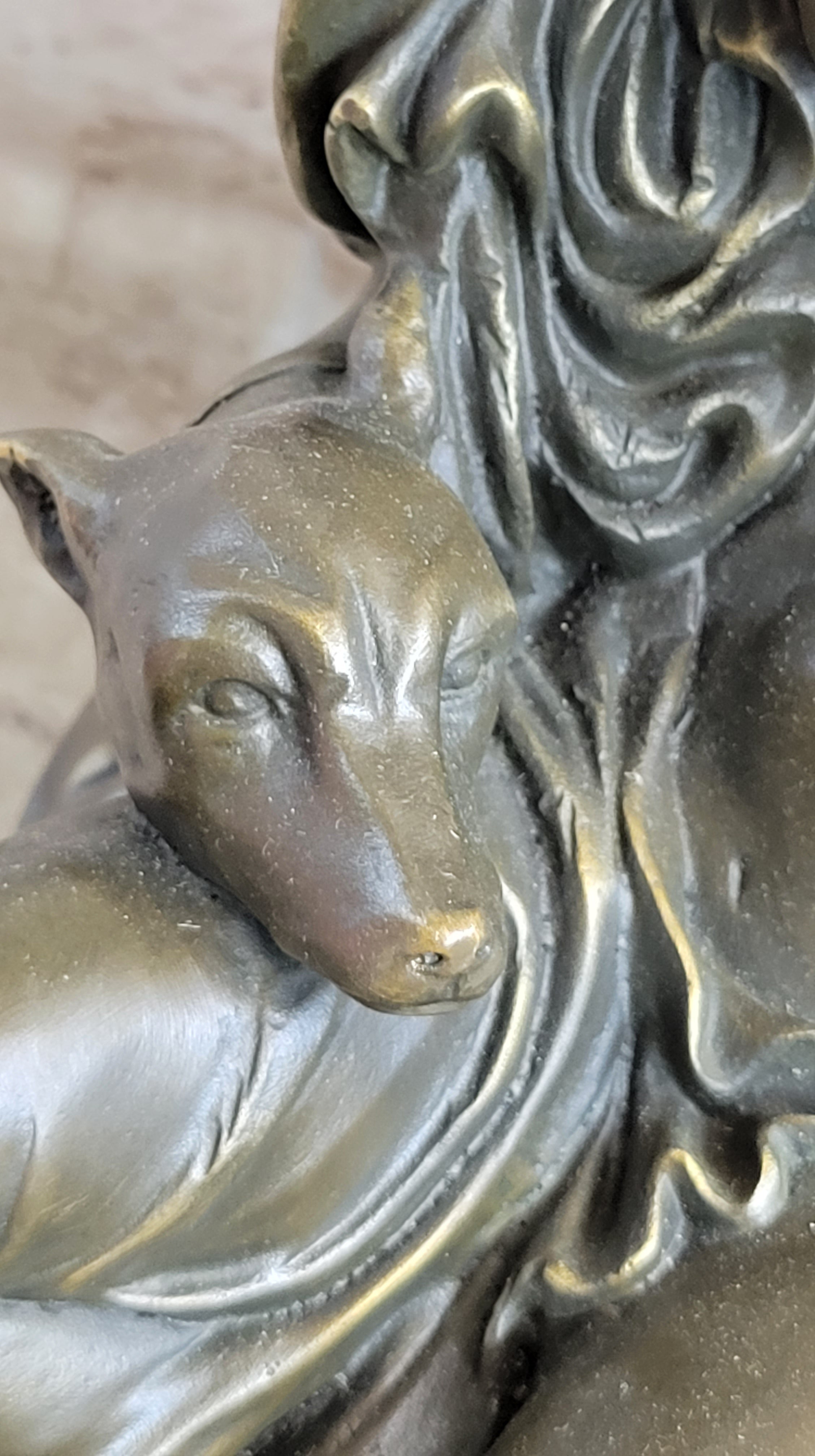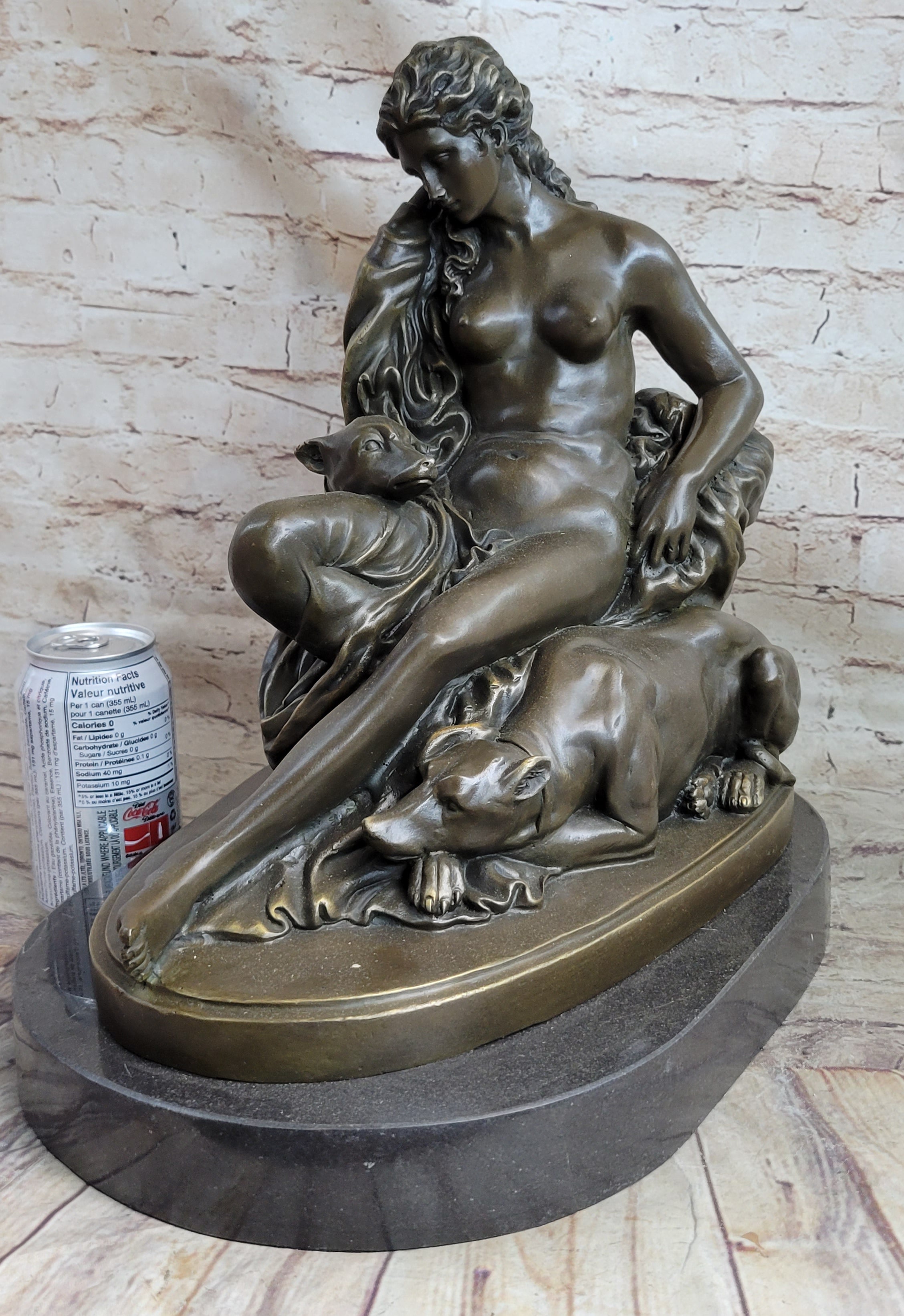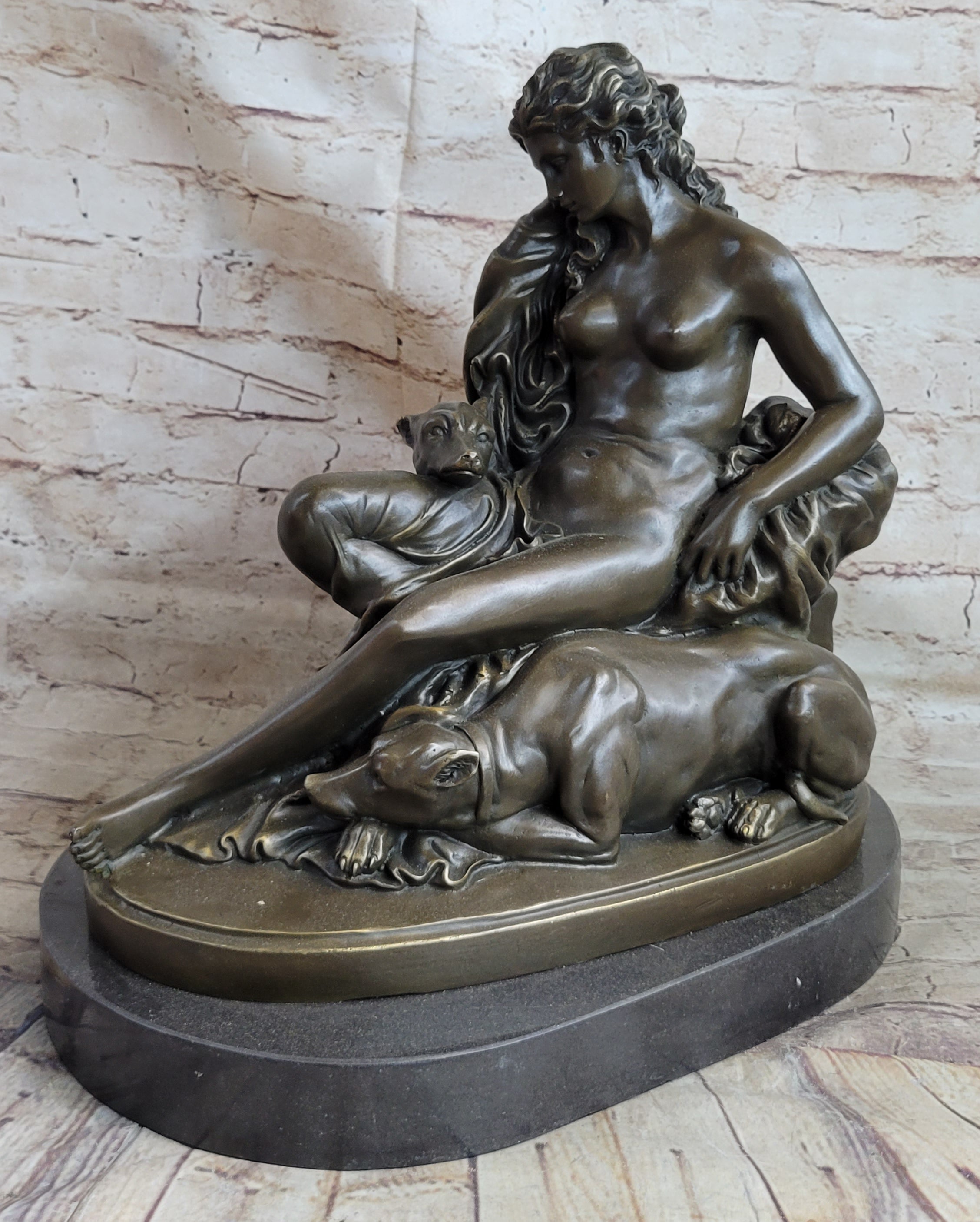 Nude Woman Female Figure w/ 2 Guard Dogs Bronze Statue Sculpture Greek Roman Decor