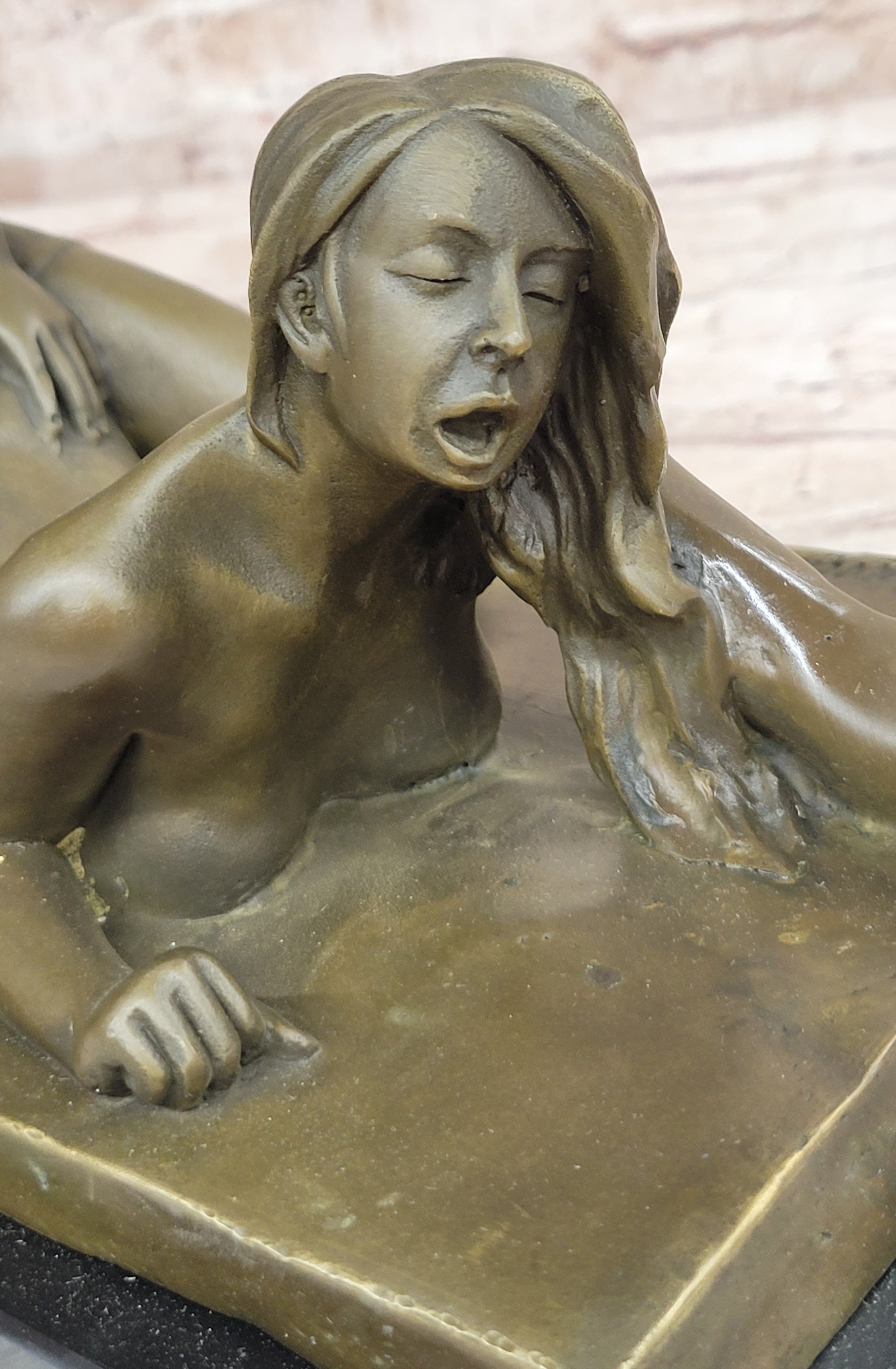The sculpture showcases exquisite attention to detail, including the intricate waves of their hair that flow gracefully to the base of the piece. It is a unique and empowering work of art that celebrates a woman's freedom of choice in embracing her own sexuality and finding pleasure.