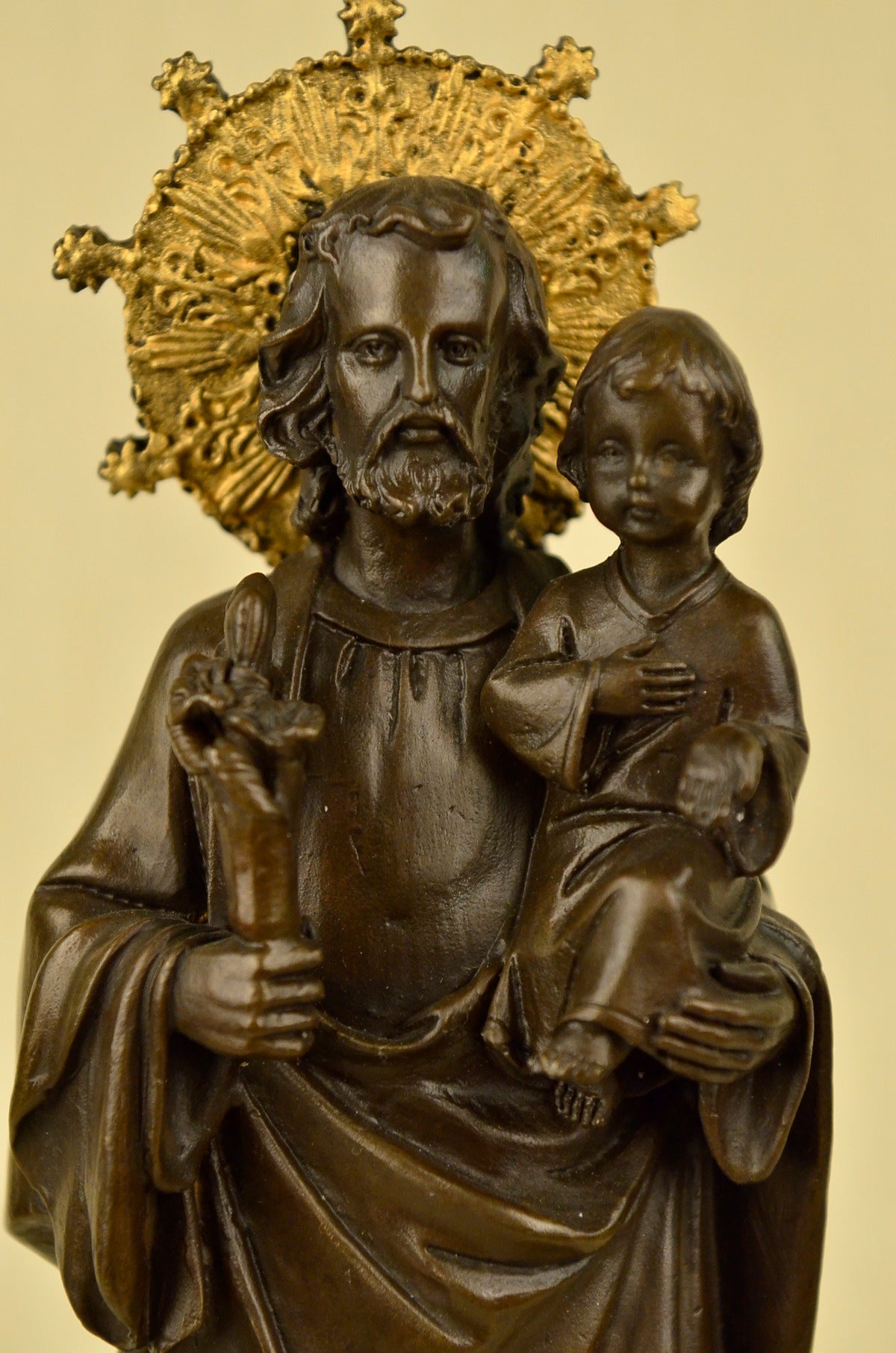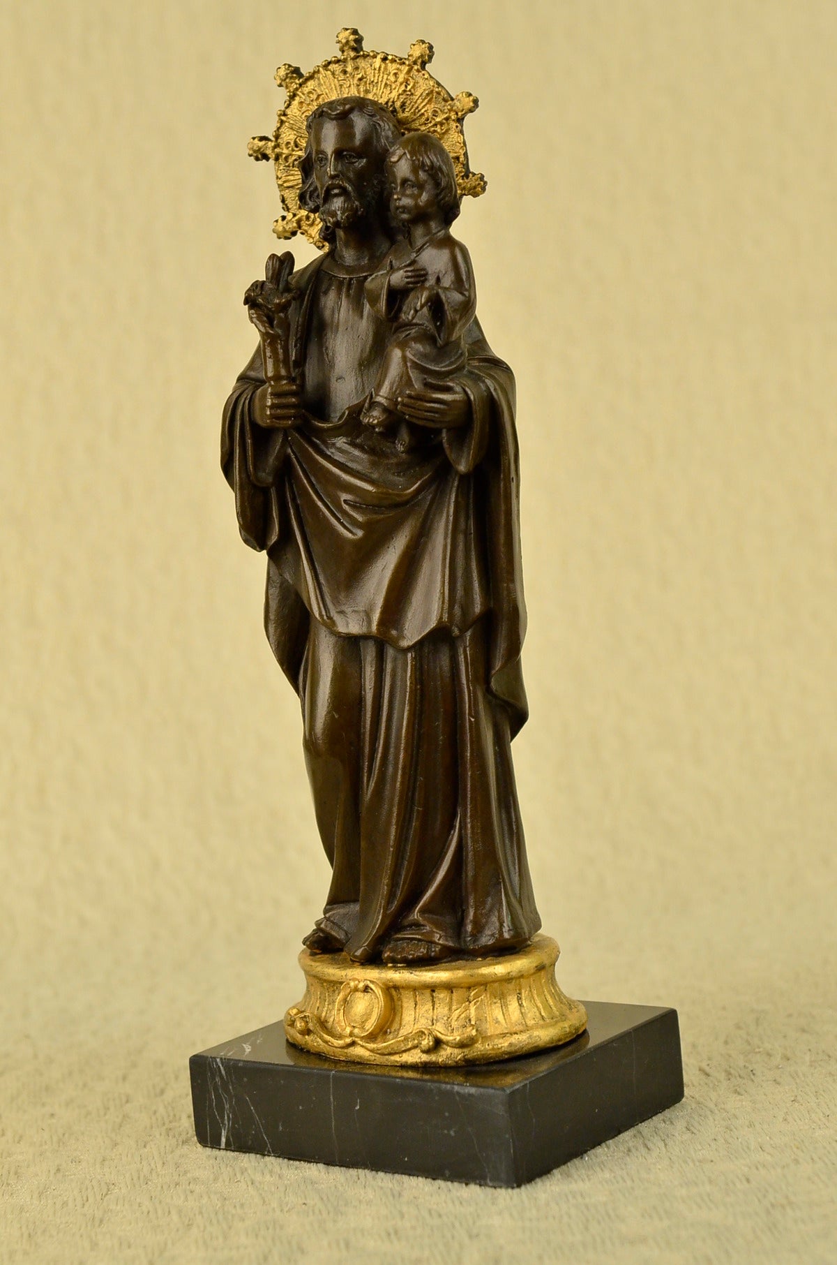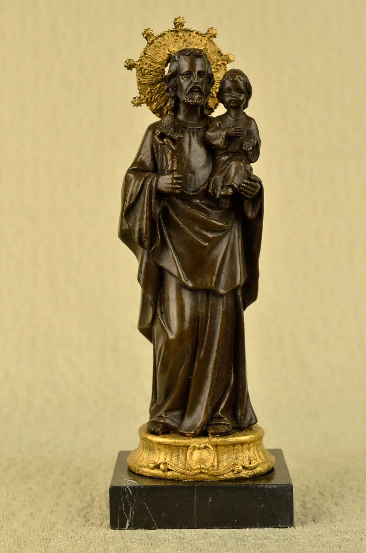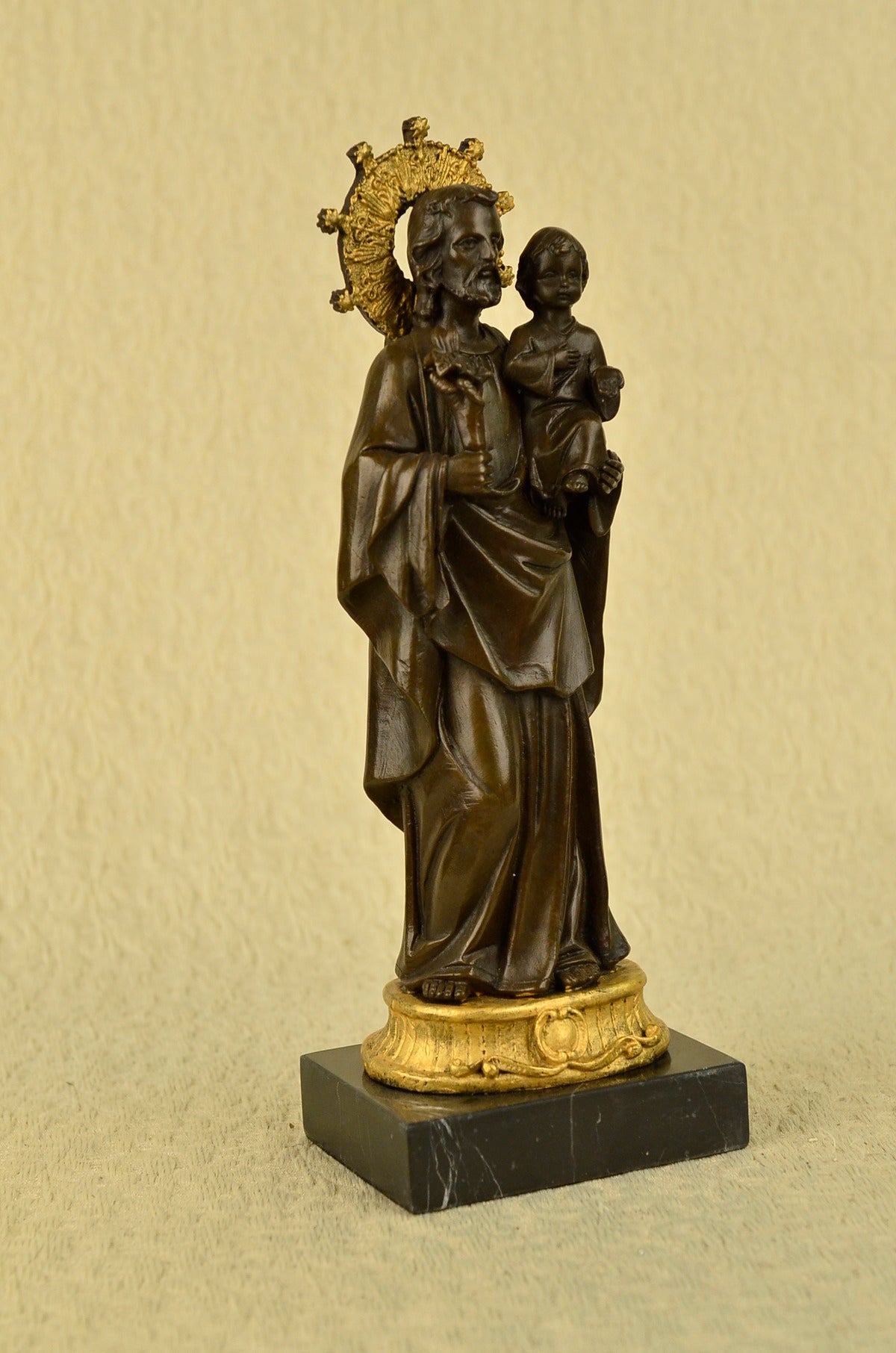 Original Gold Patina Crowned Joseph Jesus Bronze Sculpture Statue Figurine Art