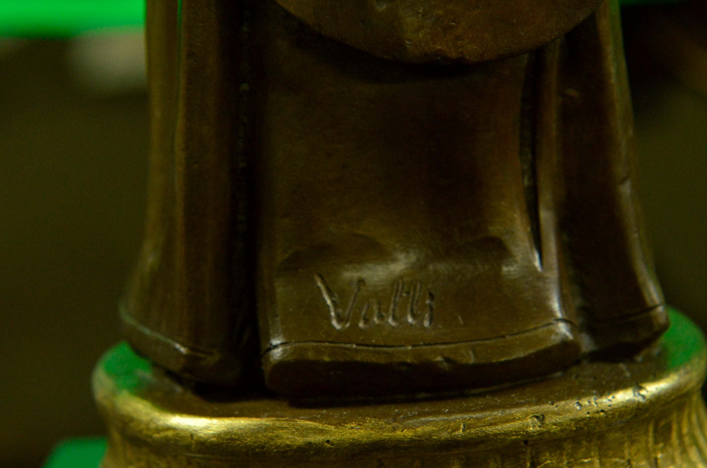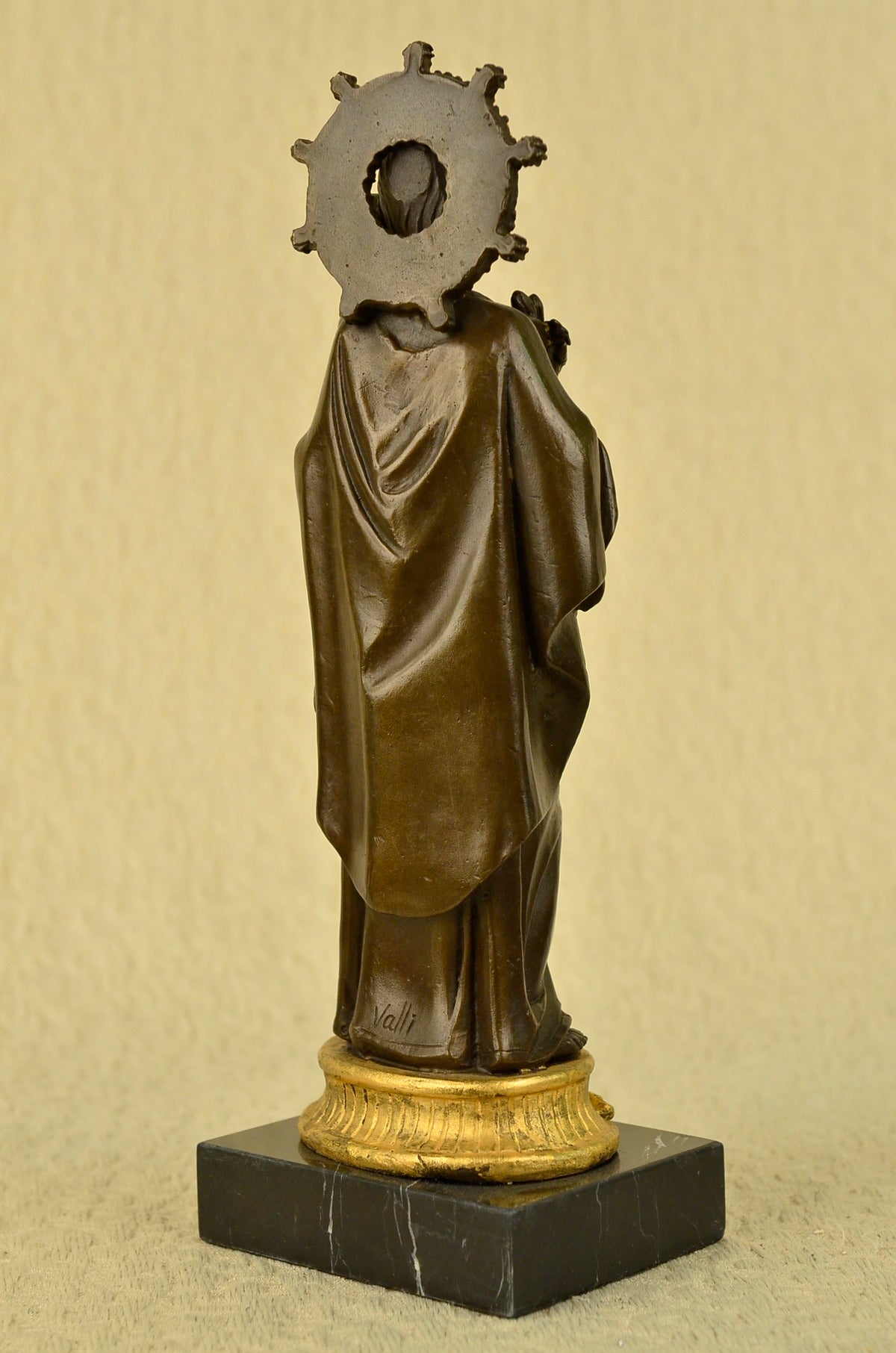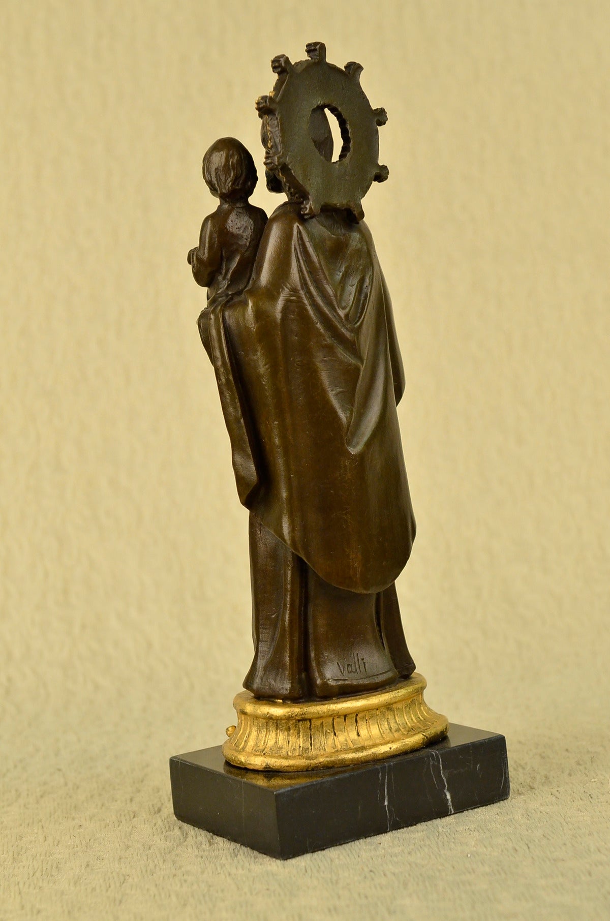 Joseph holds the newborn baby Jesus in this arms. He gazes upon this new life falling in love with its presence by the second. This piece has an biblical feel. Joseph is dressed in heavy garments and bare feet. He appears to be from a simpler time in history. This wonderful piece has a black marble base. It is signed Valli. The lost wax method was used.Original or Reproduction: Reproduction