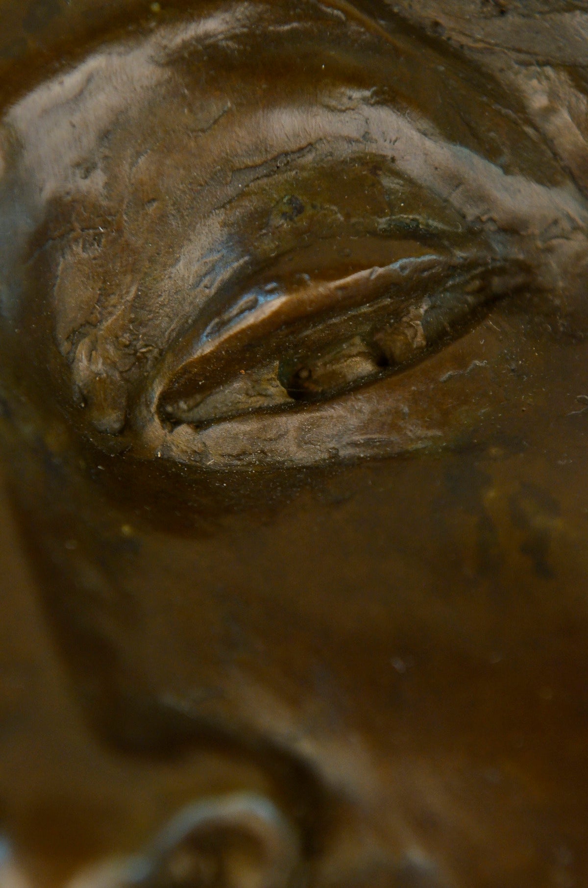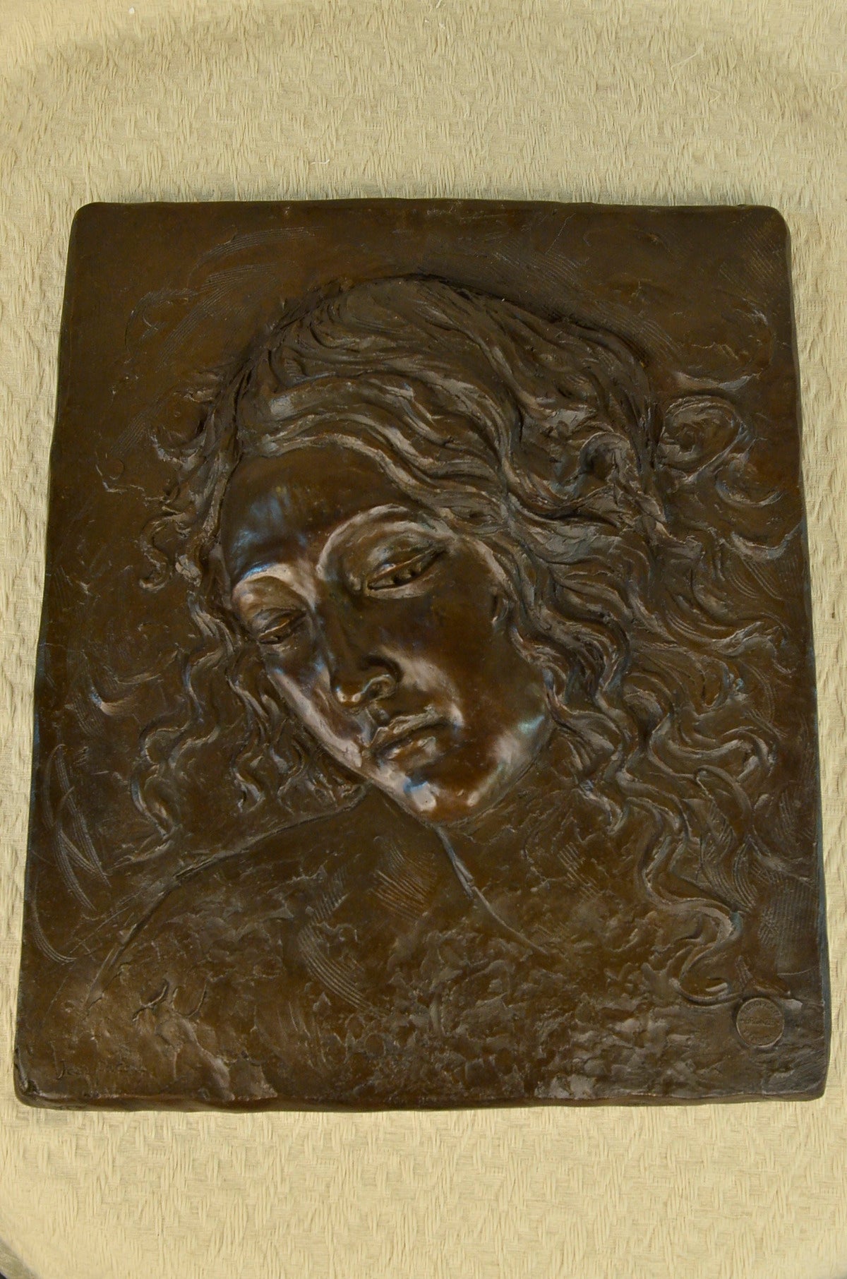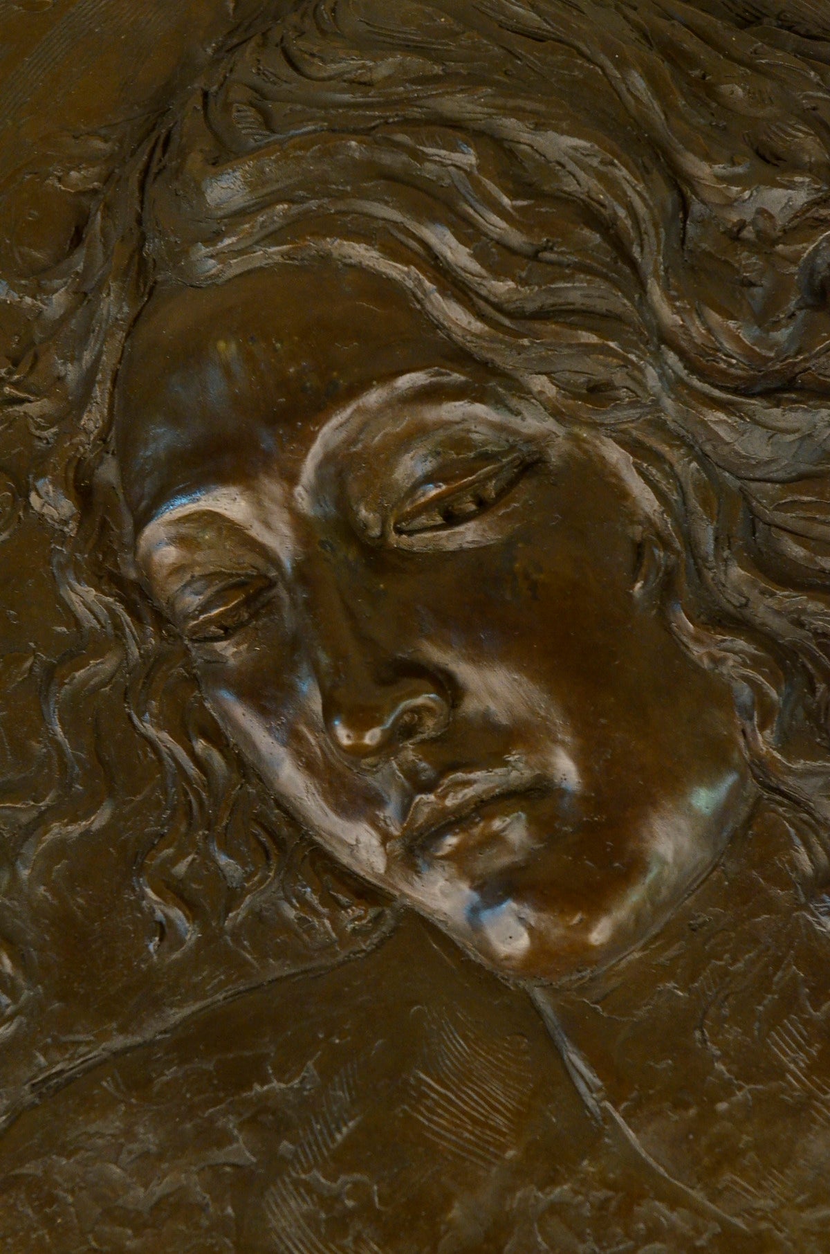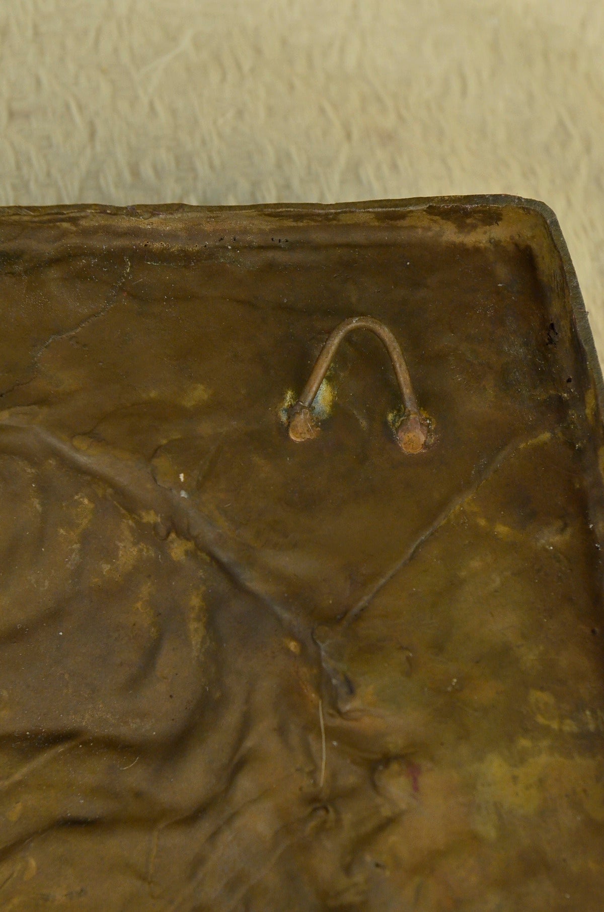 This beautiful plaque of a woman's face is amazing. Very different because you usually see a religious plaque of some sort, but this one is just a regular woman. She looks a bit sad as she looks towards the ground with her beautiful light eyes. She has gorgeous long curly hair, that even if its all over the place she still looks amazing. The sculpture was cast using the ancient old "Lost Wax Method" stained in brown patina. She is 100% handmade and 100% bronze, signed by the artist Jean Patou.Bronze Dimensions :Height 19" x Width 16"