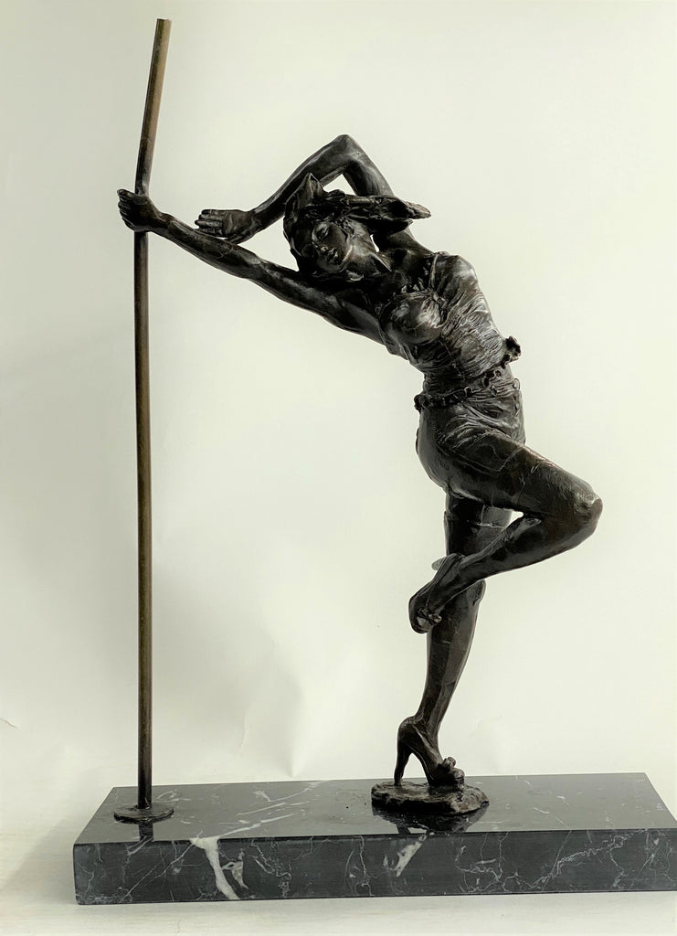 As almost any form of art and cultural activity can be studied and is worthy of analysis. But pole dancing has a stigma of being a crass and sexually provoking performance. That side of the spectrum does exist, but the sexual and gender politics of pole dancing in modern life are much more complex to conveniently label it as such. Cast using the "Lost Wax Method", this sculpture is 100% bronze and handmade in a Brown patina. She is mounted on a square marble base and is signed by Italian Artist Aldo Vitaleh.Bronze Dimensions with Marble Base:Height 18" x Width 12.5"