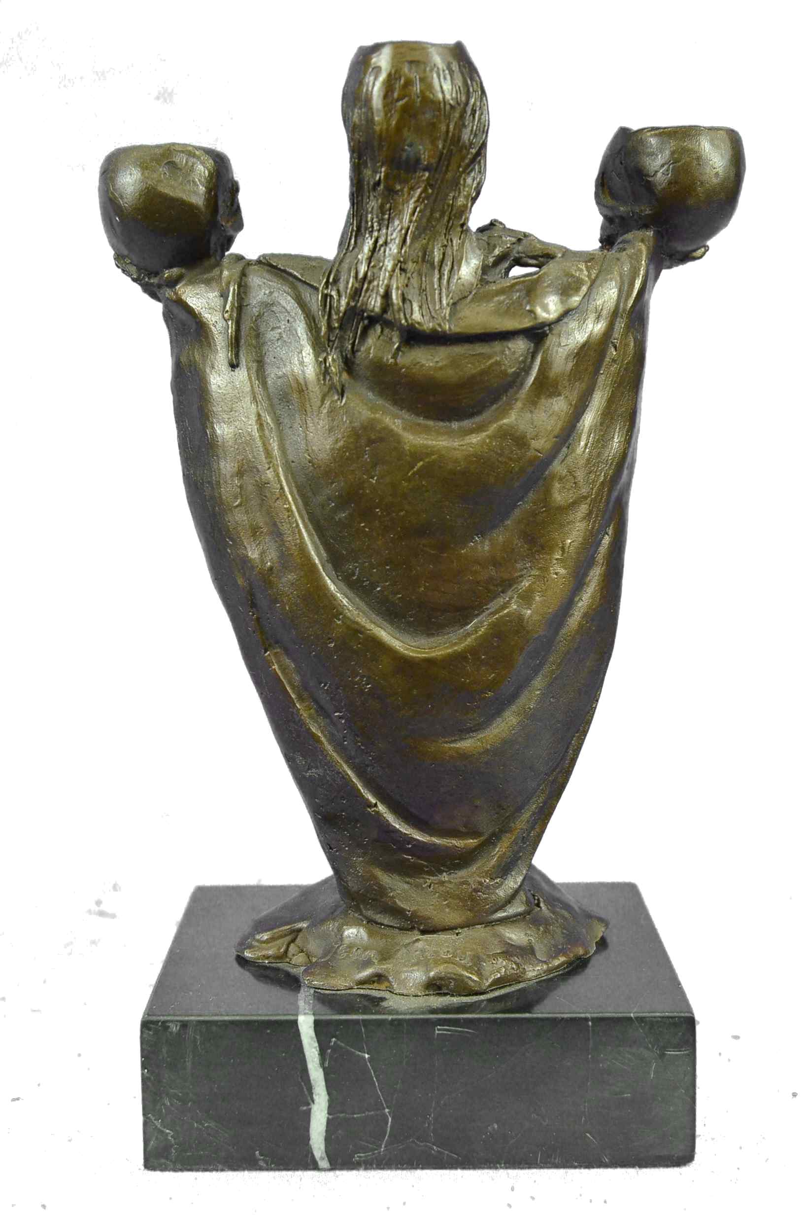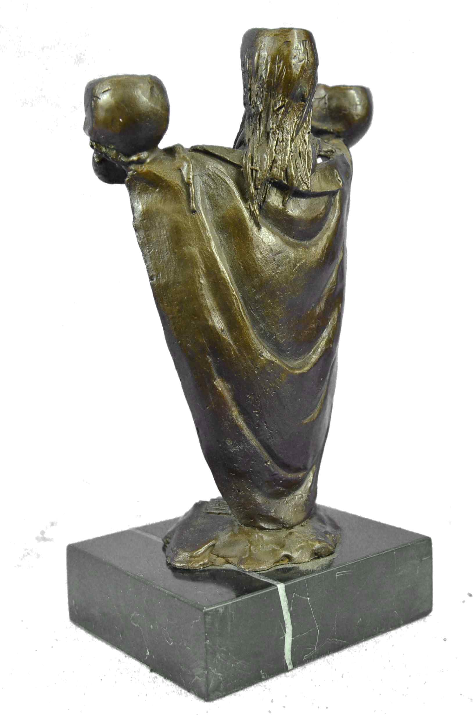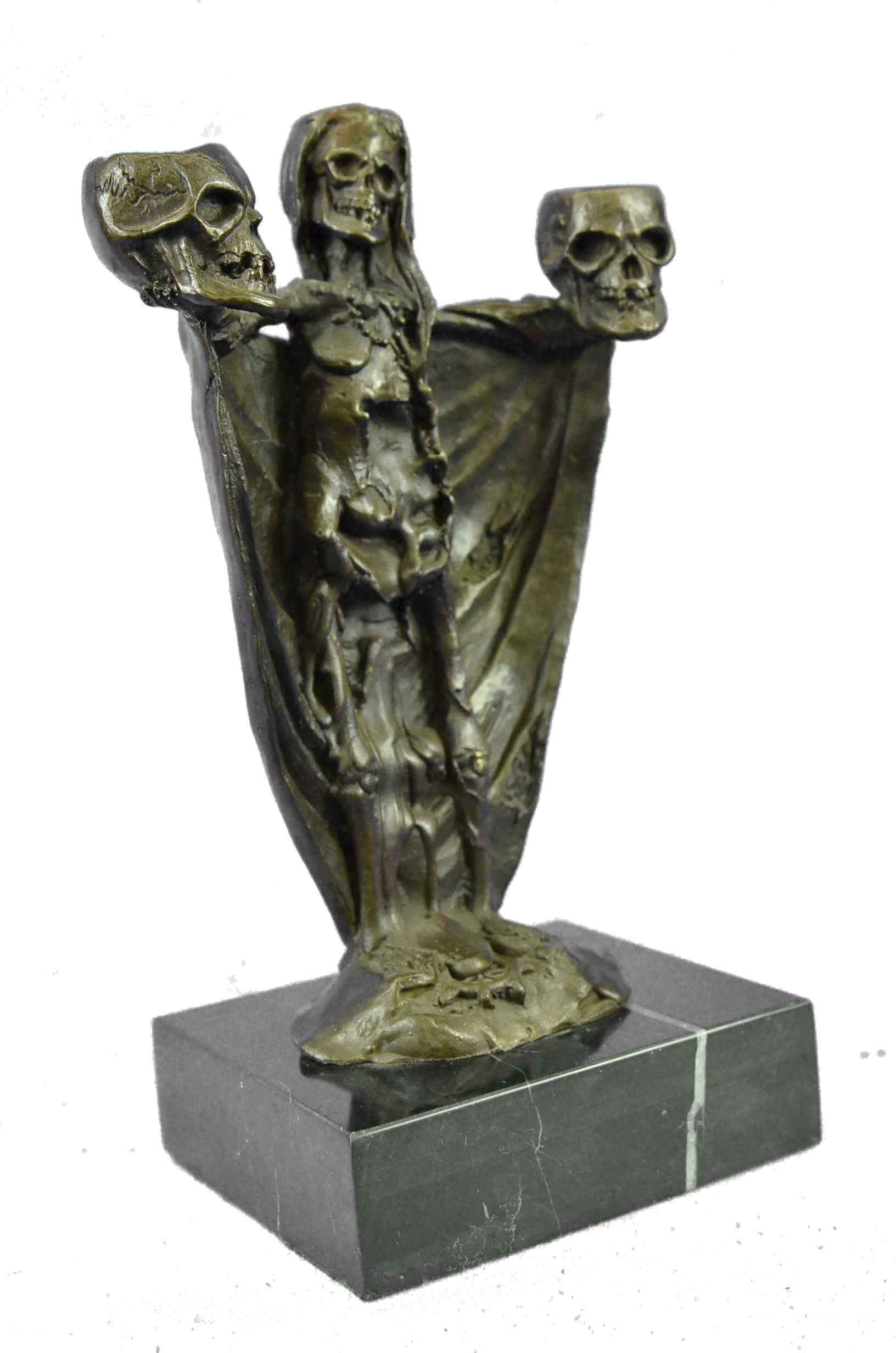 Decorate your dungeon with a truly ghoulish glow! Spine-chilling skulls sport Gothic designs and a real 100% Bronze candles cast an eerie light.This brown patina sculpture was cast using the "Lost Wax Method." It is mounted on a marble base and signed by the artist Jean Patoue.Bronze Dimensions with Marble Base:Height 9" X Width 5.5"