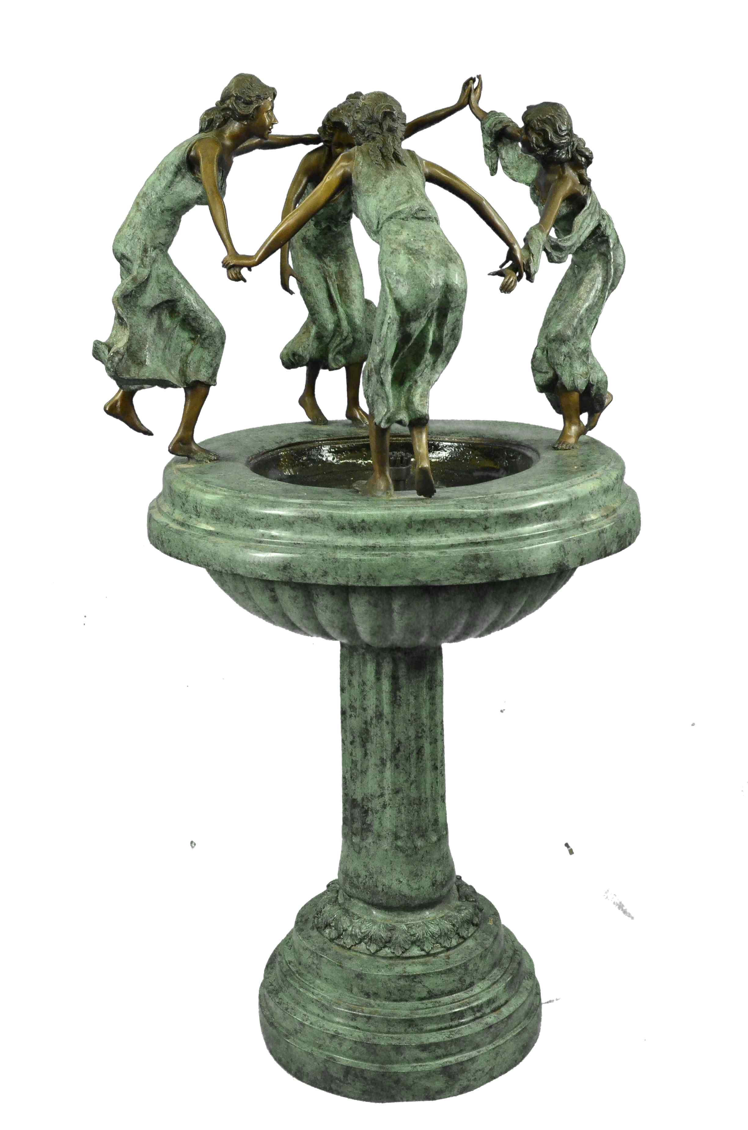 Four Dancing Ladies Urn Fountain This bronze statue measures 2” high by 28” long by 28” wide. It is handmade and cast in the traditional Lost Wax Casting Process. This insures a quality bronze sculpture that may be passed down from generation to generation. This is a good piece for outdoor gardens, a pool/ pond. This piece will last forever outdoors. It is made to stand up to the elements and will look great wherever you put it with little or no maintenance.Bronze Dimensions Base:Height 52" x Width 28"