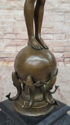 Mounted on a square black marble base, the sculpture gains a striking contrast between the smooth, polished stone and the textured bronze. The solid foundation provides stability while adding an air of sophistication to the piece. The signature of Frederick W. MacMonnies, one of the most renowned American sculptors of the late 19th and early 20th centuries, authenticates its historical and artistic significance. His ability to merge classical mythology with Beaux-Arts elegance is evident in this stunning creation.