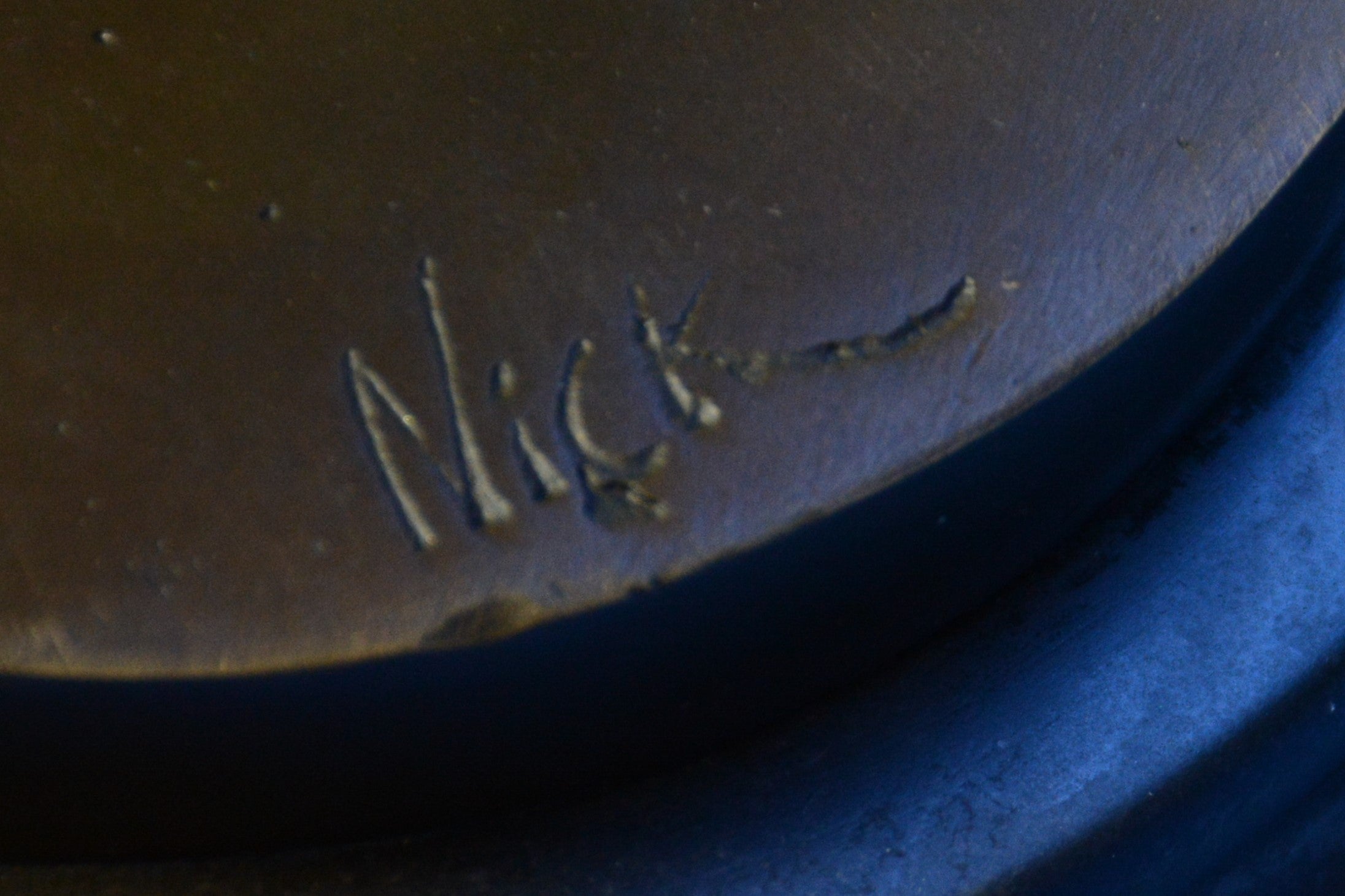 This Sculpture depicts a very rare scene: Mercury (Hermes) conveying Pandora to Epimetheus, a scene after the relief by John Flaxman (1755-1826). As we all know, Pandora took a jar (box) that contains all evils of the world and she opened it and all the evils flew out, leaving only Hope inside once she had closed it again. The sculpture is intricately carved in great details, fully represent John Flaxman's original work. The carving lines are smooth and clean. Mercury and Pandora's face, hair, hands and toes are all carved very clear. A wonderful Magnificent of art sitting on top of a black marble base and is signed by artist Mario Nick.Bronze Dimensions with Marble Base:Height 22" x Width 9"