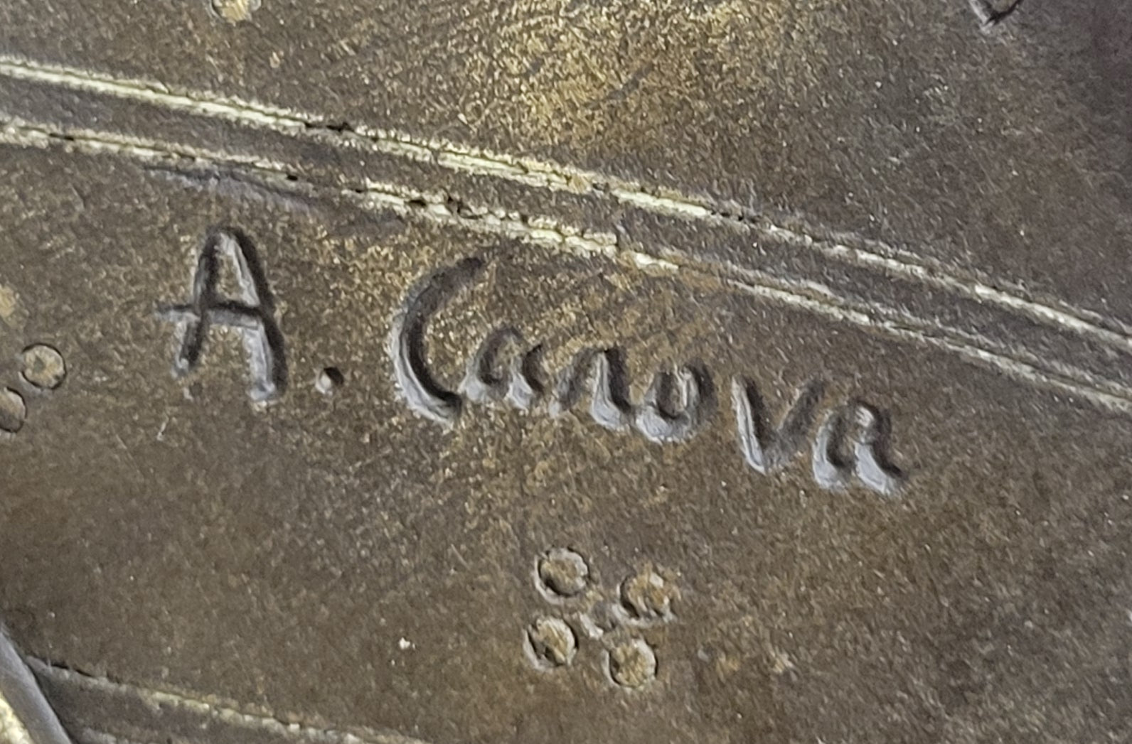 This heavy and meticulously crafted statue is a tribute to Canova's skill and artistry, embodying the grace and timeless beauty of classical sculpture. It is a remarkable work of art that would add a touch of sophistication to any collection or display.Bronze Dimensions with Marble Base: Height 14" X Width 22.5"