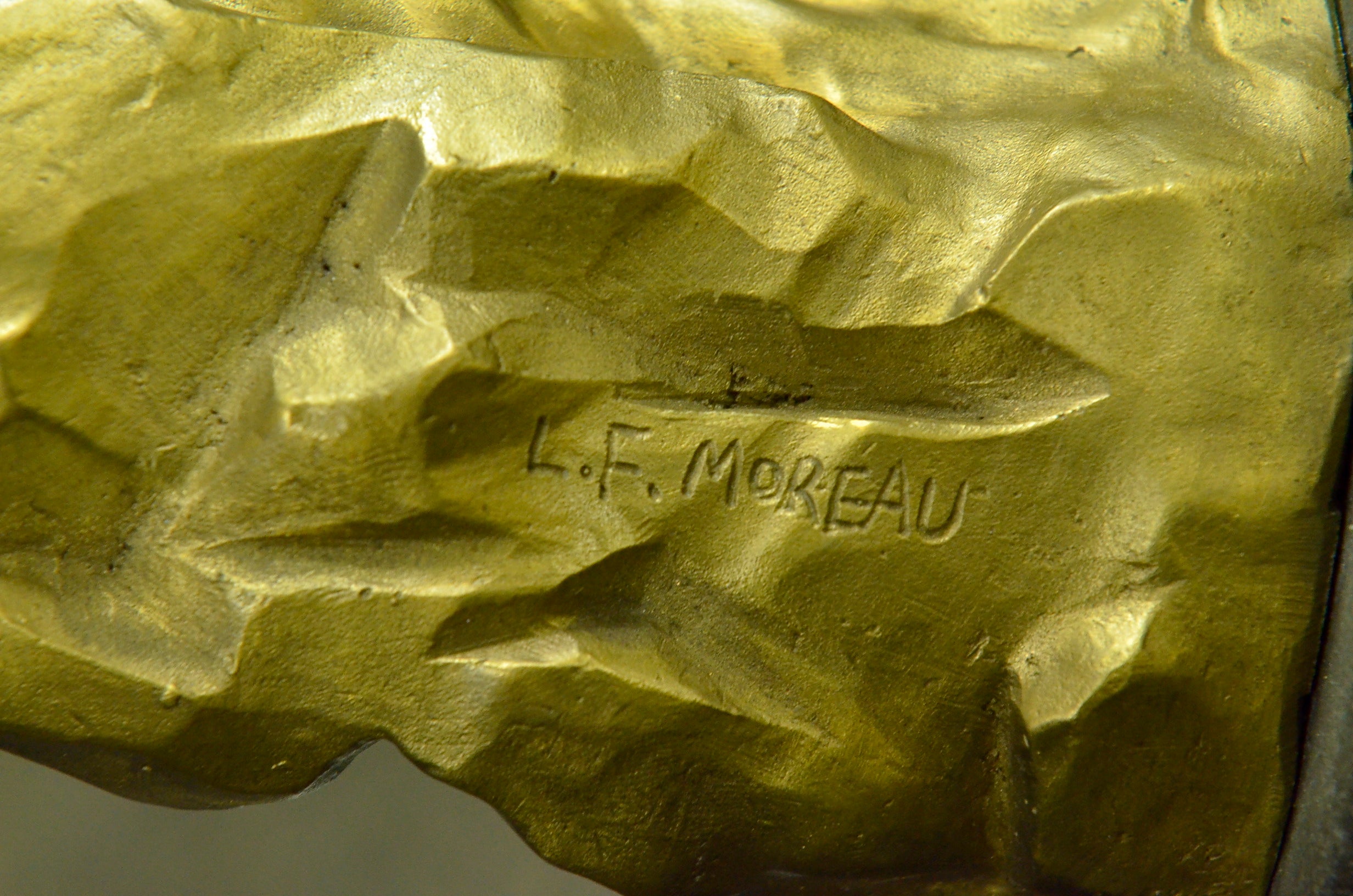 This lovely woman stands up while she drinks water from a spring . She has the most amazing one piece dress that hangs real low to the floor barely exposing her feet. Her hair is nicely pulled back into an elegant style, and she is bare foot standing on her toes. She is cast using the ancient "Lost Wax Method" stained in brown patina and is mounted atop a double marble base, signed L.F MorauBronze Dimensions with Marble Base:Height 9.5" x Width 6"
