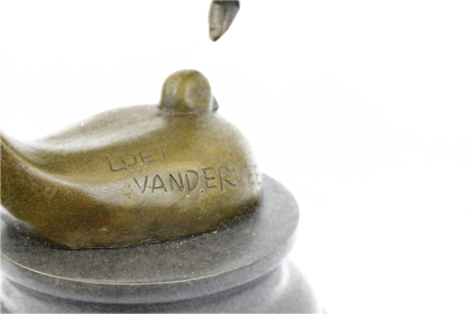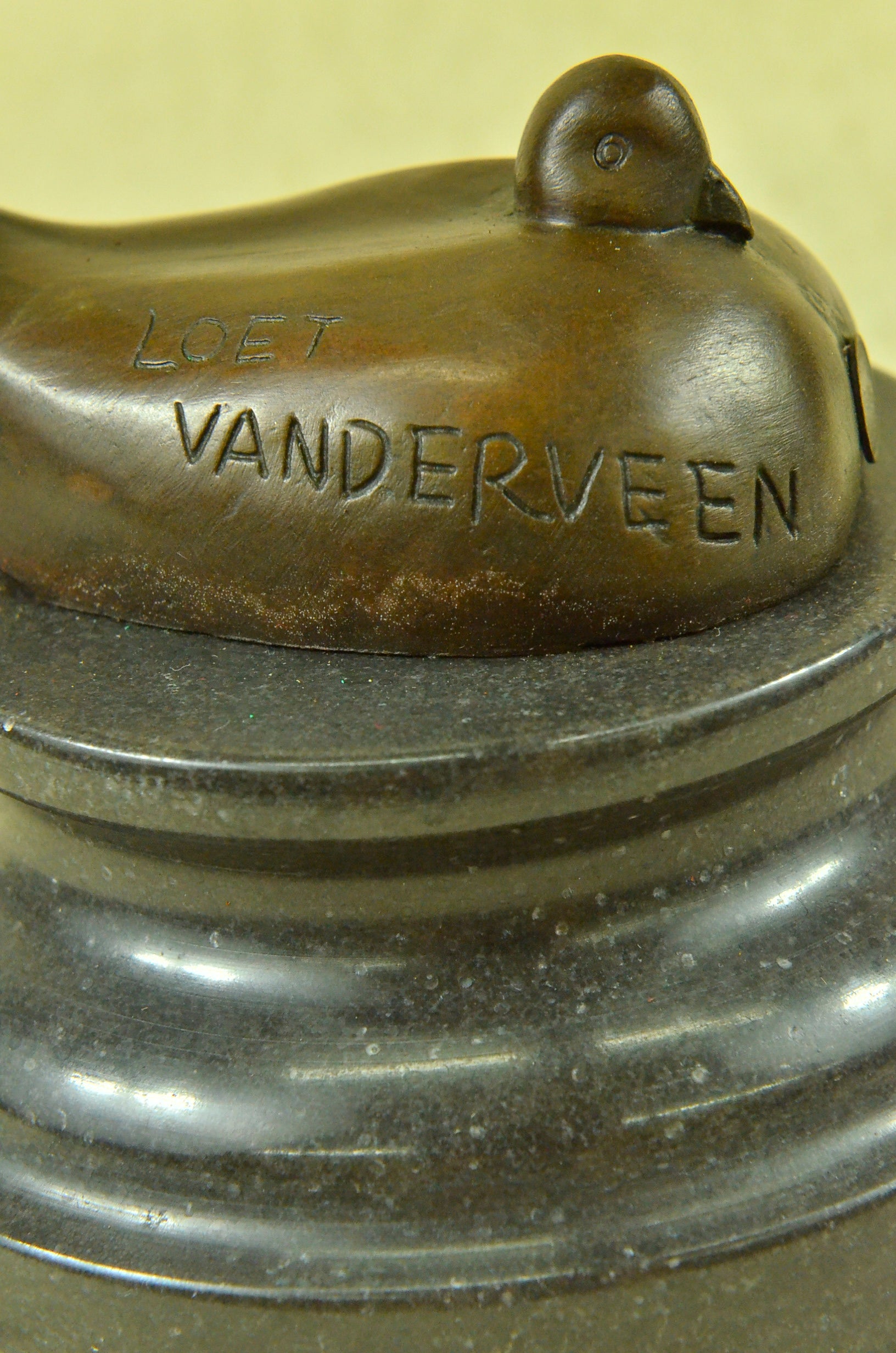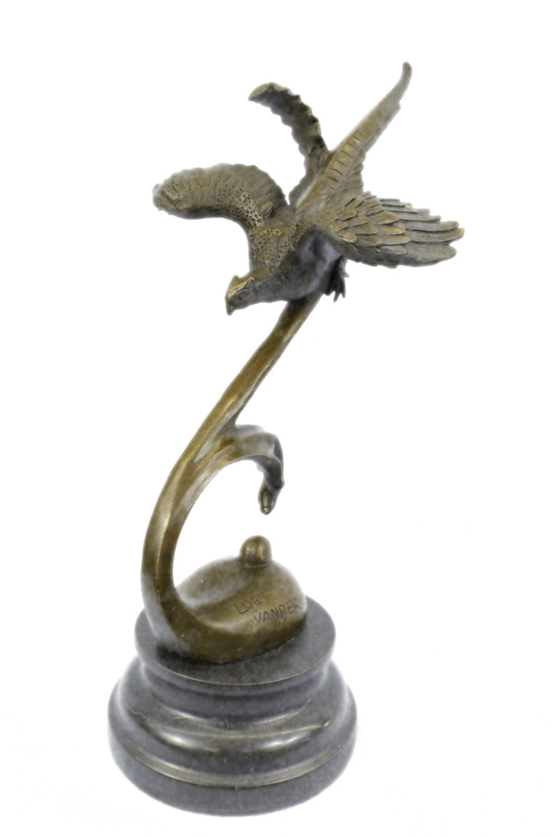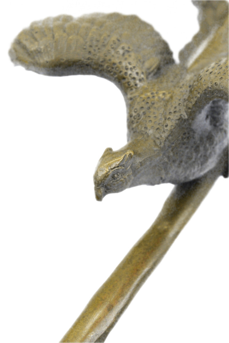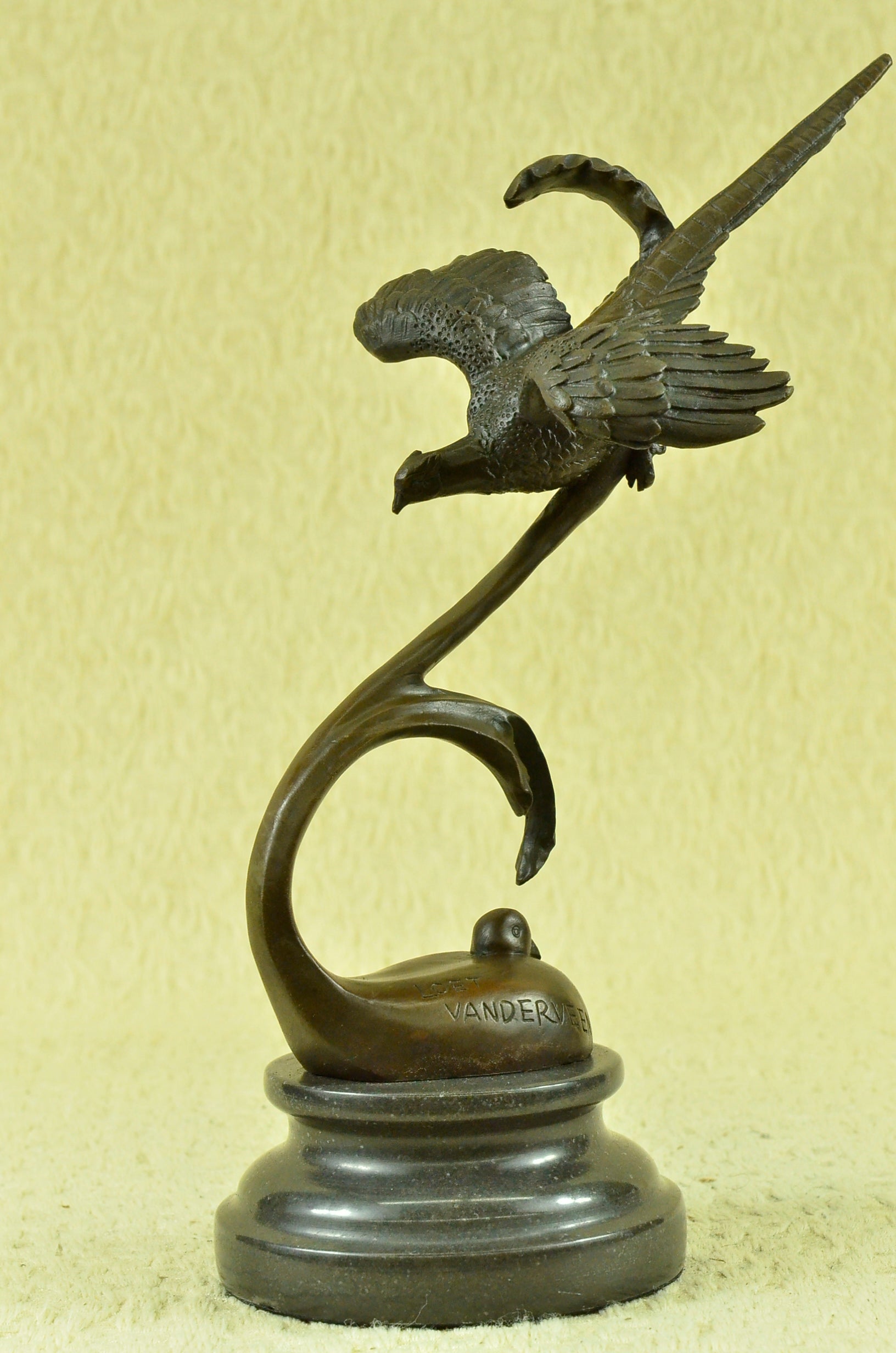 Are these two birds from different worlds star-crossed lovers? A pheasant and dove, an unusual match, connect. The dove sits below with its long tail feather curving over head. The soaring pheasant soars and comes in for a landing on the dove`s extended tail feather. 100% bronze and handmade, this brown patina sculpture was cast using the "Lost Wax Method" and mounted on a black marble base. It features the signatureOriginal or Reproduction: Reproduction
