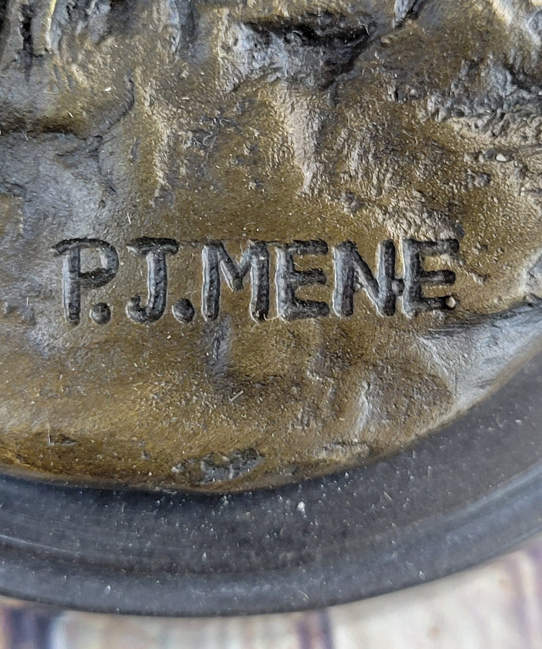 The artists and craftsmen of the Thinkbronze.com gallery are proud to present this beautiful piece of artwork signed by P.J. Mene. It is sculpted and cast in our own foundries in Europe, each piece is meticulously hand finished by our own patina artists. Using the hot patina technique, the same method used in works found in the finest art museums, our patina artists first apply a cold chemical patina to the lost wax cast sculpture. Artists then use blow torches to heat the solid bronze sculpture upwards of 250 degrees. While the metal is hot, proprietary formulations of chemicals are applied using various techniques section by section, one layer at a time. Many layers and several hours later, the piece is allowed to cool, and several layers of special wax are applied. The result is a spectacular, deep and transparent finish with complex subtleties that no other finishing method can achieve. Because every piece is finished individually by hand, no two pieces are ever exactly alike. Each unique piece of art is signed, hallmarked and mounted on a genuine marble base. The finished sculptures are truly a handmade heirloom to be cherished for generations and admired by all.Bronze Dimensions with Marble Base: Height 14" X Width 17"