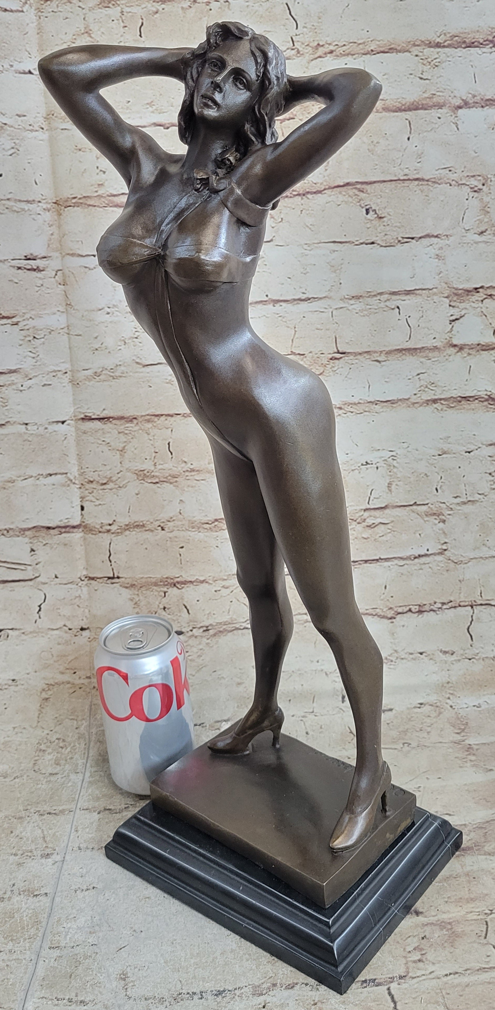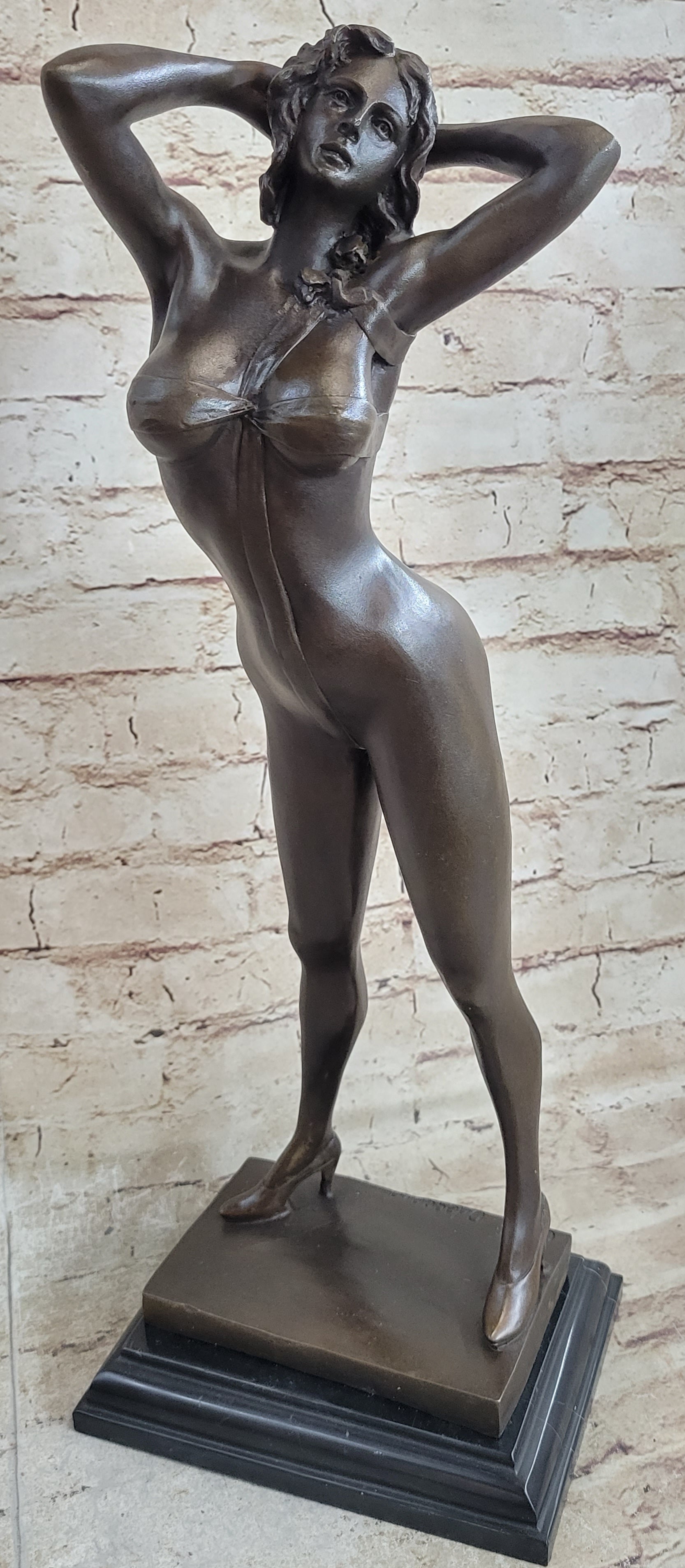 Indulge in the allure of this captivating bronze sculpture, paying homage to the unapologetic confidence of 1940s and 1950s pinup models. With an embrace of her curves and a bold demeanor, this figure embodies the essence of a real woman. Her voluptuous hips, curvy thighs, and ample breasts harken back to an era of timeless beauty and self-assuredness. A true symbol of empowerment, she stands as a tribute to the genuine desires of a discerning man.