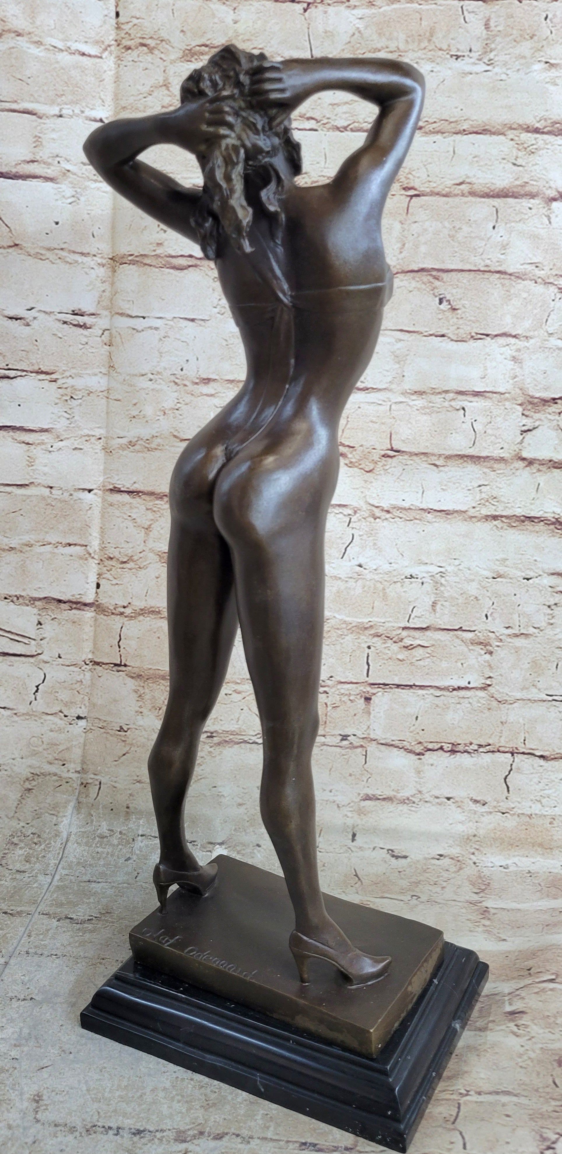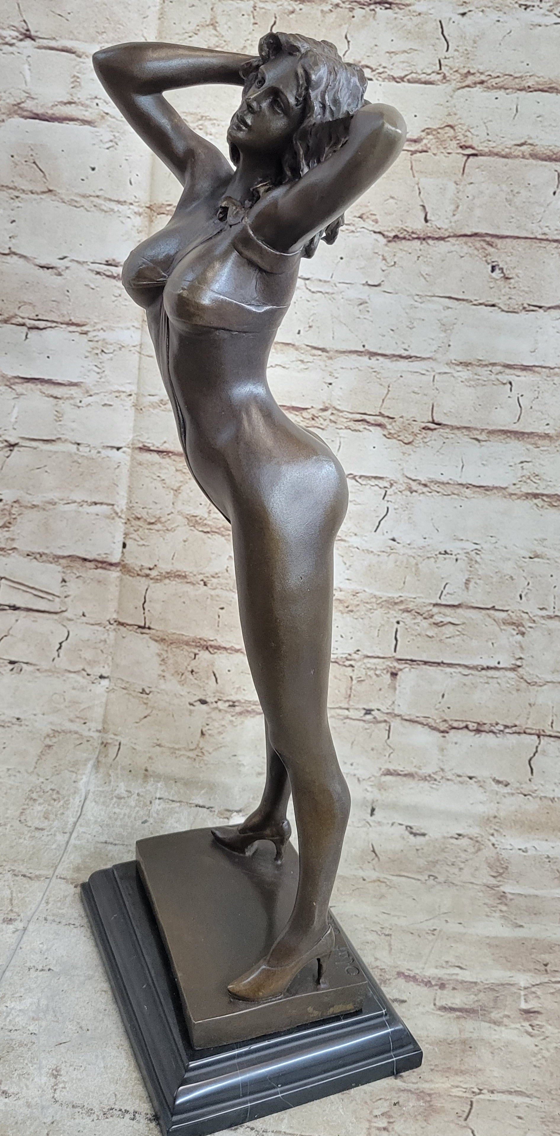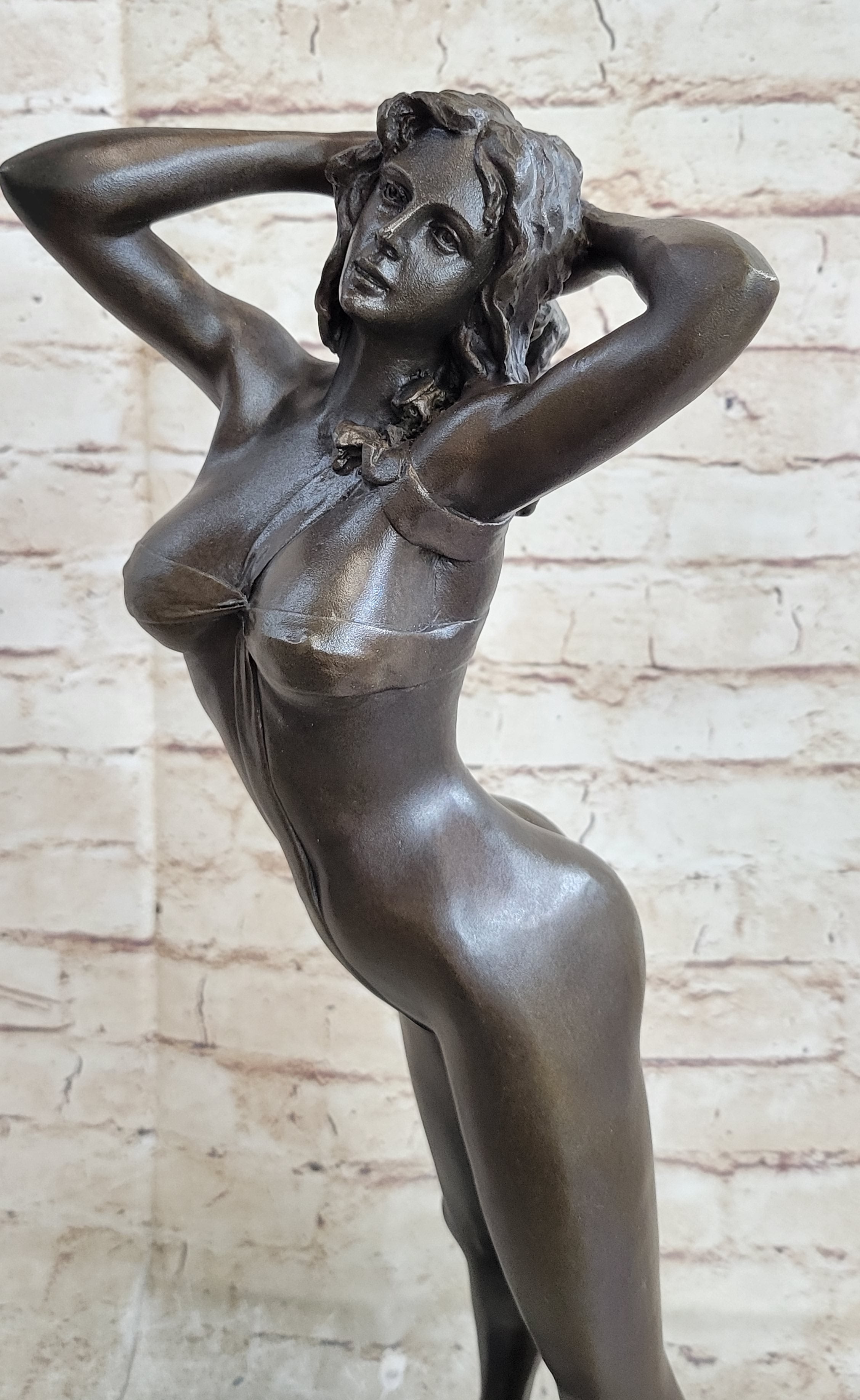 Exuding a timeless elegance, this sculpture captures a singular moment suspended in artistry. Her graceful arms stretch upward, fingers weaving through her hair, while her head tilts back in a seductive pose. The rich brown patina adds depth and dimension, accentuating the intricacies of the sculpture's textures. Meticulously crafted through the revered "Lost Wax Method," this piece embodies the dedication and skill of a master artist.
