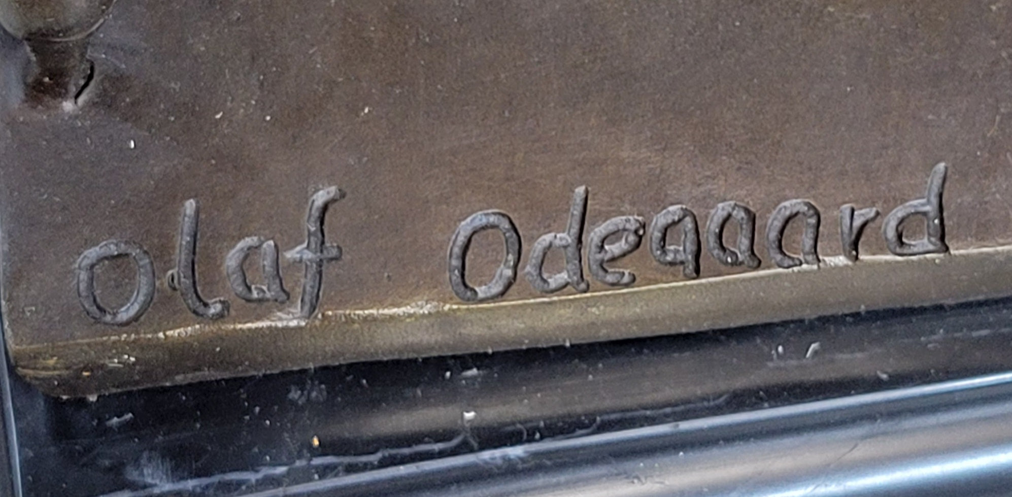 The esteemed creator, Olaf Odegaard, has masterfully materialized this vision. An artist with a profound connection to both theatre and art, his passion resonates through his creations. Fashioned entirely from bronze, this sculpture is a testament to Odegaard's reverence for the male form. It captures the essence of power, sensuality, and the intimate connection between men. Impeccably detailed and signed by the artist himself, this piece stands as a remarkable embodiment of beauty and desire.Bronze Dimensions with Marble Base: Height 21" X Width 7.5"