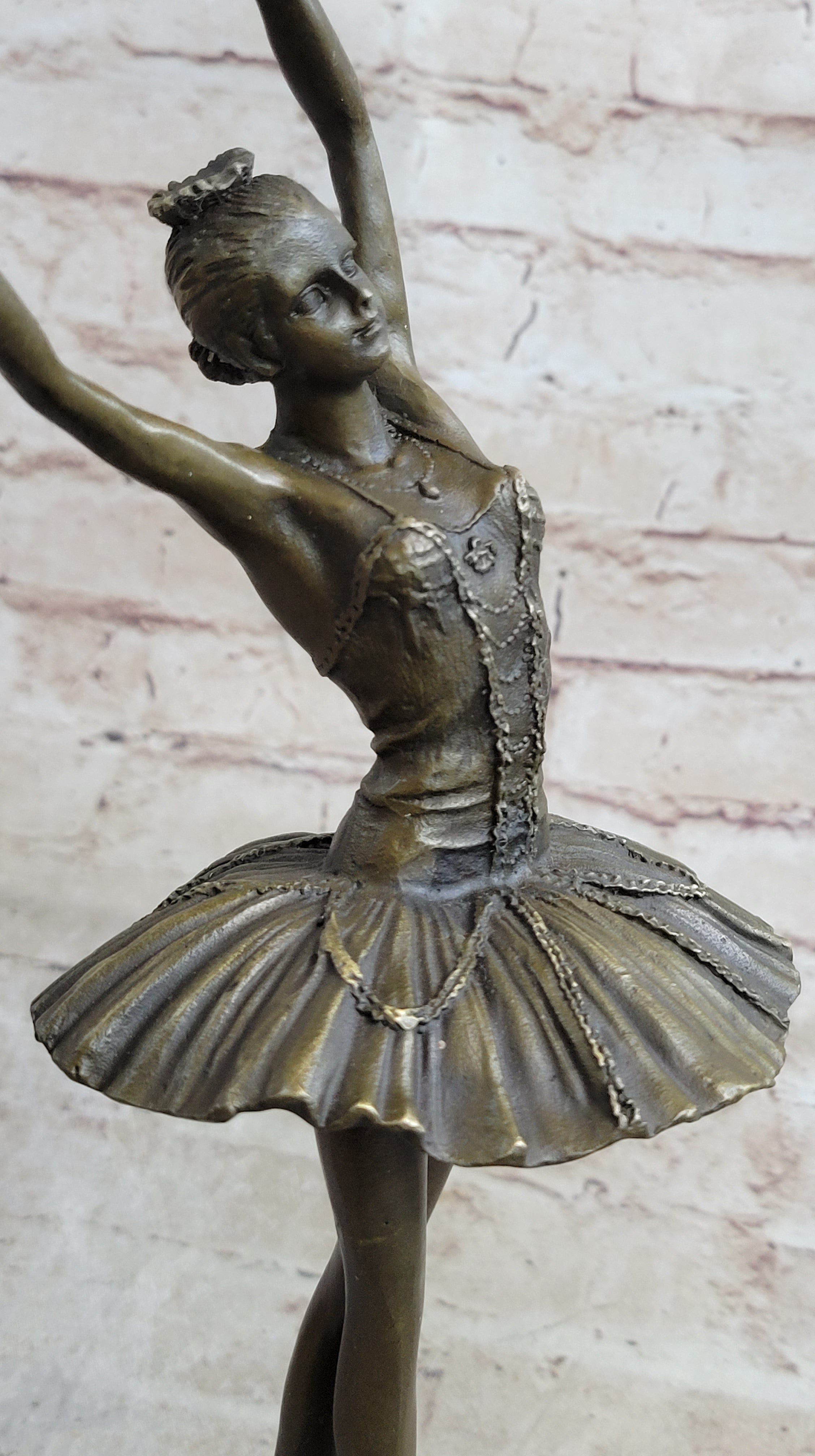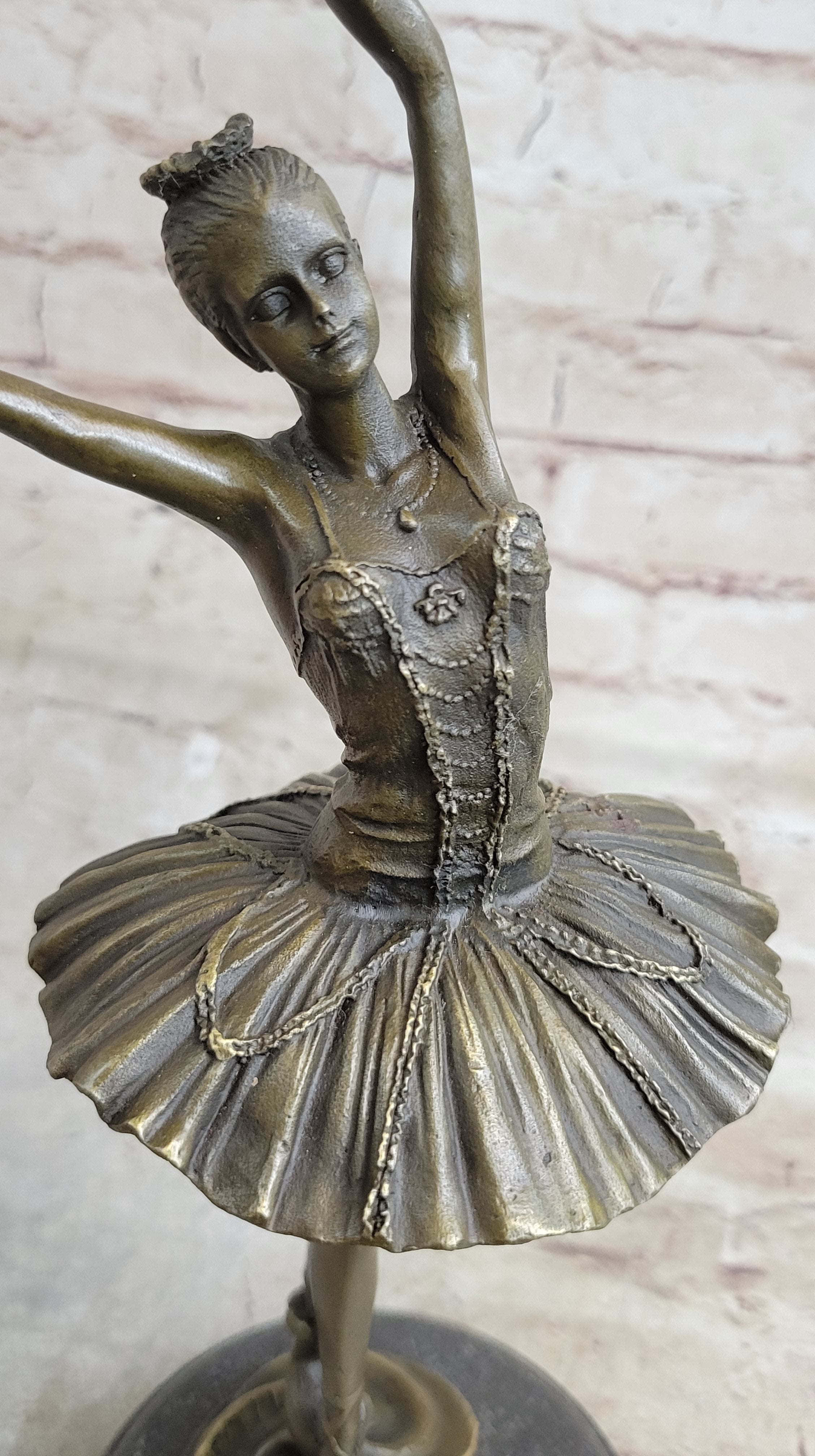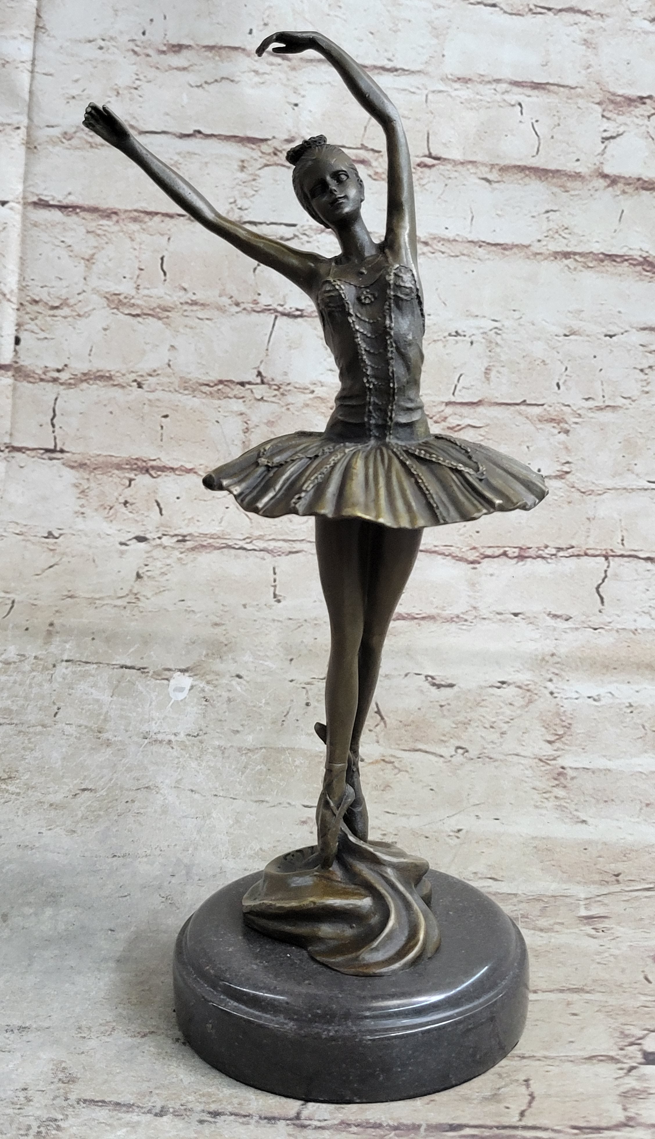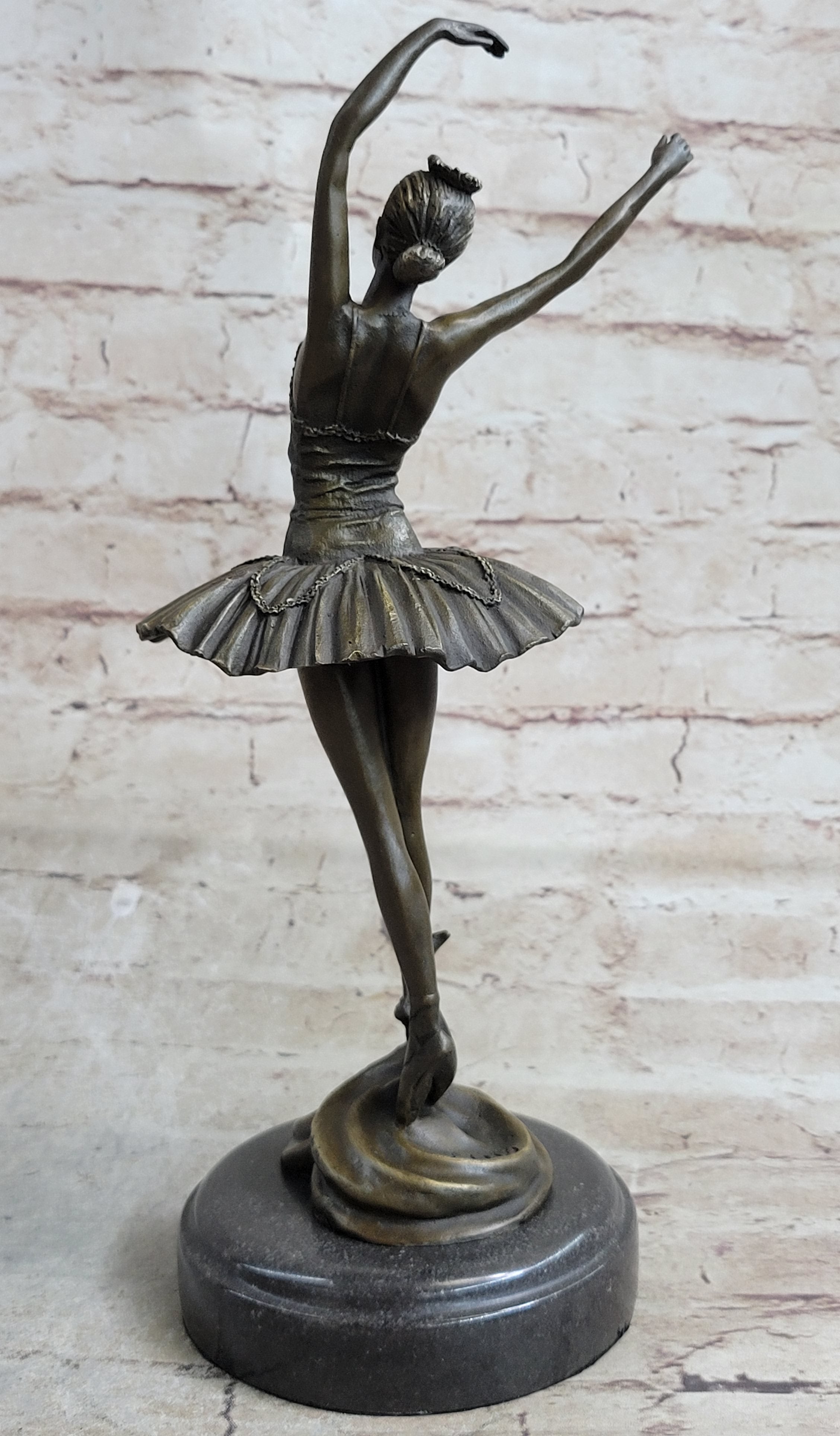Witness the grace and elegance of a prima ballerina as she takes center stage in this breathtaking bronze sculpture. Every detail of her performance is meticulously captured, from the extension of her long leg to the arching of her spine. Her poised and delicate movements convey her mastery of the art of ballet, showcasing her agility, balance, and flexibility. Crafted with utmost skill and precision, this bronze sculpture is a true work of art. The artist has employed the timeless "Lost Wax Method" to ensure the highest level of quality and detail. The sculpture features a stunning brown patina finish that enhances its beauty and adds depth to its form. Mounted on a sleek black marble base, it becomes a striking focal point in any setting. Created by the acclaimed artist Milo, this sculpture bears his signature as a testament to its authenticity and craftsmanship. It is a remarkable piece that celebrates the artistry and dedication of ballet dancers. Whether displayed in a dance studio, art collection, or as a statement piece in your home, this bronze figurine captures the essence of the prima ballerina, radiating beauty and grace.