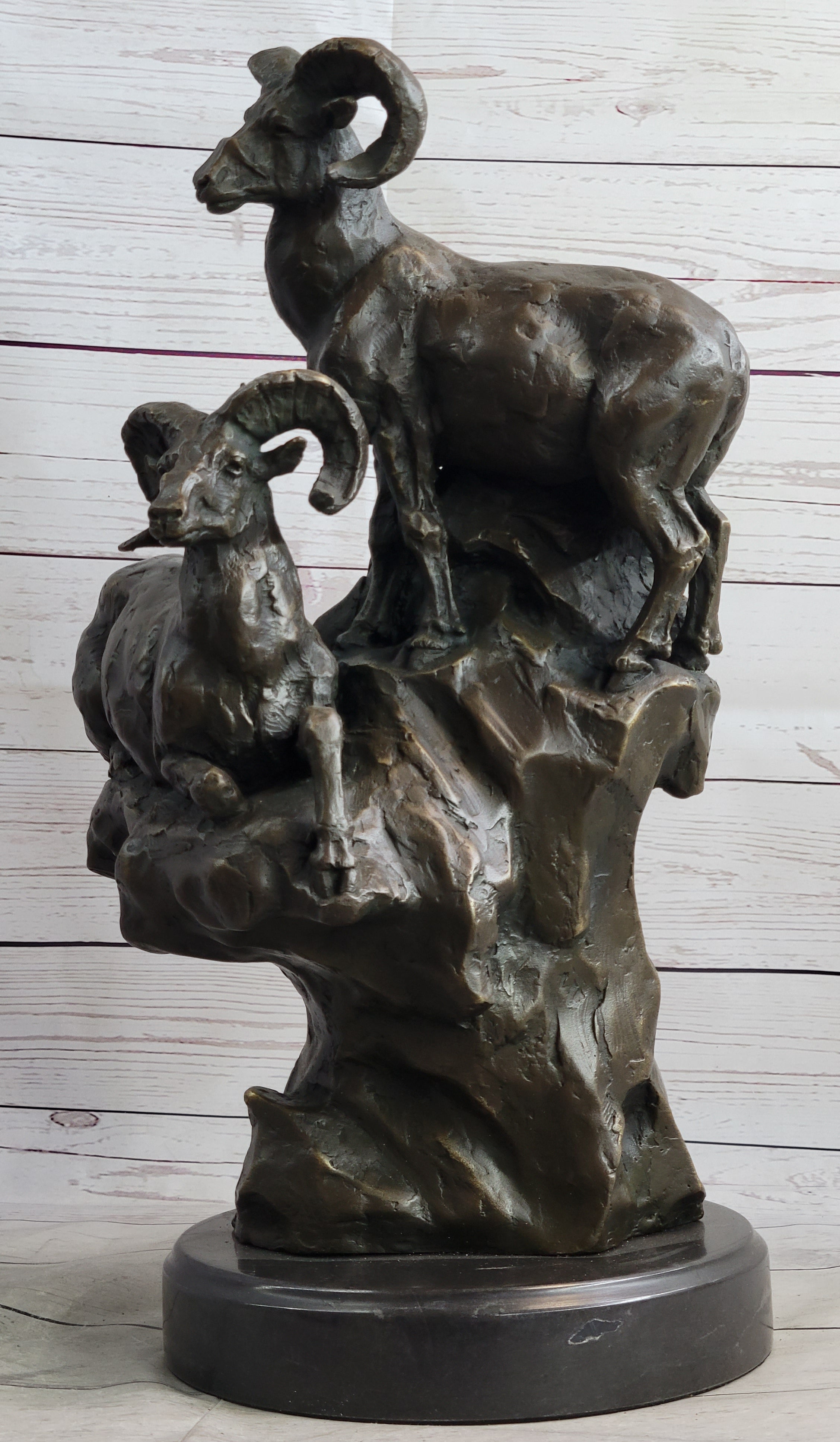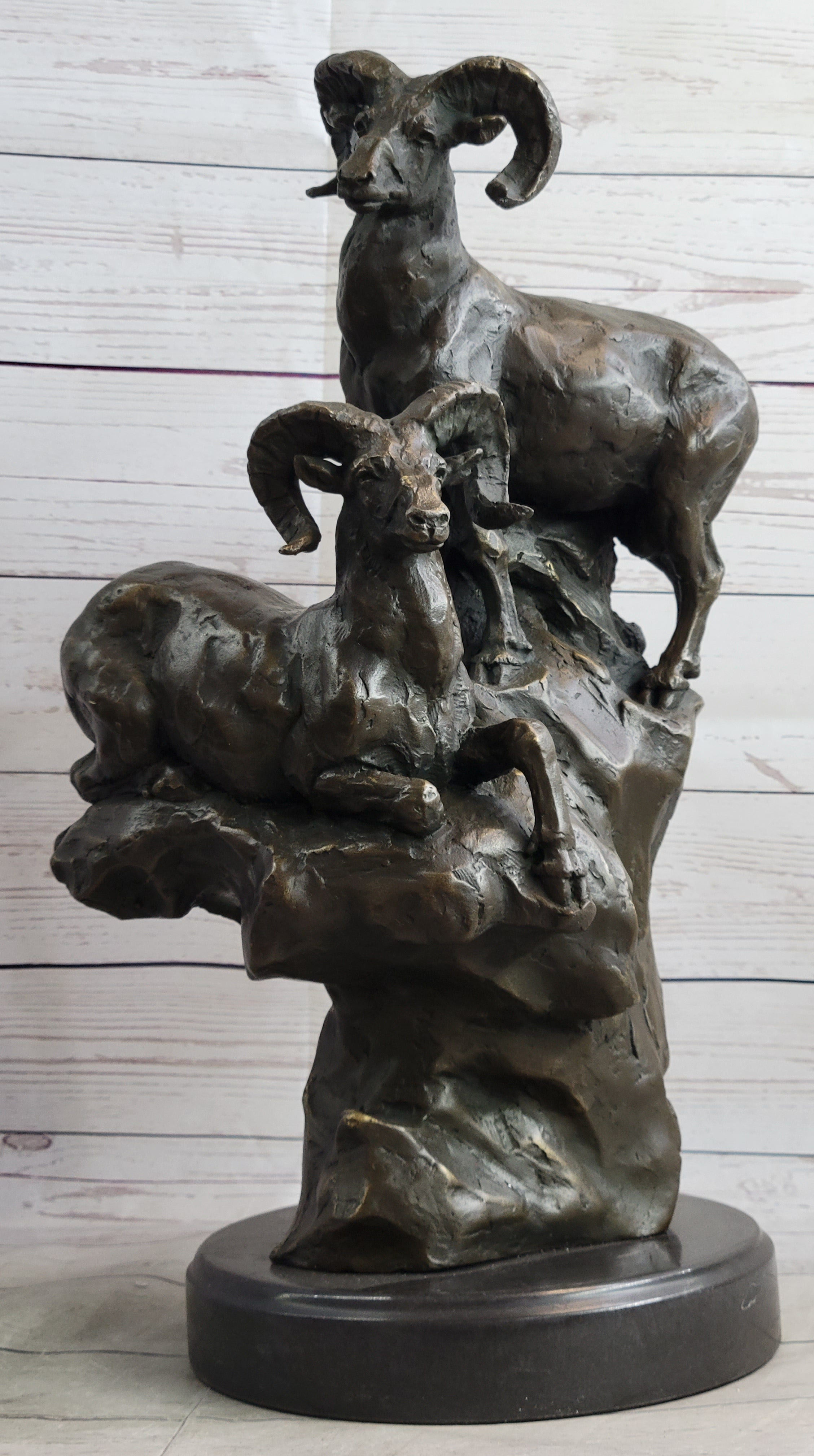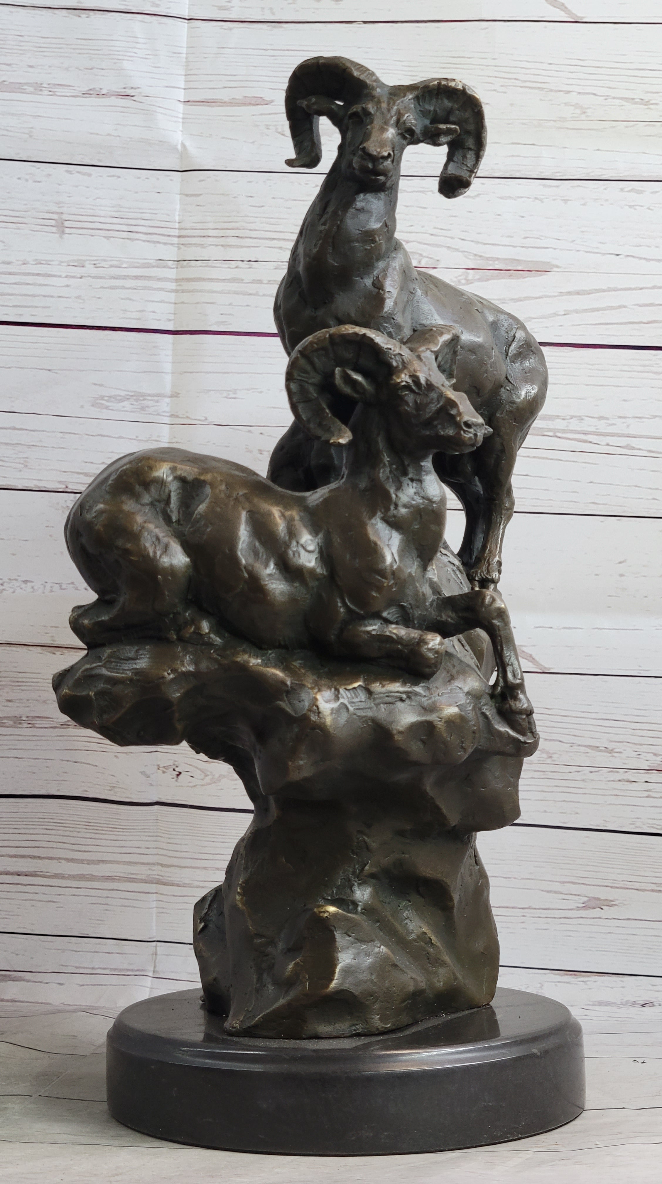 Rams Goats on Rocks Bronze Sculpture Statue Wildlife Art Decor on Marble Base