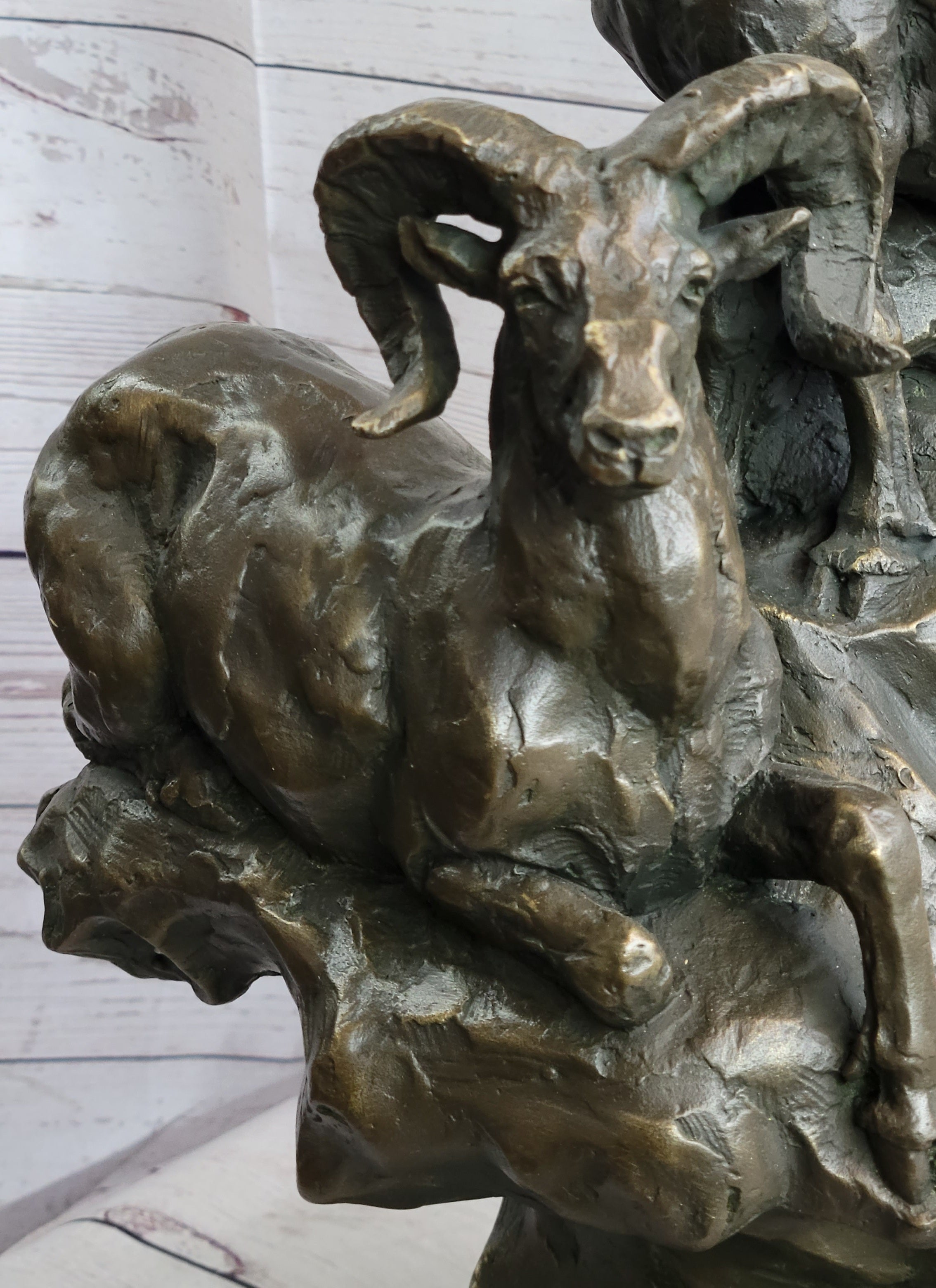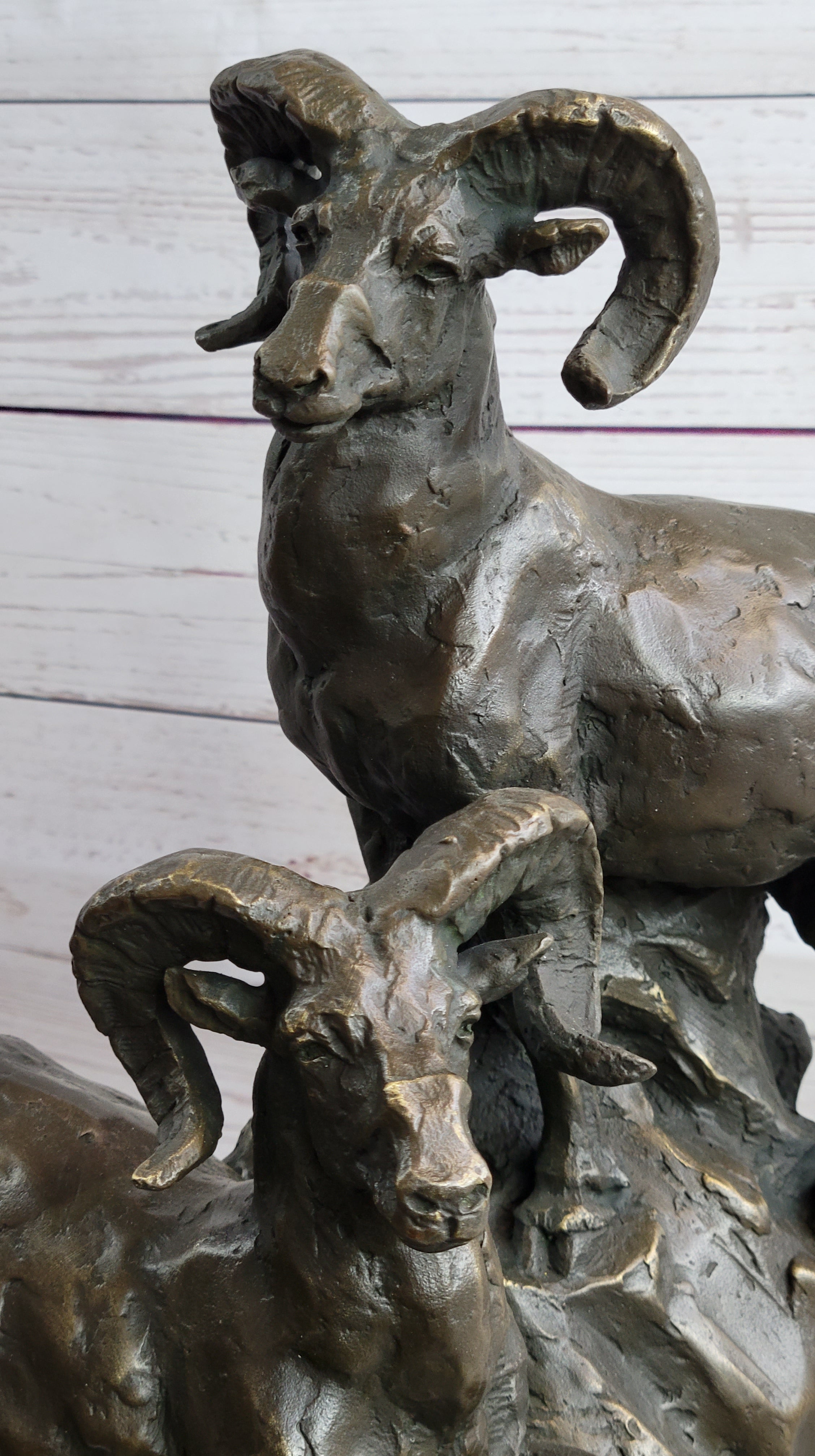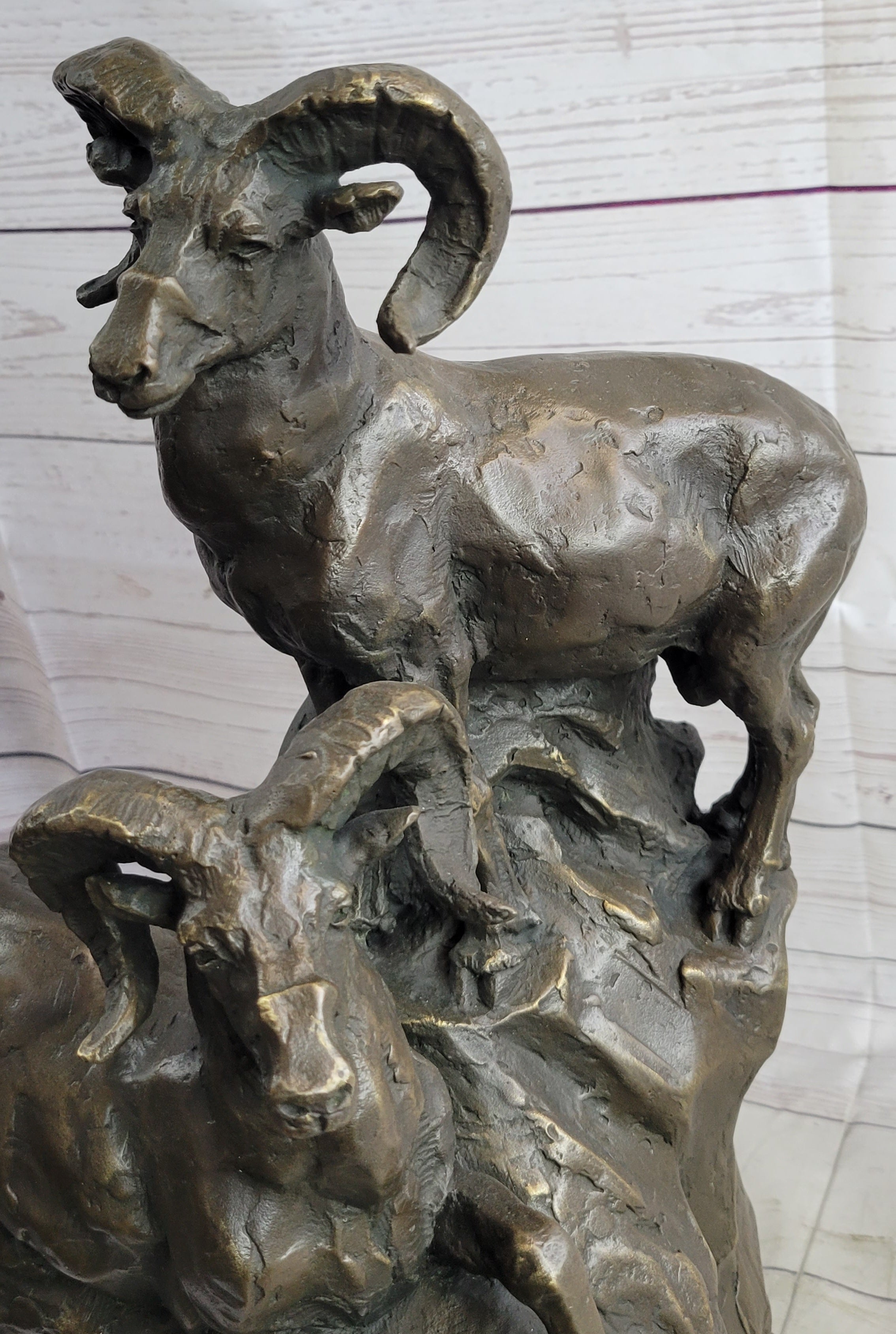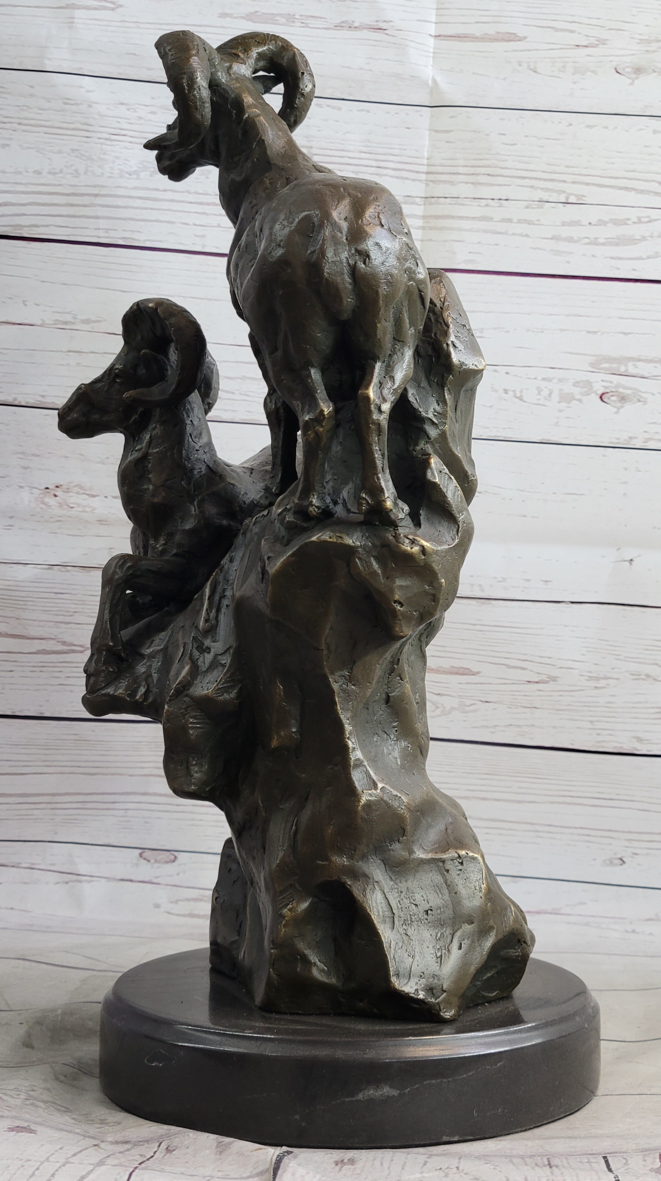 Rams Goats on Rocks Bronze Sculpture Statue Wildlife Art Decor on Marble Base