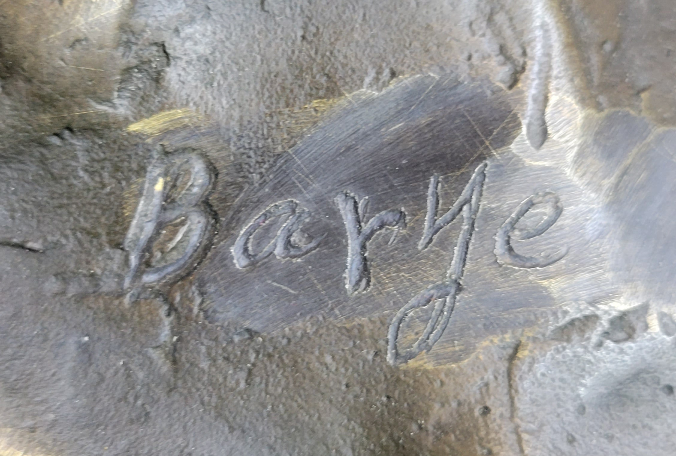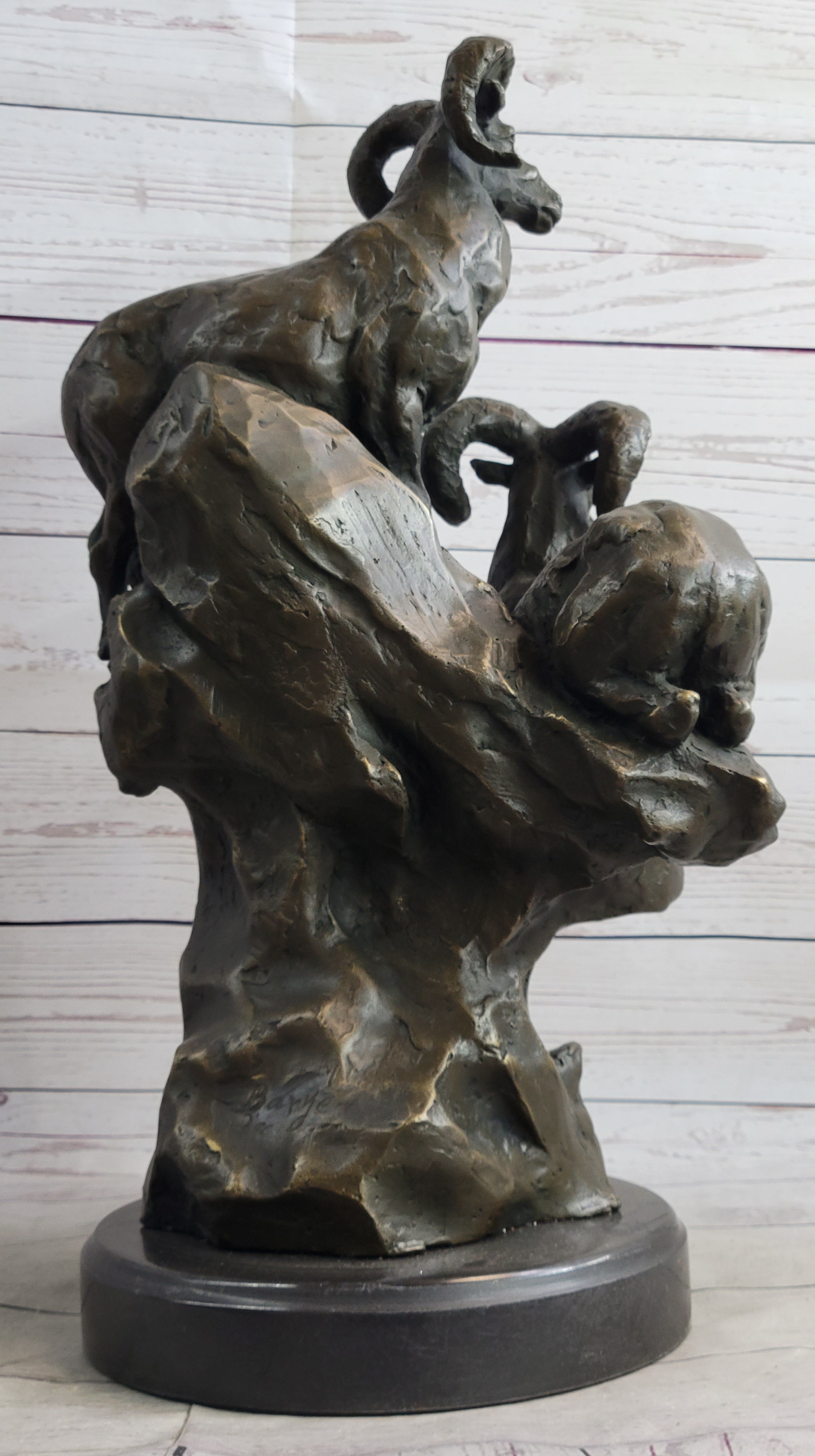 Set upon a sleek and sturdy circular black marble base, this striking bronze sculpture serves as a testament to the artist's mastery and creative vision, offering a compelling fusion of artistic expression and reverence for the natural world. With the artist Barye's signature adding a touch of quality, this sculpture invites viewers to immerse themselves in the enchanting ambiance of the mountainous terrain, where the noble rams reign supreme, embodying a sense of resilience, freedom, and unwavering strength that captivates the imagination and inspires a profound appreciation for the wonders of the animal kingdom.Bronze Dimensions with Marble Base: Height 19" X Width 12"