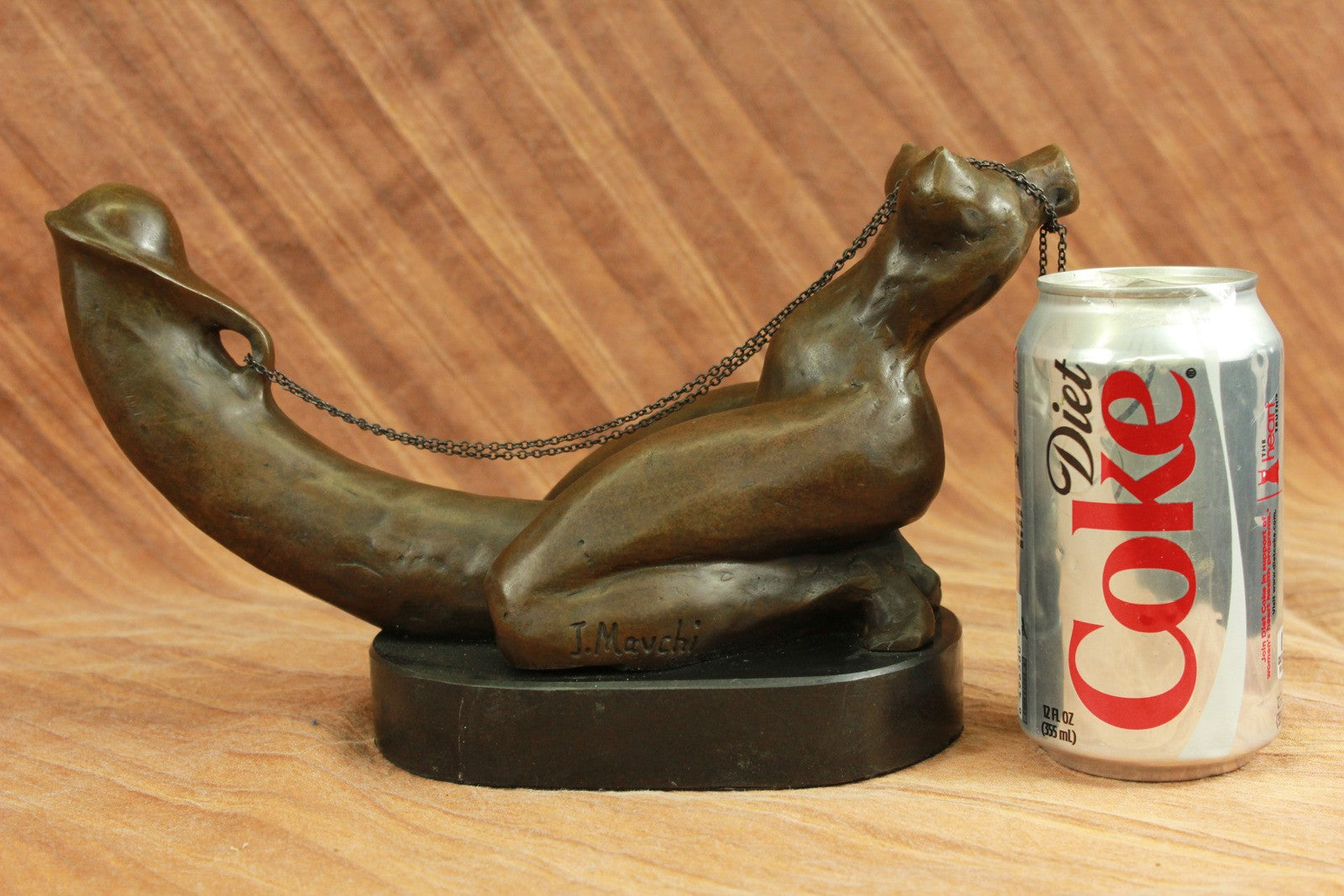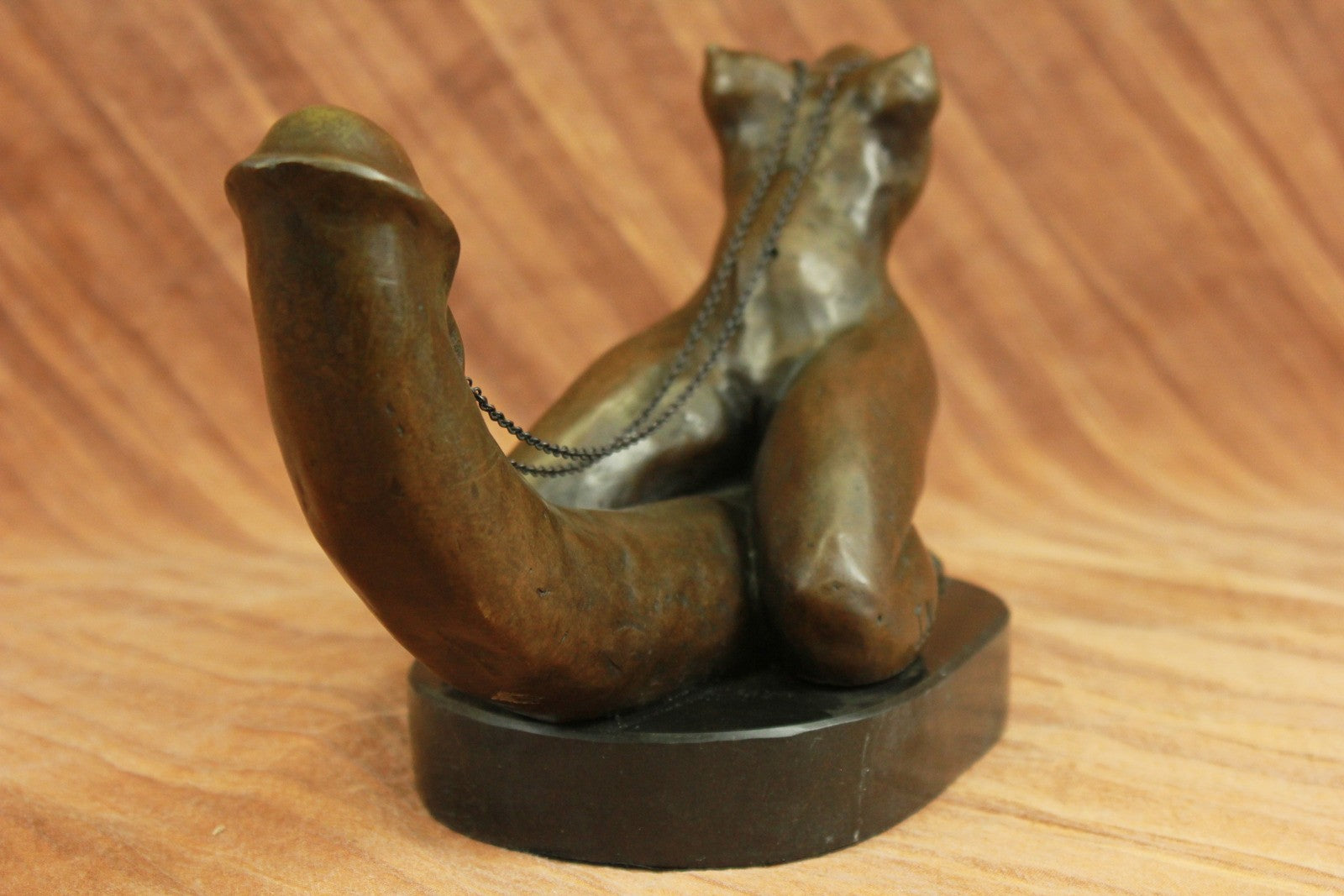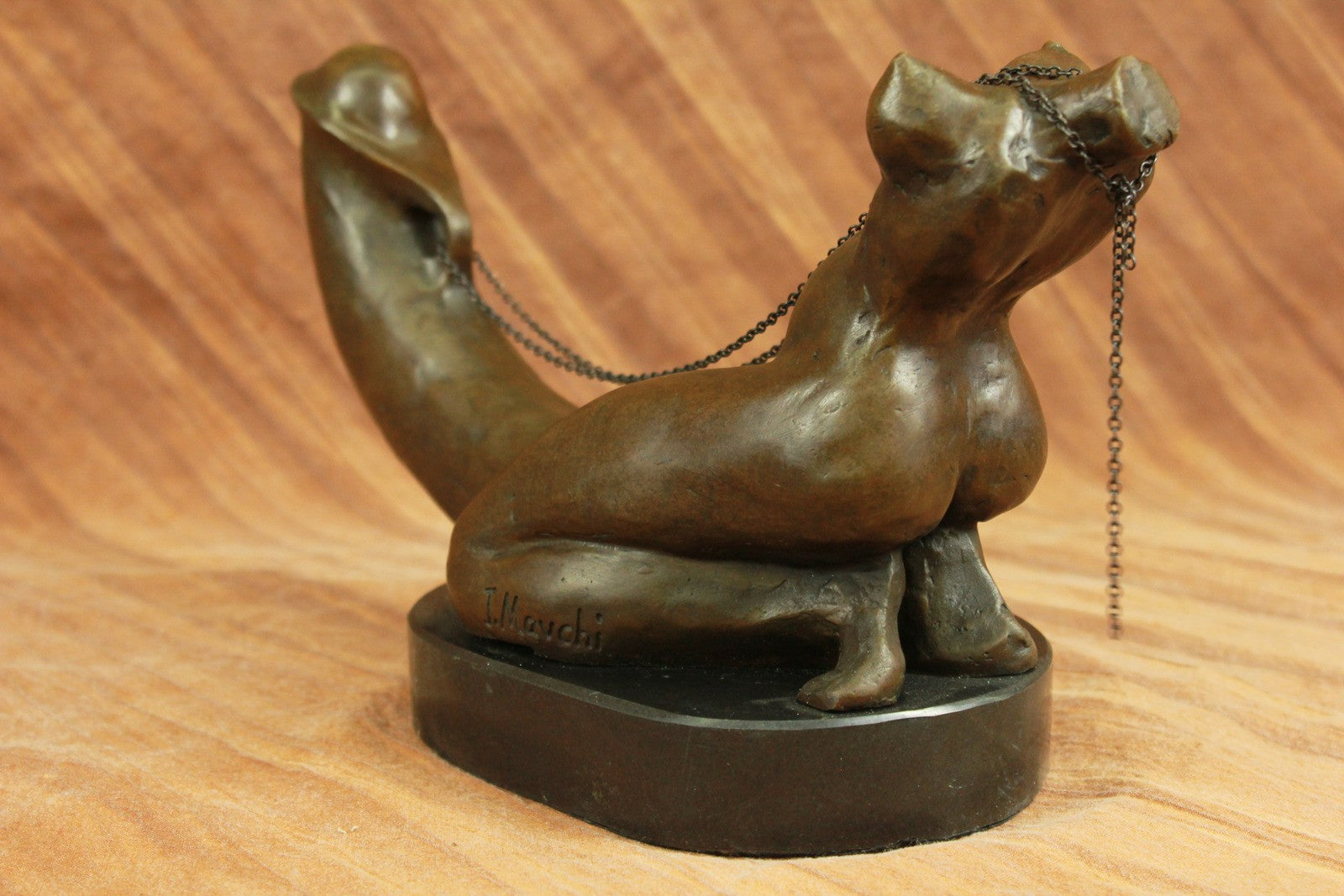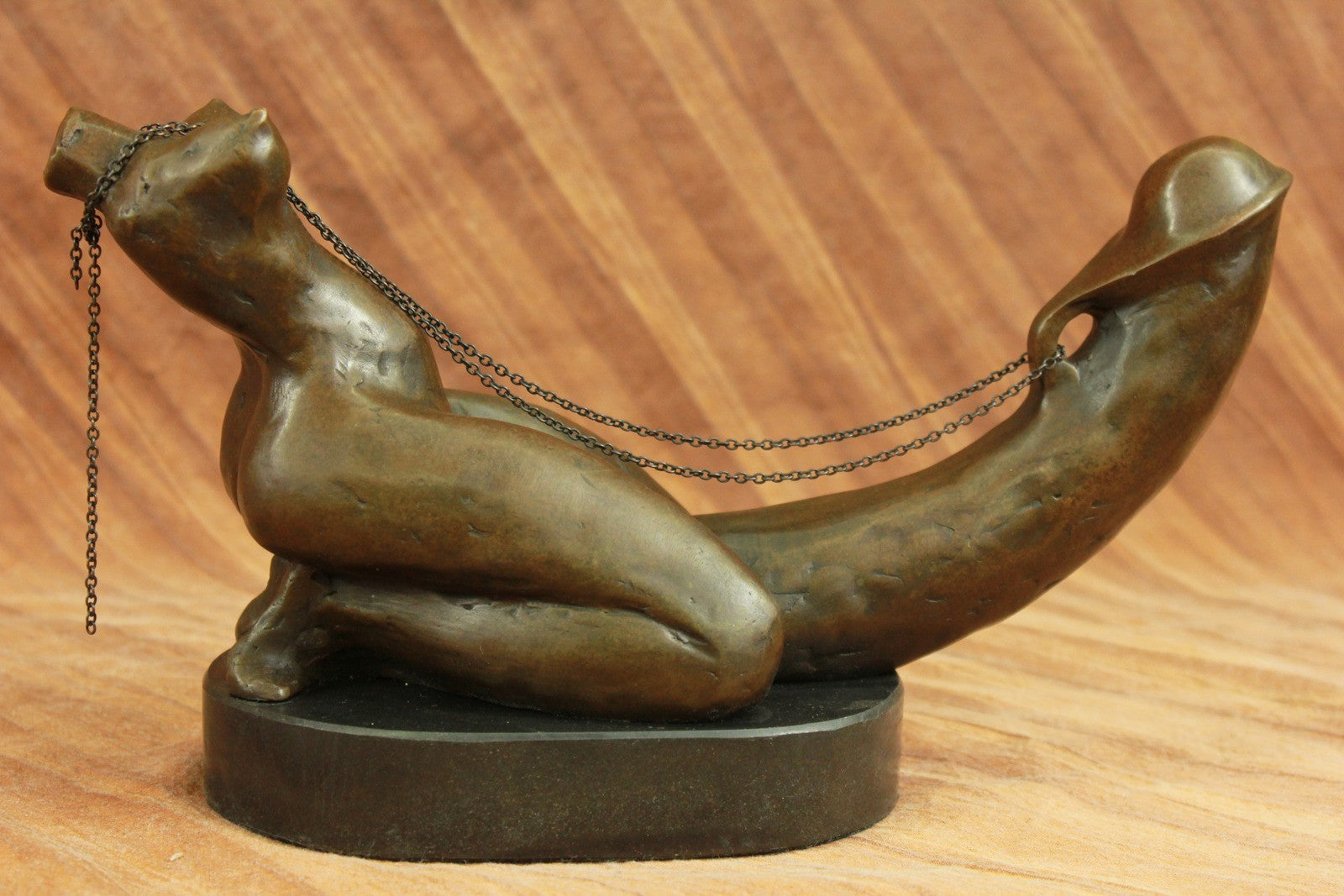 A woman`s erotic fantasy comes to life as she rides that there is no tomorrow. With the lust of a man but intense desire of a woman, a young woman embraces a penis lovingly. Her body molds perfectly against it as she rides around the shaft and hugs it like she would her own lover. Her back arches and she pokes her butt out as she kneels. This handmade 100% bronze sculpture is in a grey patina and was cast using the "Lost Wax Method" with careful attention paid to details and is signed by artist Mavchi.Bronze Dimensions with Marble Base:Height 6.5" x Width 12"