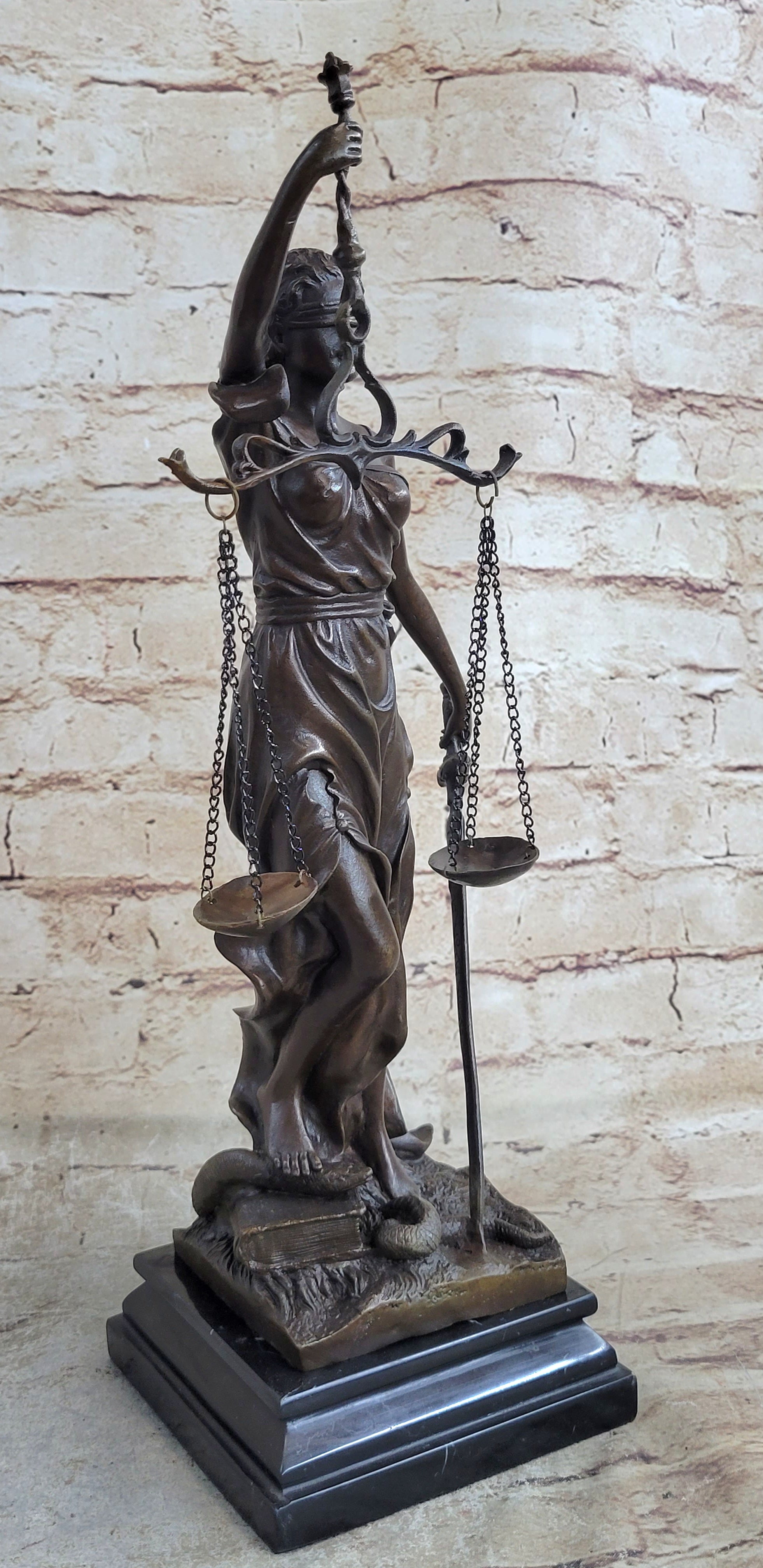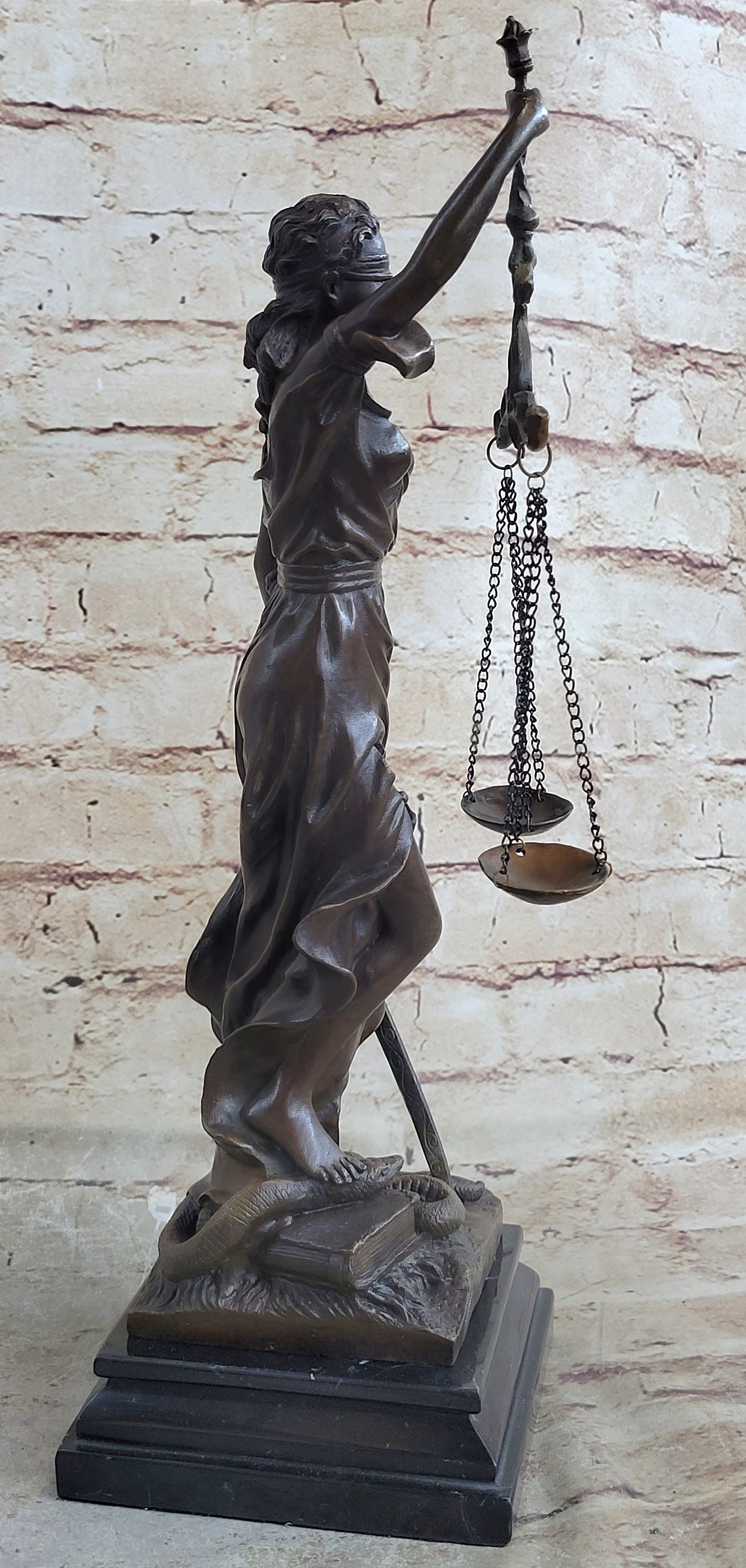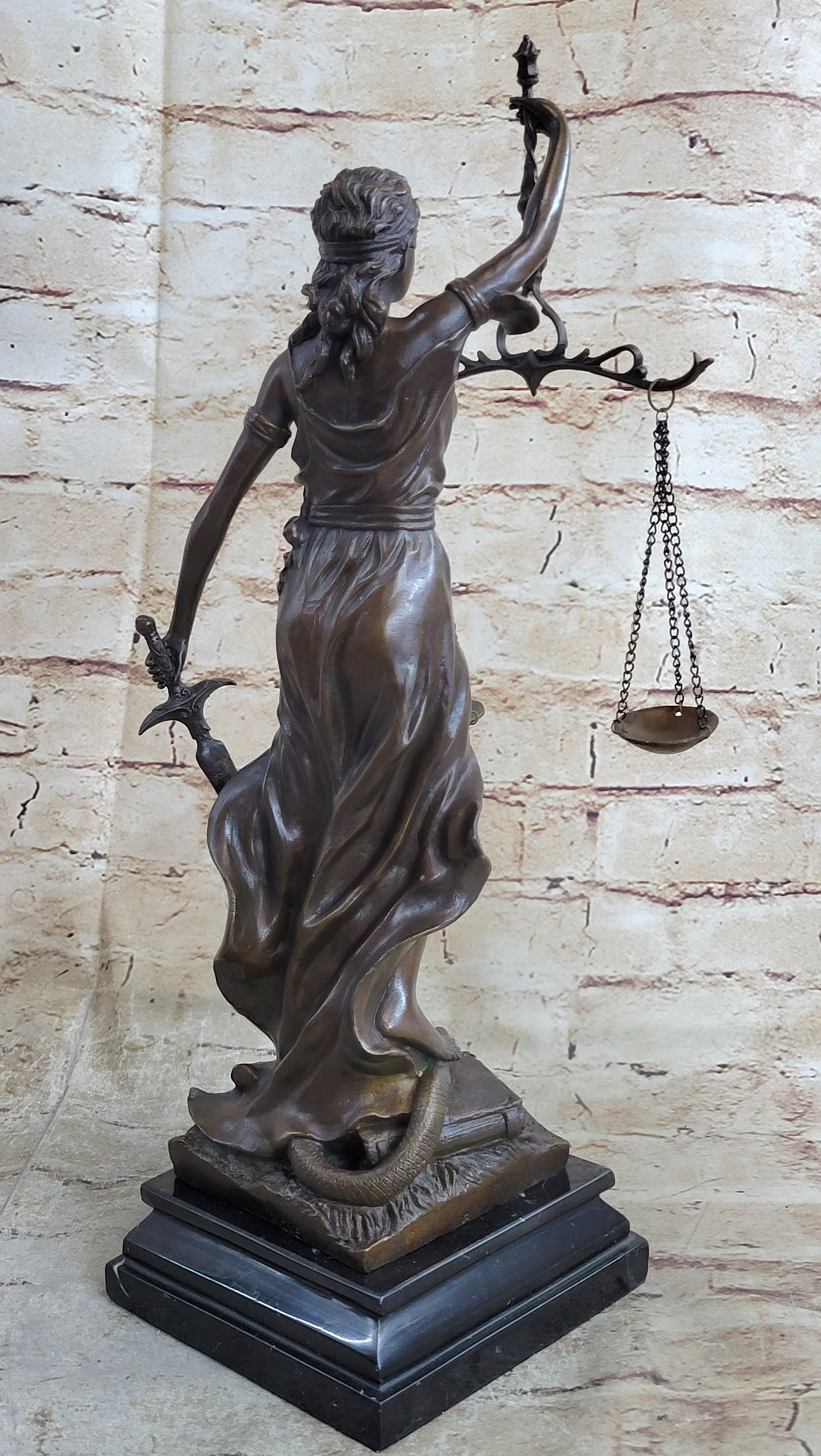 Lady Justice and Blind Justice are the names associated with the feminine image Themis, the goddess of Greek Mythology epitomizing the virtue of Justice. She holds the "Sword of Truth" in one hand to represent power and lifts her scales in the other, displaying impartiality. She is blindfolded to assure fairness in judgment, which calls to the old sacred ideals of law practices. She stands barefoot on the book of law, while a snake coils at her feet. She is a brown patina but her dress is a blueberry blue and her blindfold and sash are yellow. This would make a great inspiring gift for lawyers, judges, anyone who aspires to work in law. 100% bronze and handmade, this sculpture was cast using the "Lost Wax Method" and mounted on a black marble base and is signed Mayer.Bronze Dimensions with Marble Base: Height 15" x Width 10"