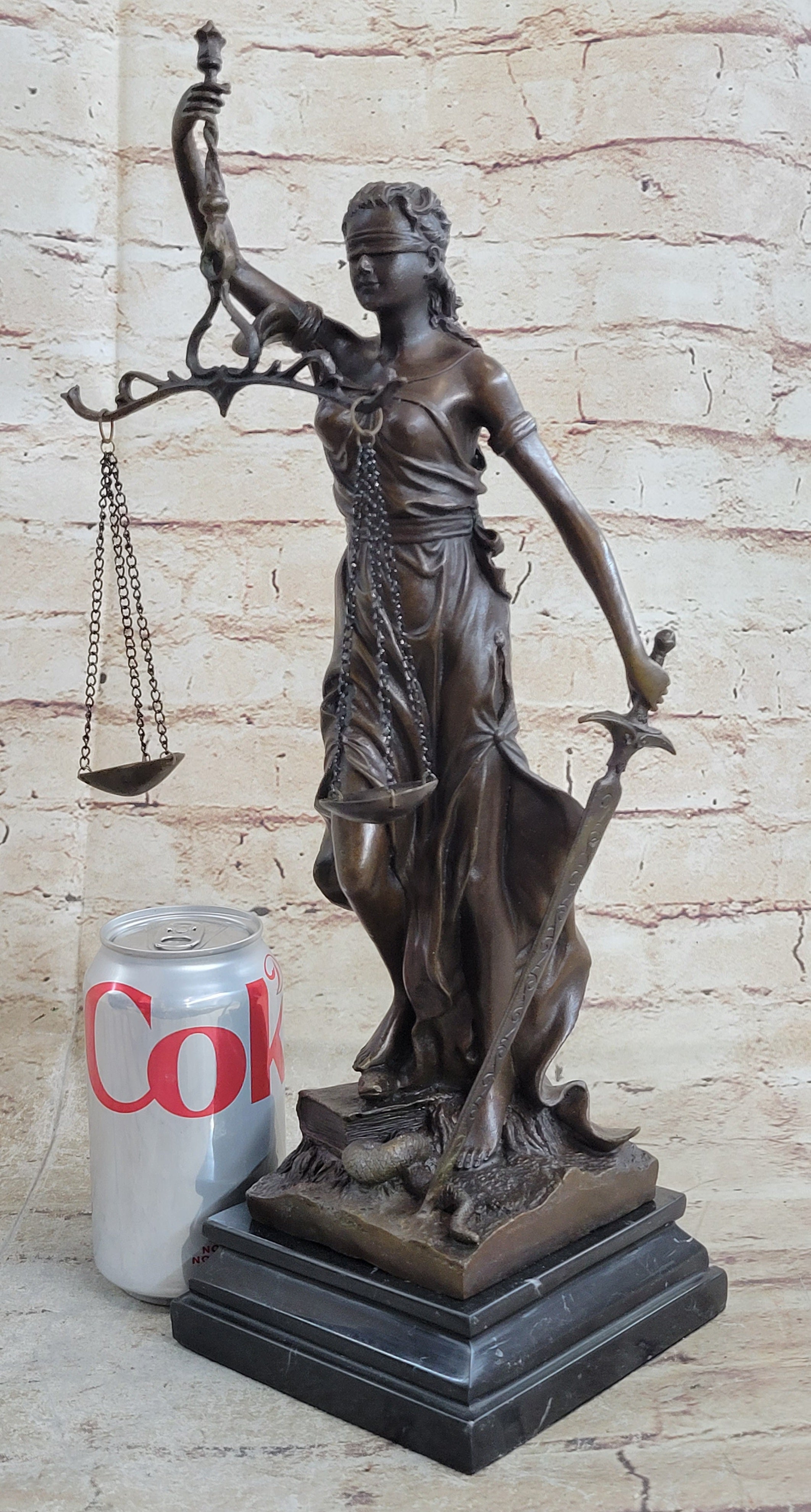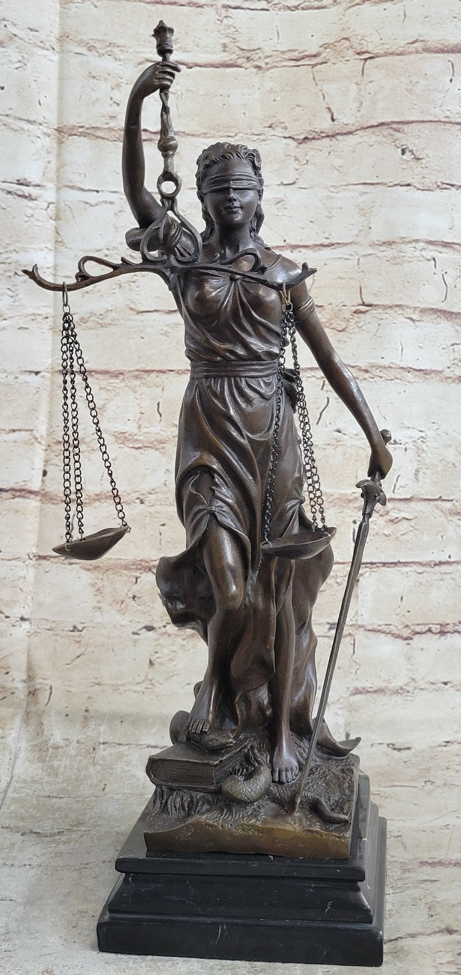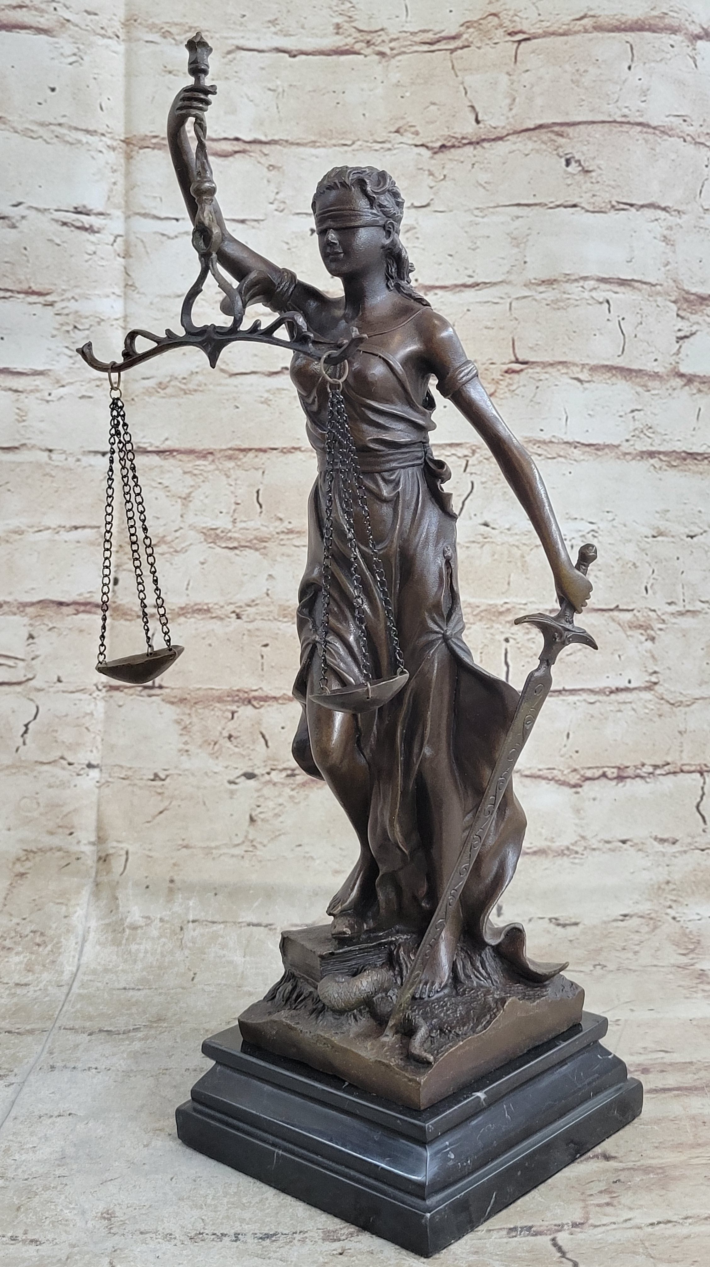 Lady Justice and Blind Justice are the names associated with the feminine image Themis, the goddess of Greek Mythology epitomizing the virtue of Justice. She holds the "Sword of Truth" in one hand to represent power and lifts her scales in the other, displaying impartiality. She is blindfolded to assure fairness in judgment, which calls to the old sacred ideals of law practices. She stands barefoot on the book of law, while a snake coils at her feet. She is a brown patina but her dress is a blueberry blue and her blindfold and sash are yellow. This would make a great inspiring gift for lawyers, judges, anyone who aspires to work in law. 100% bronze and handmade, this sculpture was cast using the "Lost Wax Method" and mounted on a black marble base and is signed Mayer.Bronze Dimensions with Marble Base: Height 15" x Width 10"