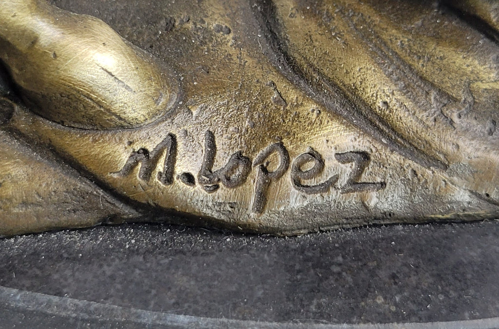 Crafted with meticulous attention to detail, this bronze sculpture is a testament to the skill and artistry of the artist, M. Lopez. The lost wax method, an ancient casting technique known for preserving intricate details, was employed in creating this masterpiece. The sculpture stands proudly atop a sleek black marble base, adding to its overall elegance and stability. Furthermore, it bears the artist's signature, solidifying its authenticity and value.