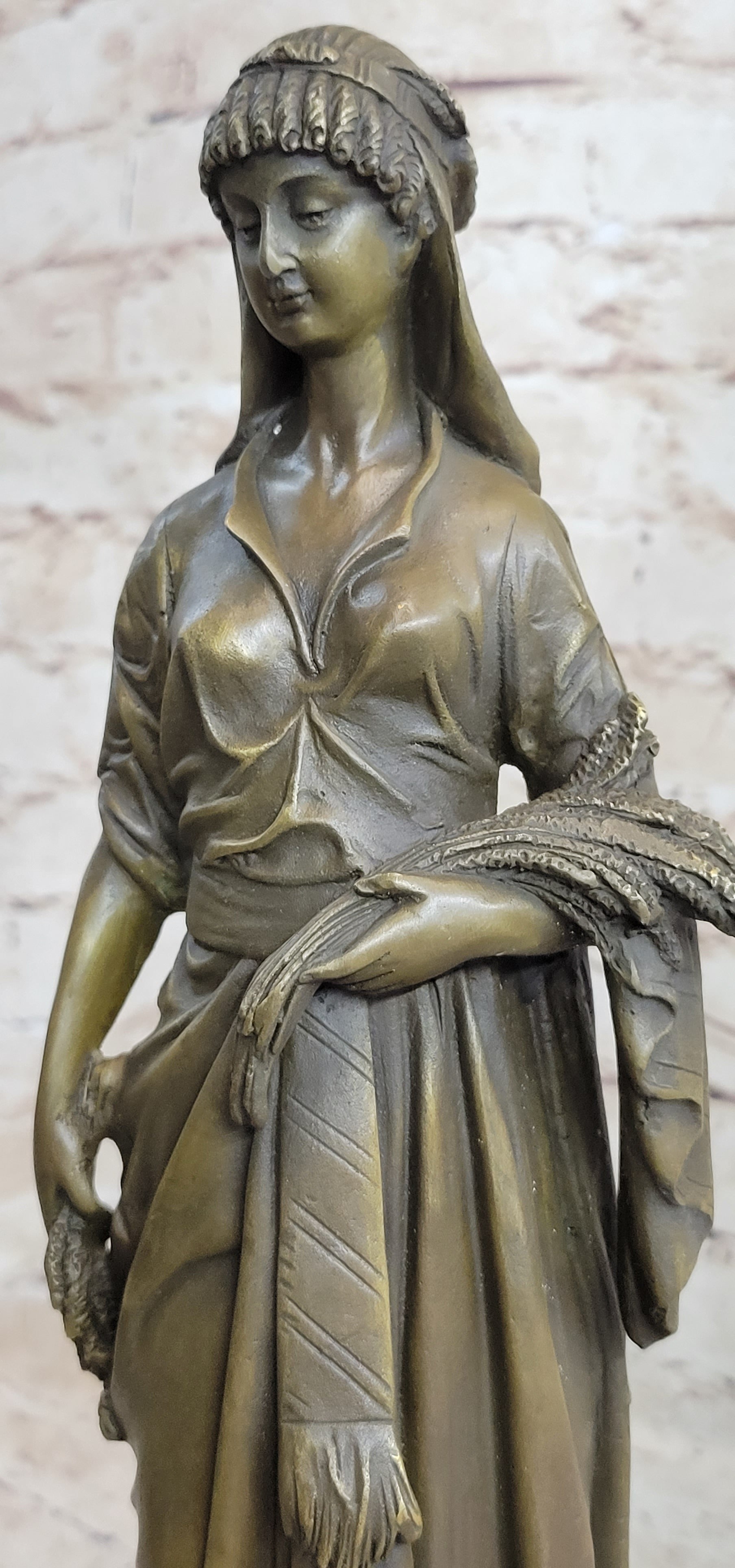 This exquisite bronze sculpture, created by the celebrated French artist Eutrope Bouret (1833-1906), captures a timeless moment of a woman gracefully gathering wheat. The intricate details meticulously sculpted into the bronze piece showcase the artist's mastery, making it a truly remarkable work of art.