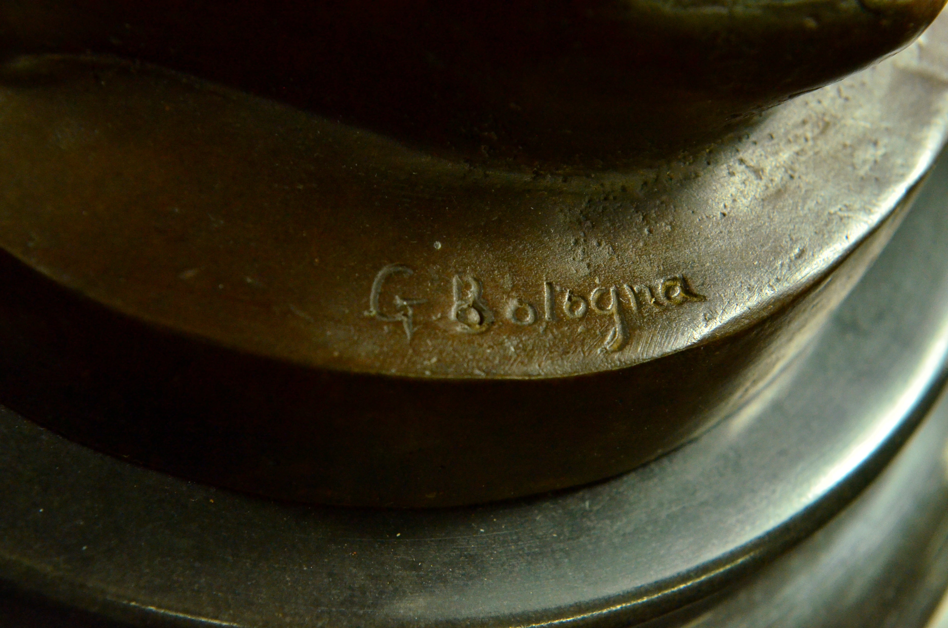 This is a bronze rendition of Roman mythological god Mercury. Mercury is seen seated among the billows of clouds hurriedly preparing himself for his celestial duty. The beholder witnesses him tying his divine gear to complete his charge of delivering messages from the gods, in swift flights, to and fro from earth and to the heavens. He wears the typical talaria which are winged sandals, made by the god Haphaestus, made of imperishable gold in which allows the god to fly as prompt as any bird. A petasos crowns his head which is a sun hat of Thessalian origin worn by the ancient Greeks. As a winged hat, it became the symbol of Mercury or his Greek correlative god, Hermes. Mercury is also considered the god of commerce, cunning, and invention. He was cast using the ancient method of lost-wax casting and stained with a brown patina finish for perpetuation. The sculpture is mounted upon a black marble base with the artist Giambologna`s signature.Bronze Dimensions with Marble Base:Height 19" x Width 8"