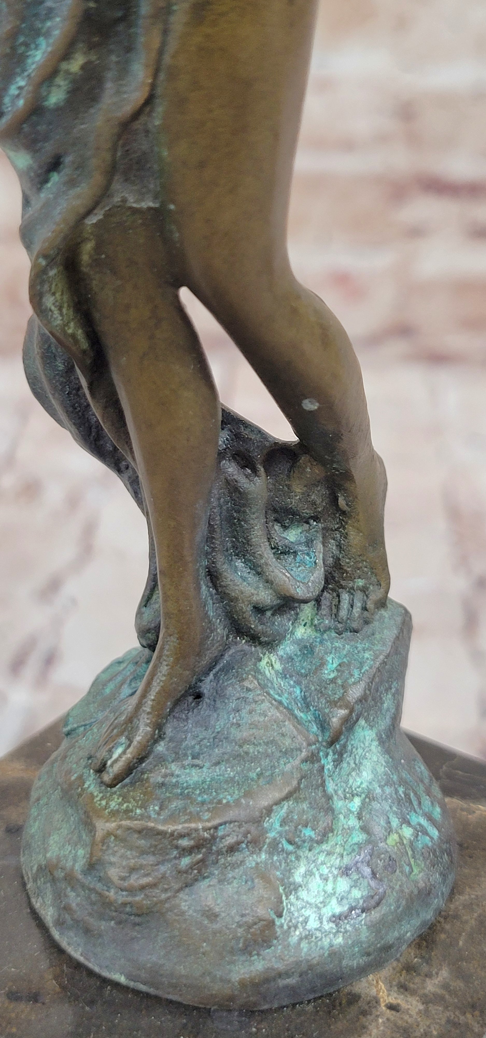 Finished with a two-tone green and brown patina, the sculpture achieves a striking contrast that enhances its visual appeal. The green and brown hues blend seamlessly, highlighting the exquisite details and contours of the figure. The patina not only adds depth to the piece but also ensures its preservation, maintaining its beauty for years to come.