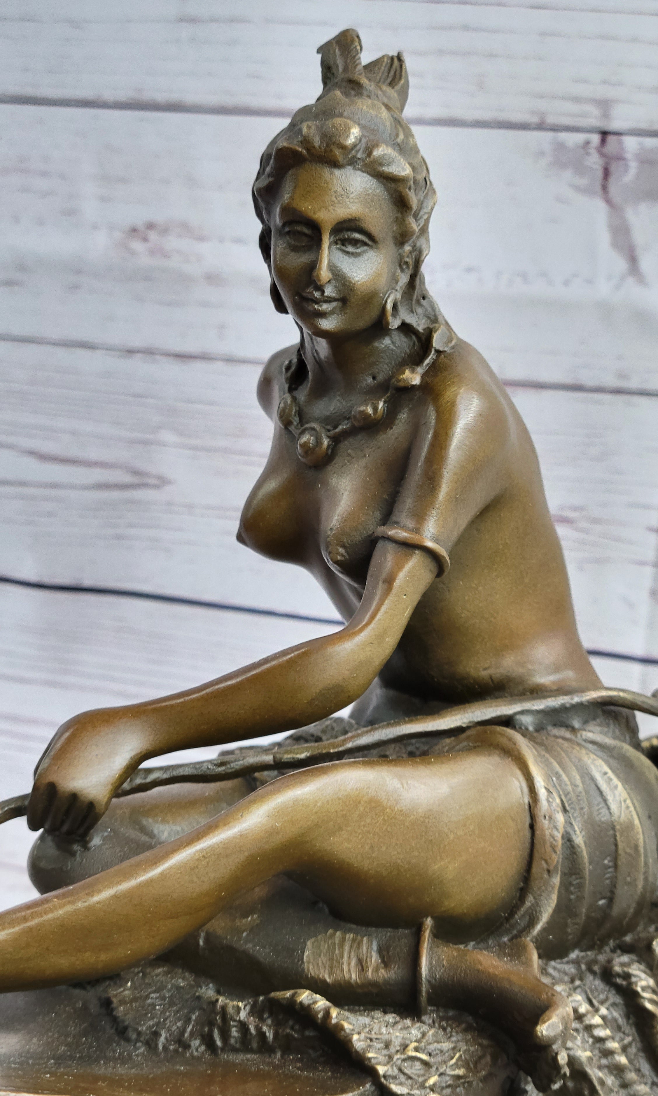 Semi Nude Topless Native American Girl in Canoe Boat Bronze Statue Sculpture Art
