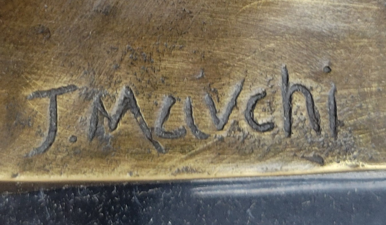 Crafted using the intricate "Lost Wax Method," this sculpture boasts a beautiful brown patina finish, adding depth and dimension to the artwork. It is elegantly mounted on a marble base, enhancing its visual appeal and stability. This piece is a testament to the diverse and boundary-pushing world of contemporary bronze art. It challenges conventions and invites viewers to explore its captivating aesthetic in a thought-provoking manner. Whether displayed in a private collection or a curated art space, it is sure to leave a lasting impression on those who encounter it.Bronze Dimensions with Marble Base: Height 13" X Width 5"